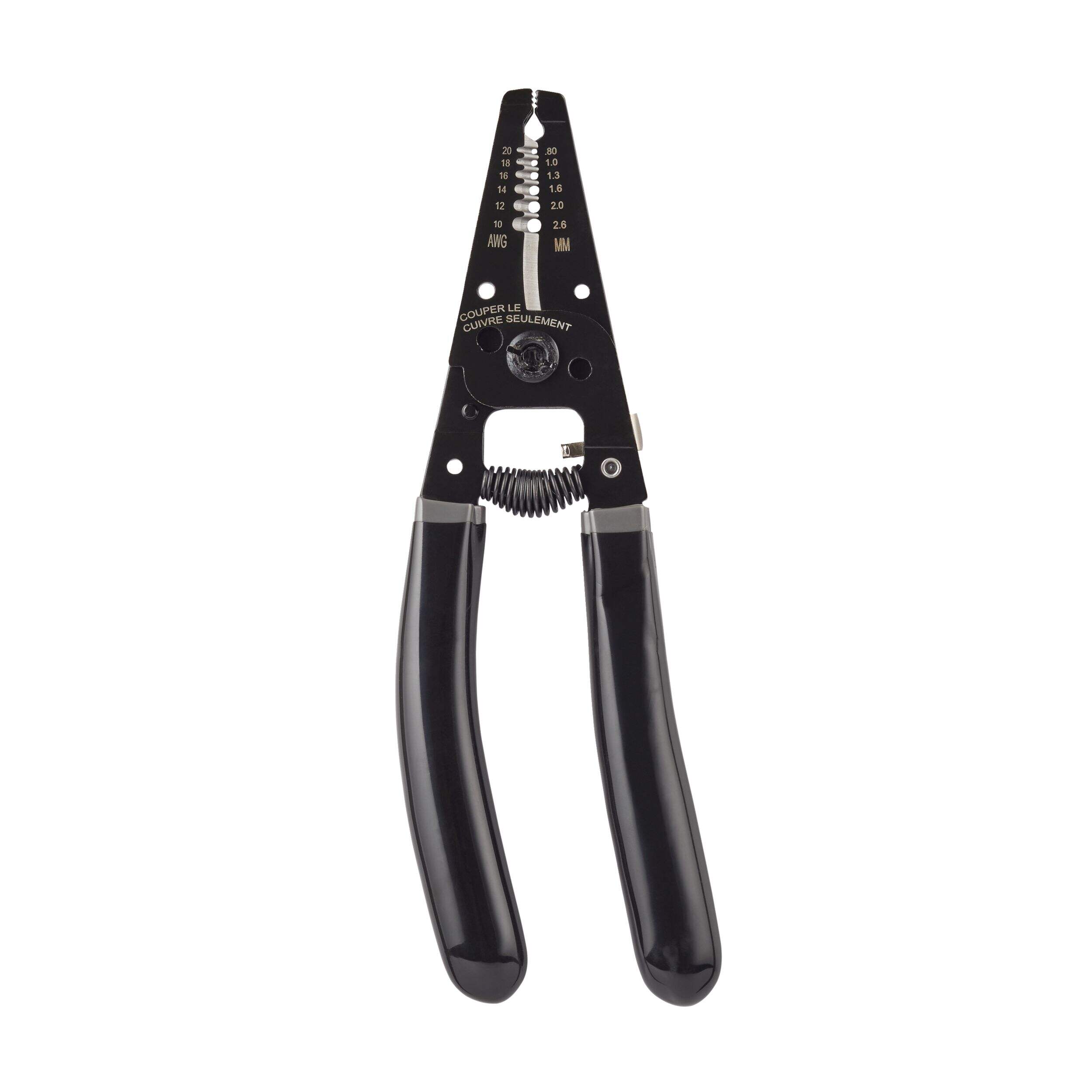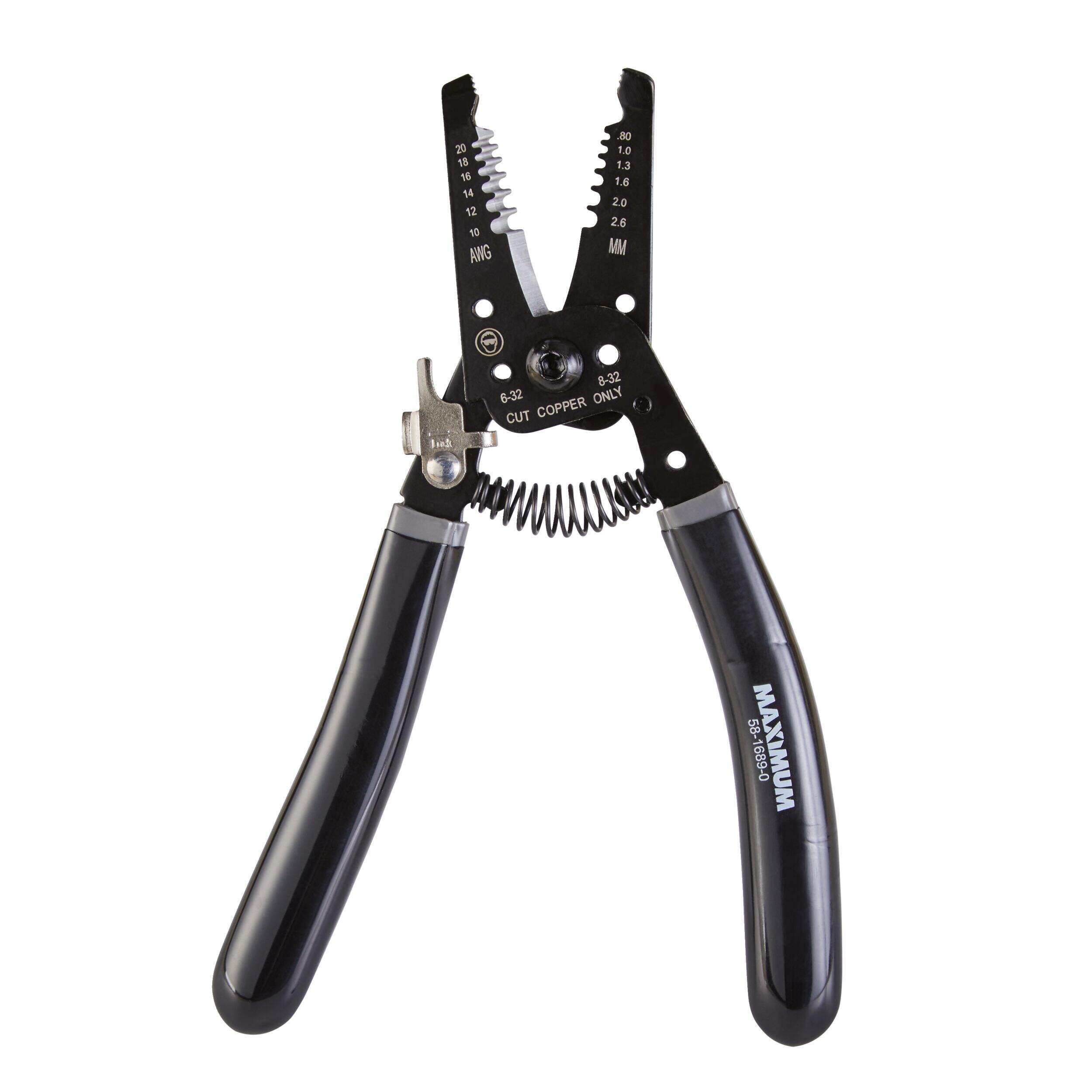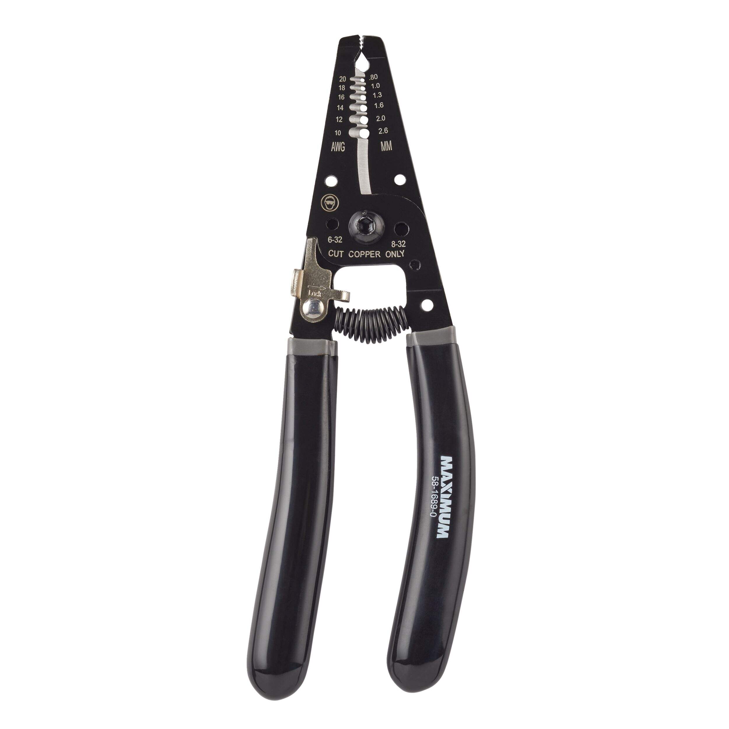 The MAXIMUM 10-20 Gauge Wire Stripper handles a wide range of wire gauges with precision shear-type cutting blades for easy stripping. Designed to strip 10-20 AWG solid wire and shear 8-32 and 6-32 screws, this 7-inch wire stripper features a serrated nose that grips and bends wire with ease. With a non-slip cushion grip handle and curved design, this carbon steel wire stripper is easy to use and is able to reach confined spaces.