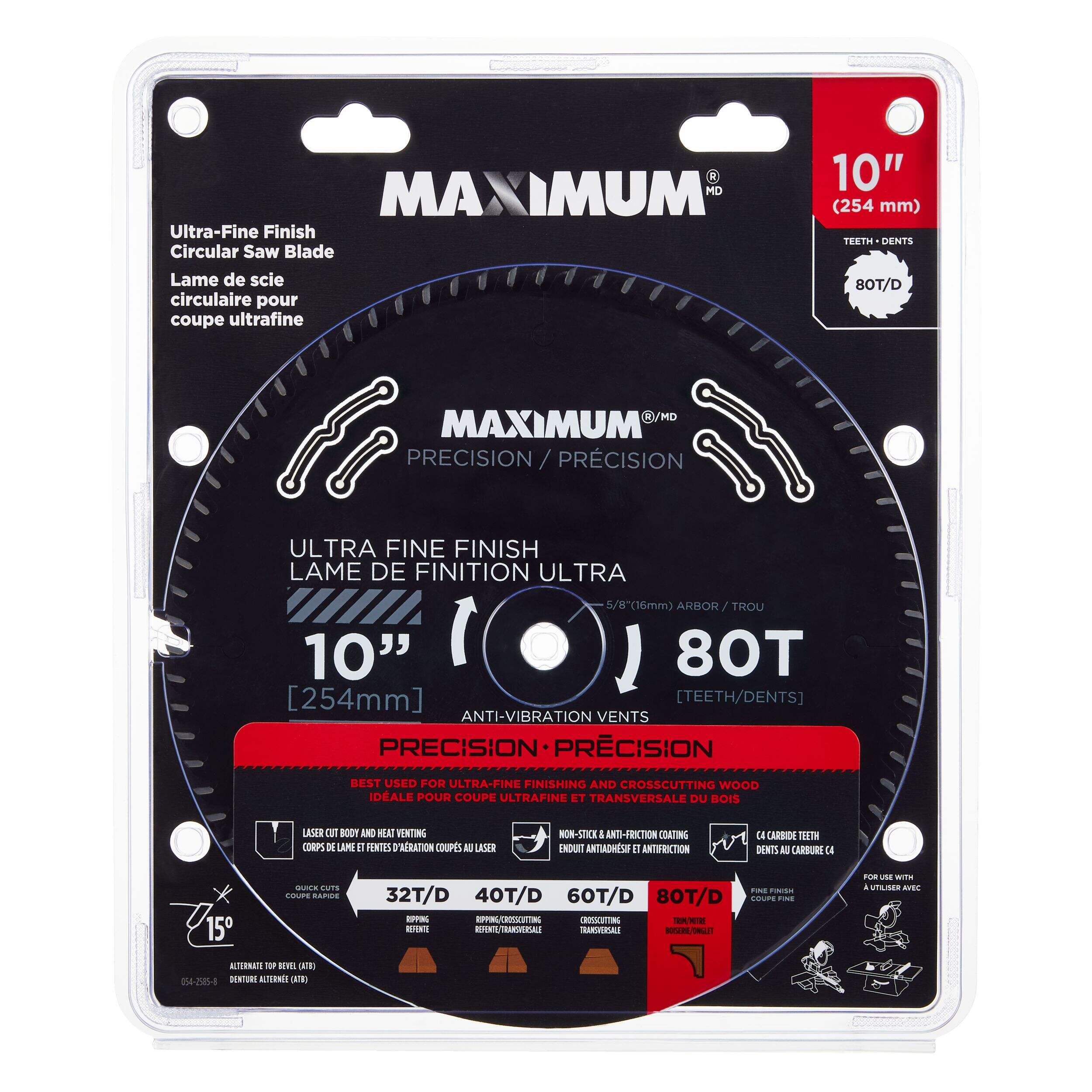 The MAXIMUM 10-in 80T Carbide Tipped Circular Saw Blade is perfect for precise, general-purpose wood cutting. Its non-stick coating protects against heat, gumming, and corrosion, ensuring durability with every use. Designed with a laser-cut, anti-vibration system, it keeps your saw stable for smoother, more accurate cuts. The super-dense micro-grain carbide tips offer exceptional cutting life, making this blade a must-have for fine carpentry.
