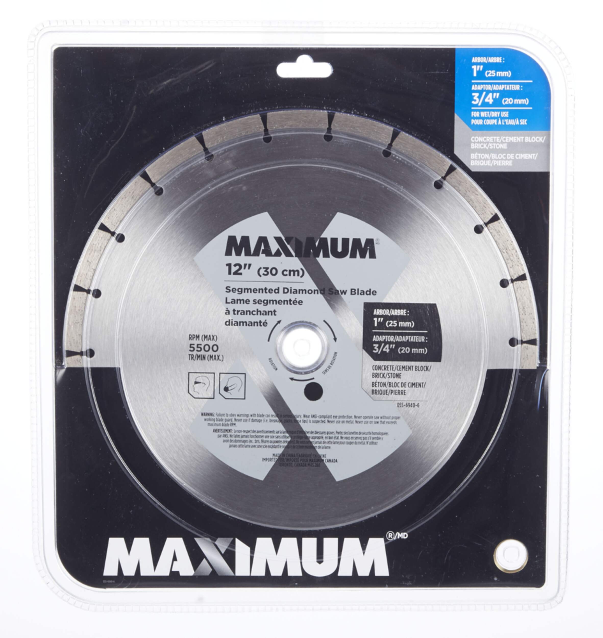 The MAXIMUM Segmented Diamond Saw Blade, 12", has a diamond-coated rim for faster cutting and a longer overall tool life than equivalent abrasive blades. The saw blade’s rim is sintered to provide a longer cutting life, and is ideal for slicing through tough surfaces made of concrete, cement block, brick, or stone. With a maximum RPM of 5500, the blade can reach speeds to cut through almost anything. This durable MAXIMUM saw blade boasts a 12” diameter with a 1” arbour, and is compatible with any electric saw that can accommodate that size of blade. It also includes a ¾” adaptor if your saw of choice has a small arbour size.