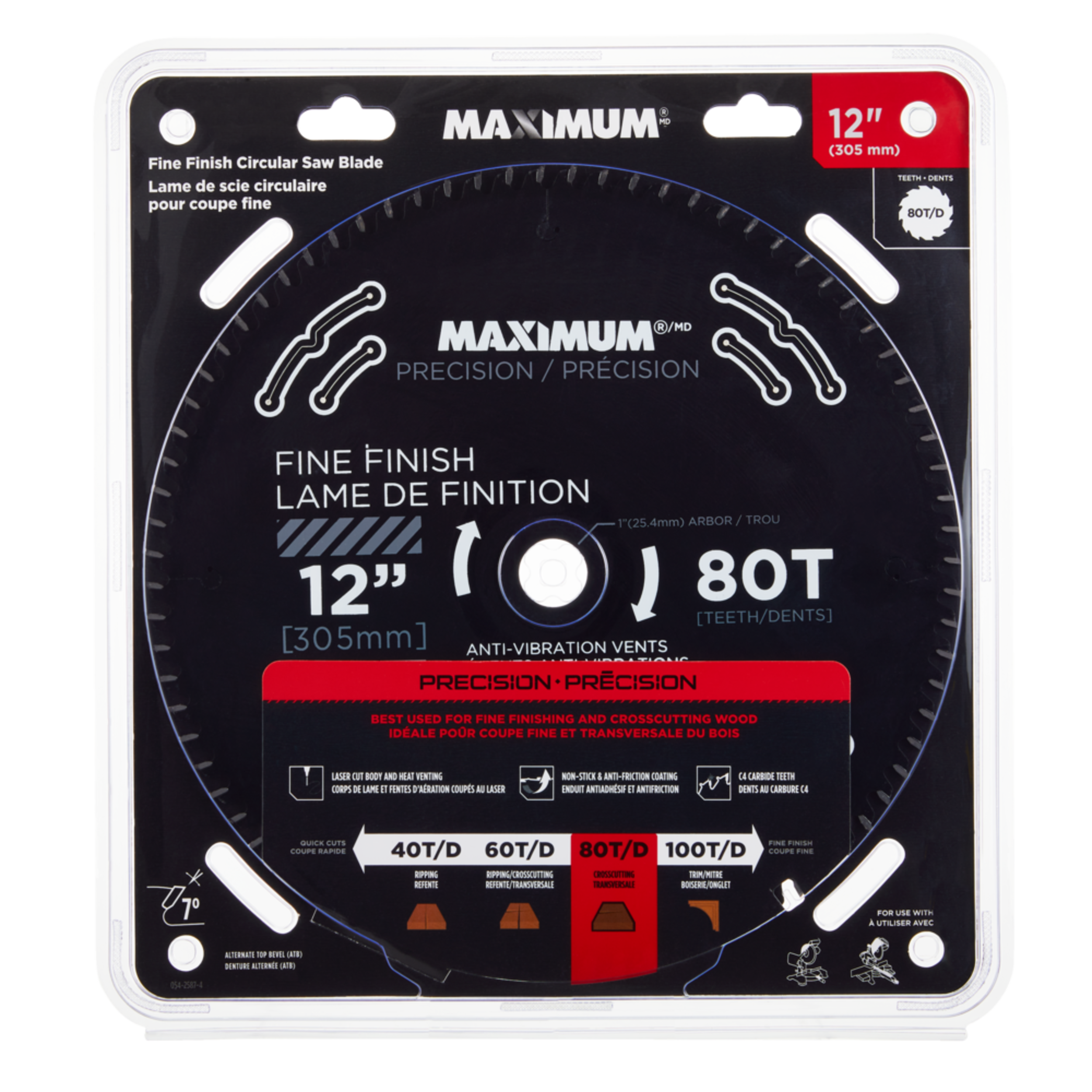 The MAXIMUM 12-in 80-T Fine Finish Circular Saw Blade is engineered for smooth, precise wood cutting and finishing. Its laser-cut, anti-vibration design ensures enhanced stability and accuracy, while the high-density micro-grain carbide extends the blade's cutting life. The non-stick coating prevents gumming and resists heat and corrosion, making each cut clean and efficient. This reliable blade is ideal for fine finishes and dependable performance in woodworking projects.