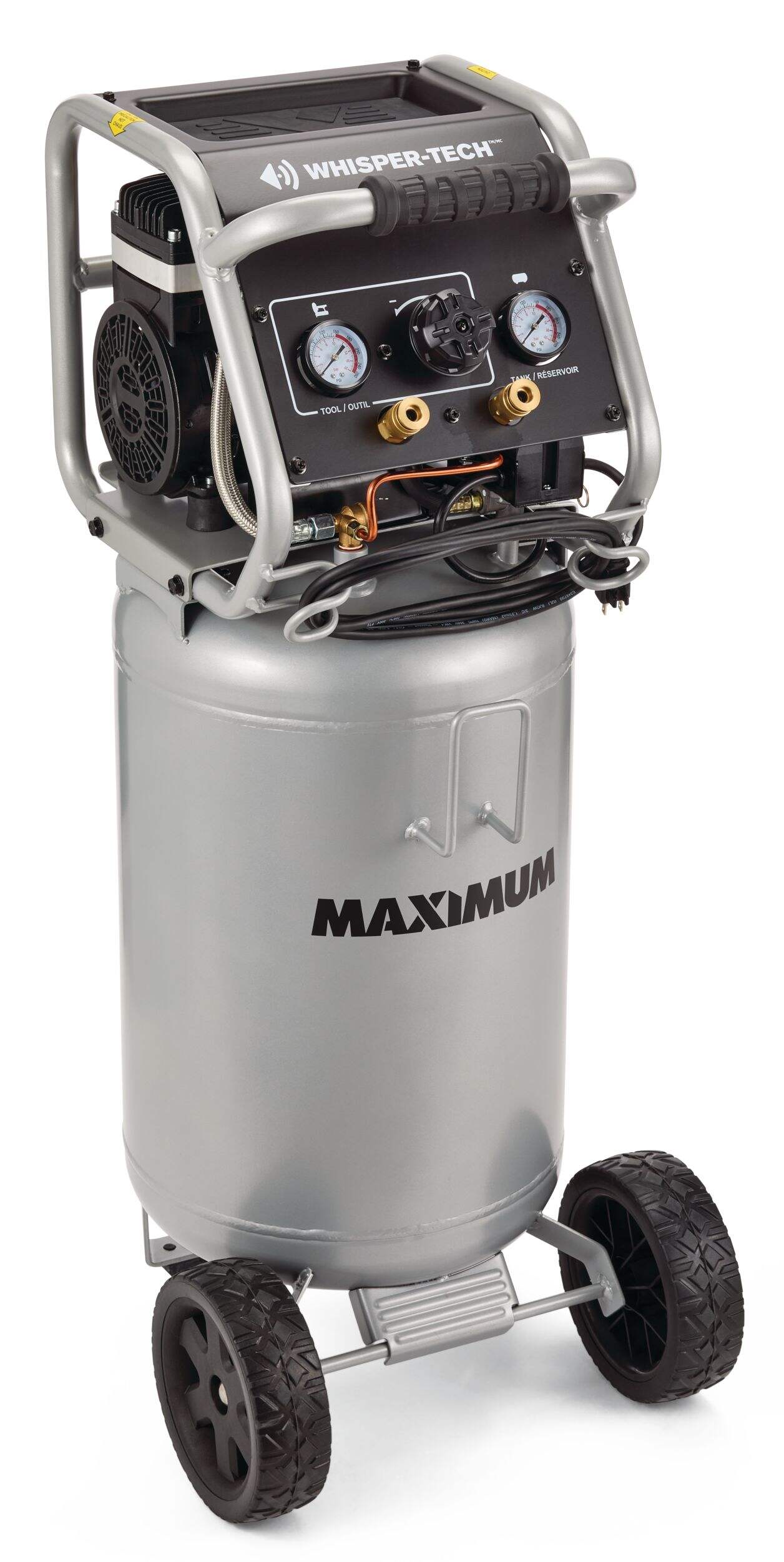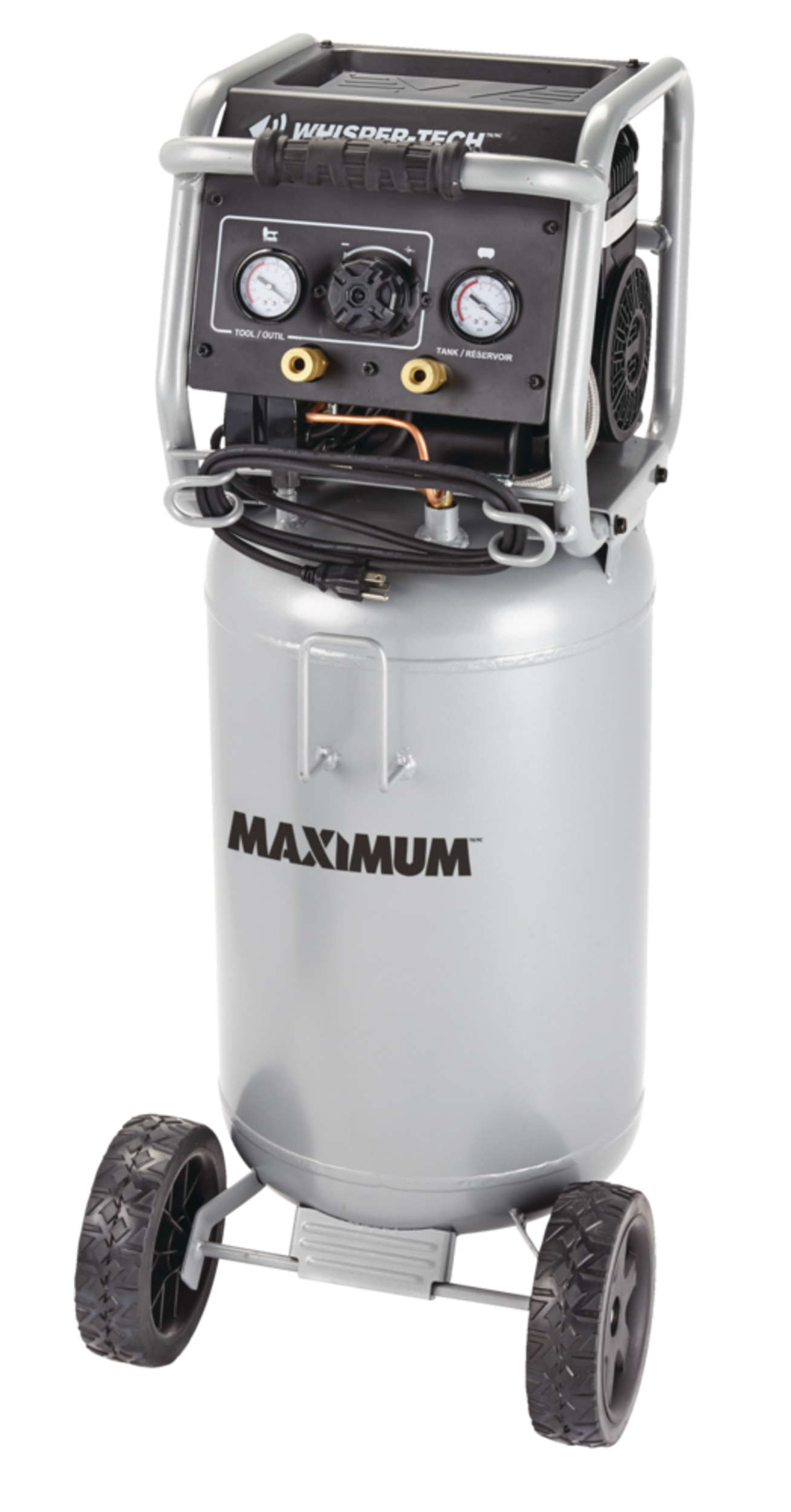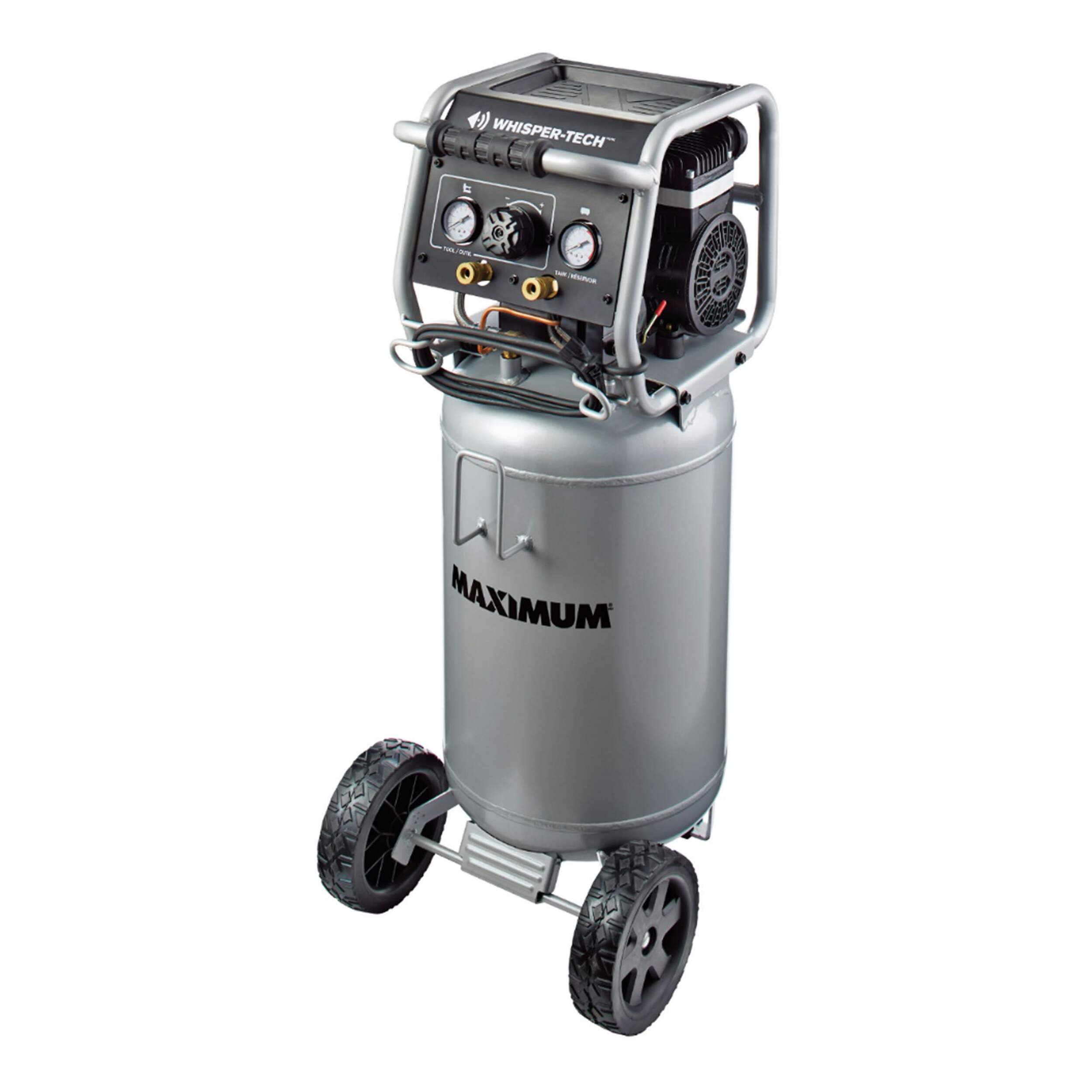 The MAXIMUM 15-Gallon Vertical Air Compressor is designed for effortless performance and low maintenance, featuring an oil-free pump that eliminates the need for regular upkeep. Equipped with Whisper-Tech technology, this compressor operates quietly, making it perfect for indoor use. The durable top tray provides convenient storage for your tools and accessories, keeping everything within easy reach. Its metal control panel features two gauges and a large regulator knob, ensuring simple and precise operation. With a strong handle and large rubber wheels, this compressor offers excellent mobility, allowing you to transport it with ease wherever your projects take you.