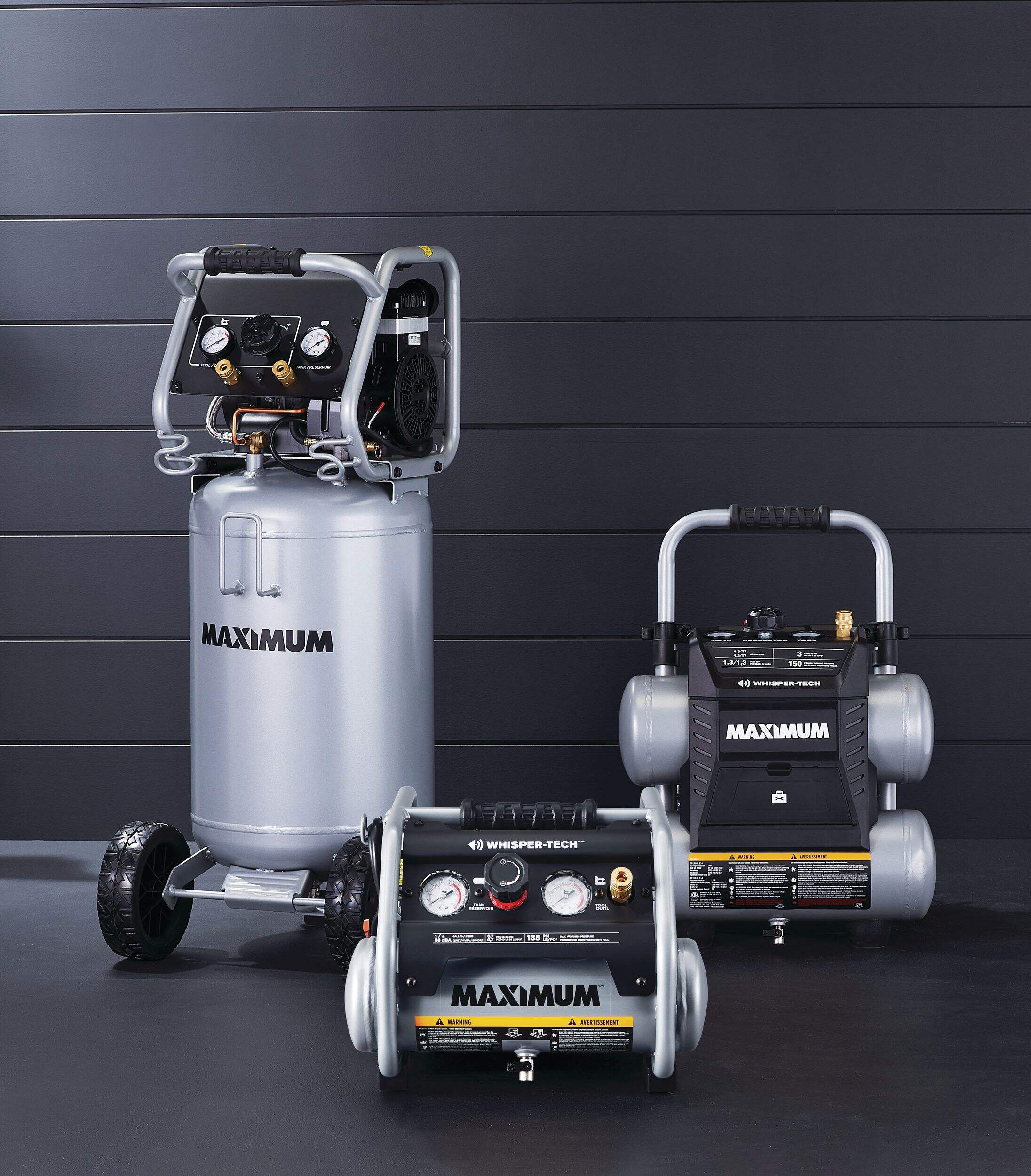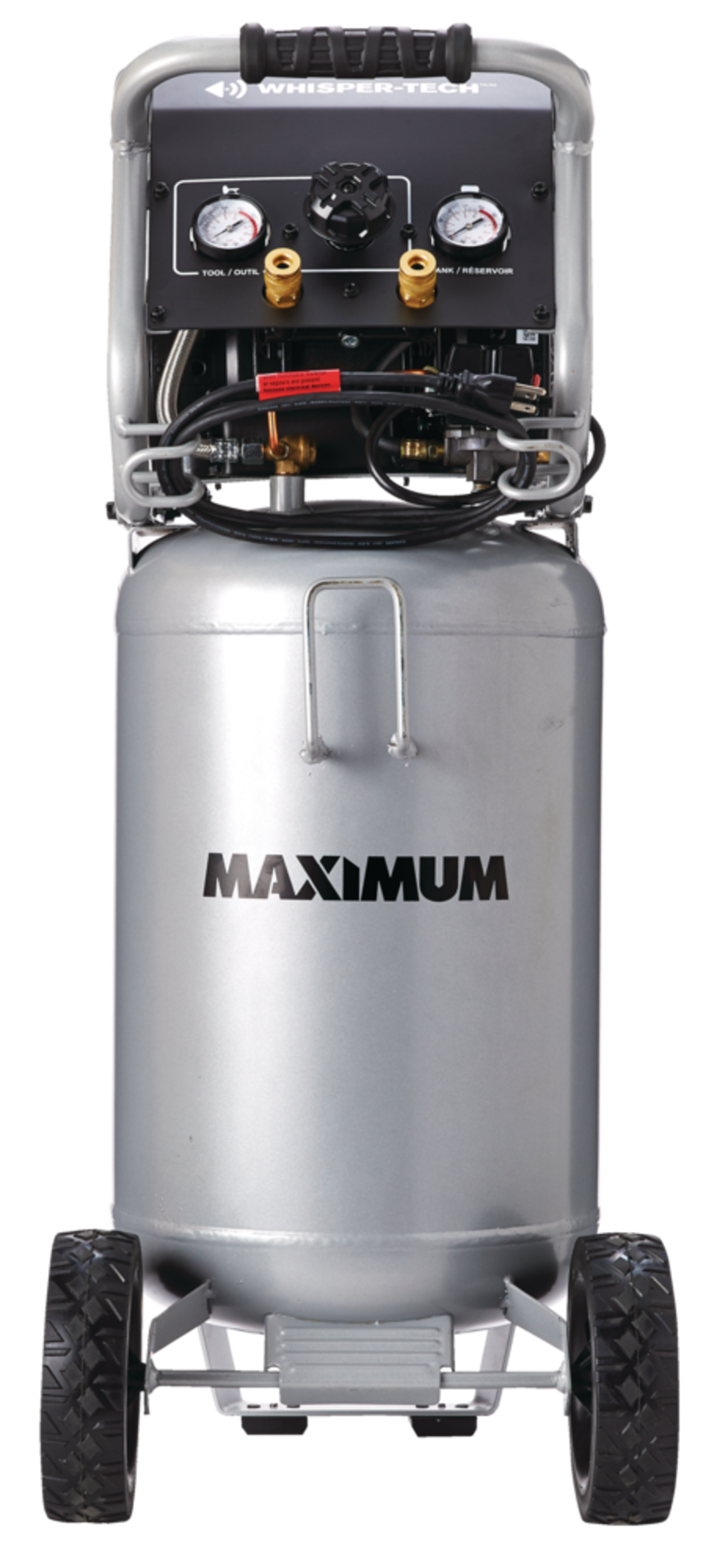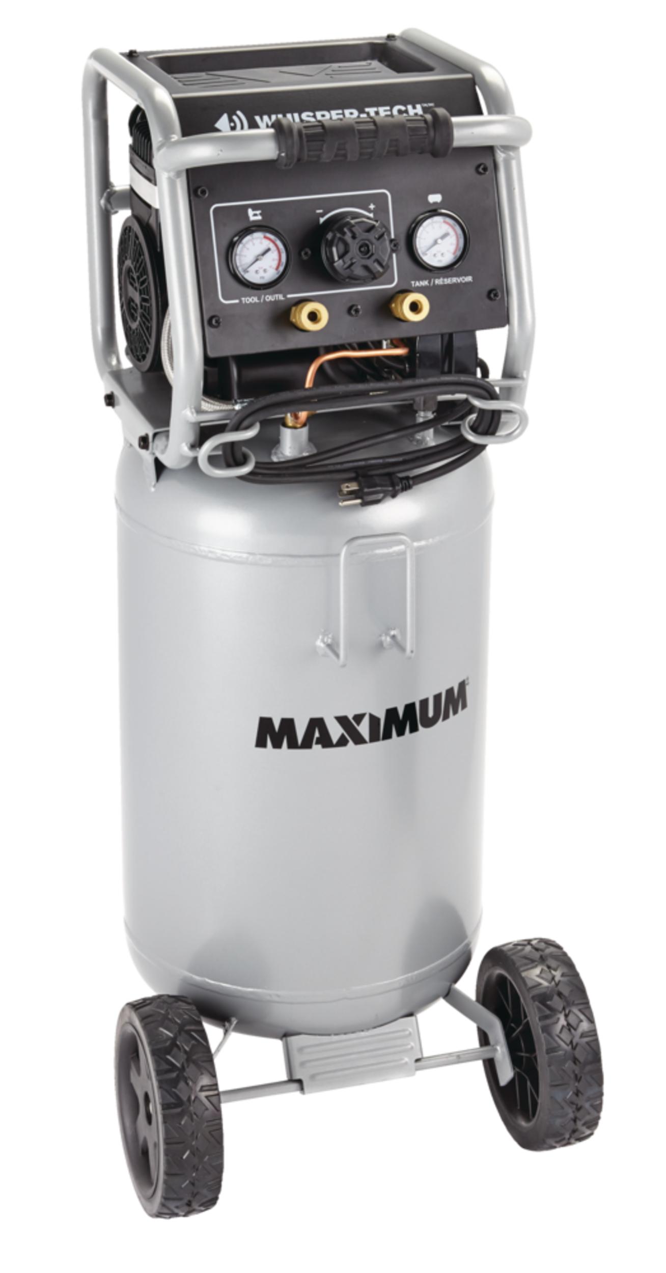The MAXIMUM 15-Gallon Vertical Air Compressor is designed for effortless performance and low maintenance, featuring an oil-free pump that eliminates the need for regular upkeep. Equipped with Whisper-Tech technology, this compressor operates quietly, making it perfect for indoor use. The durable top tray provides convenient storage for your tools and accessories, keeping everything within easy reach. Its metal control panel features two gauges and a large regulator knob, ensuring simple and precise operation. With a strong handle and large rubber wheels, this compressor offers excellent mobility, allowing you to transport it with ease wherever your projects take you.