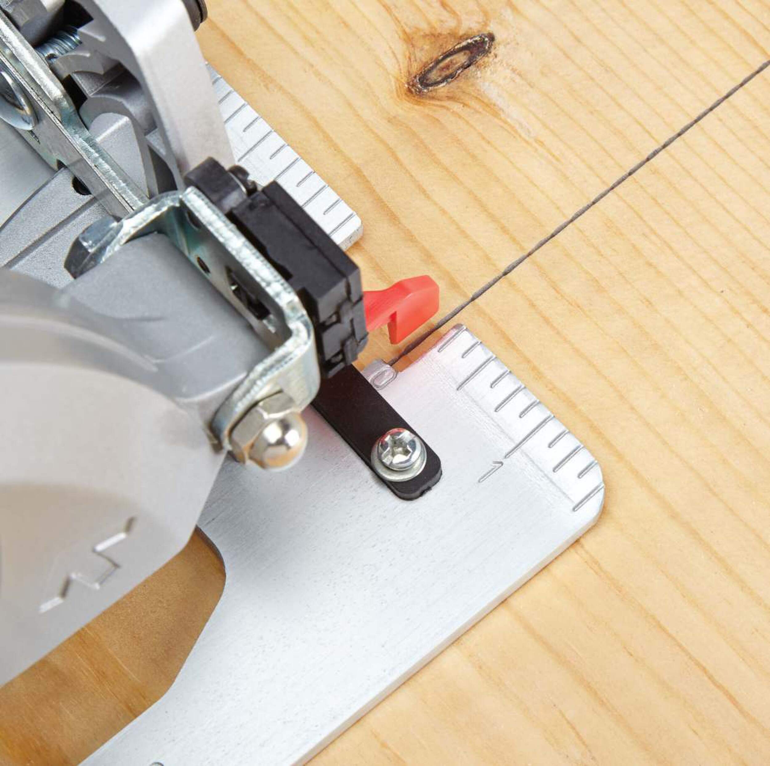 Features a cutting line and blade tracker that aligns with the blade, allowing you to follow your work piece mark line for precise straight or bevel cuts