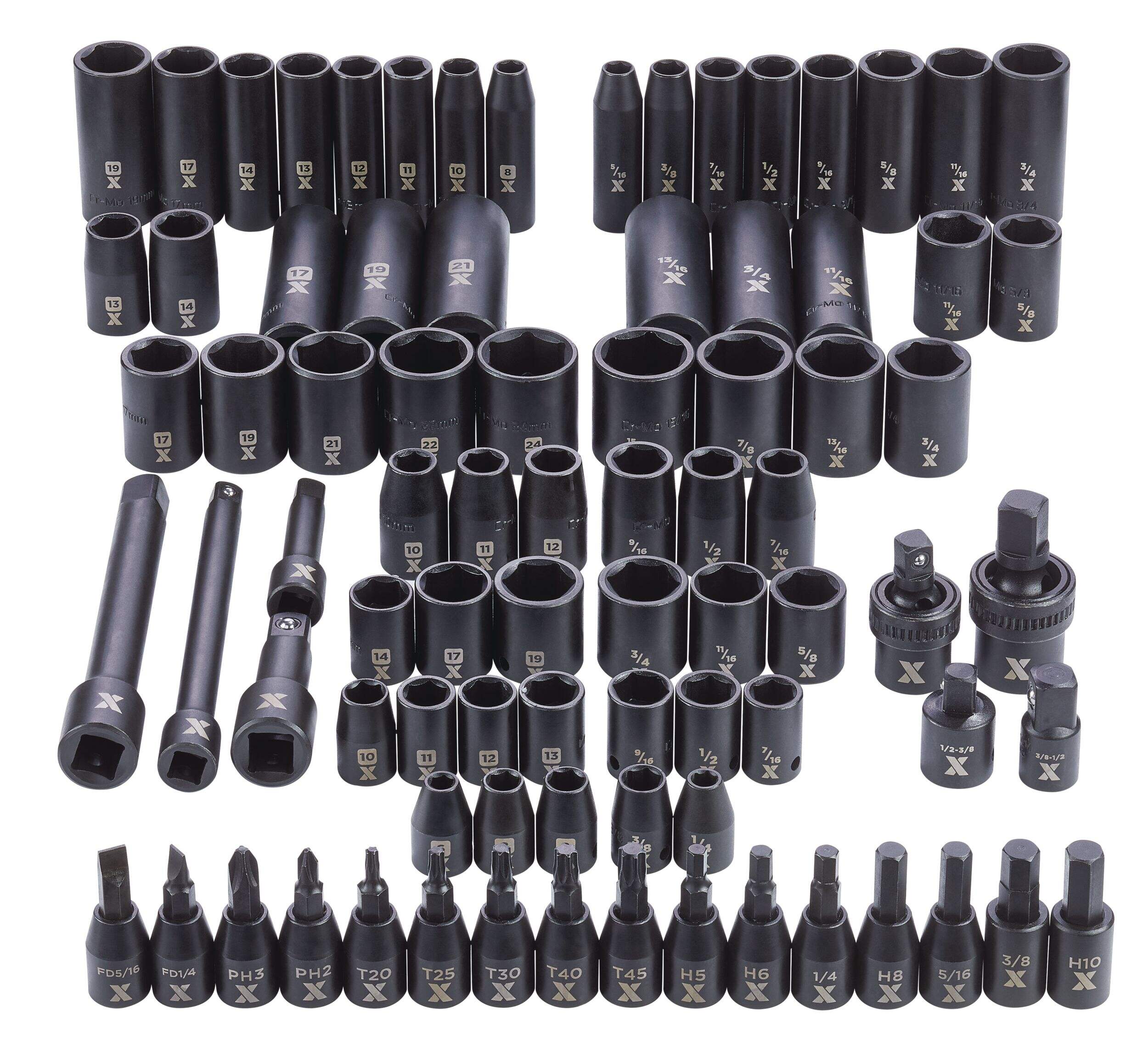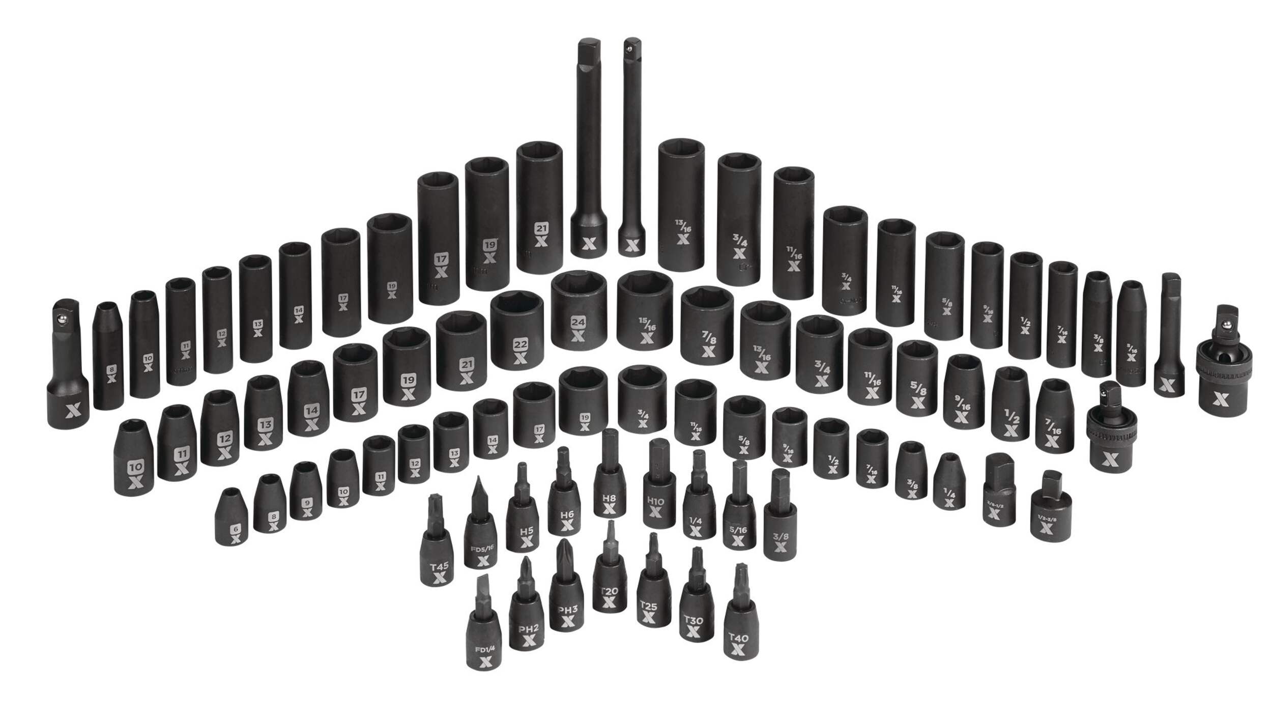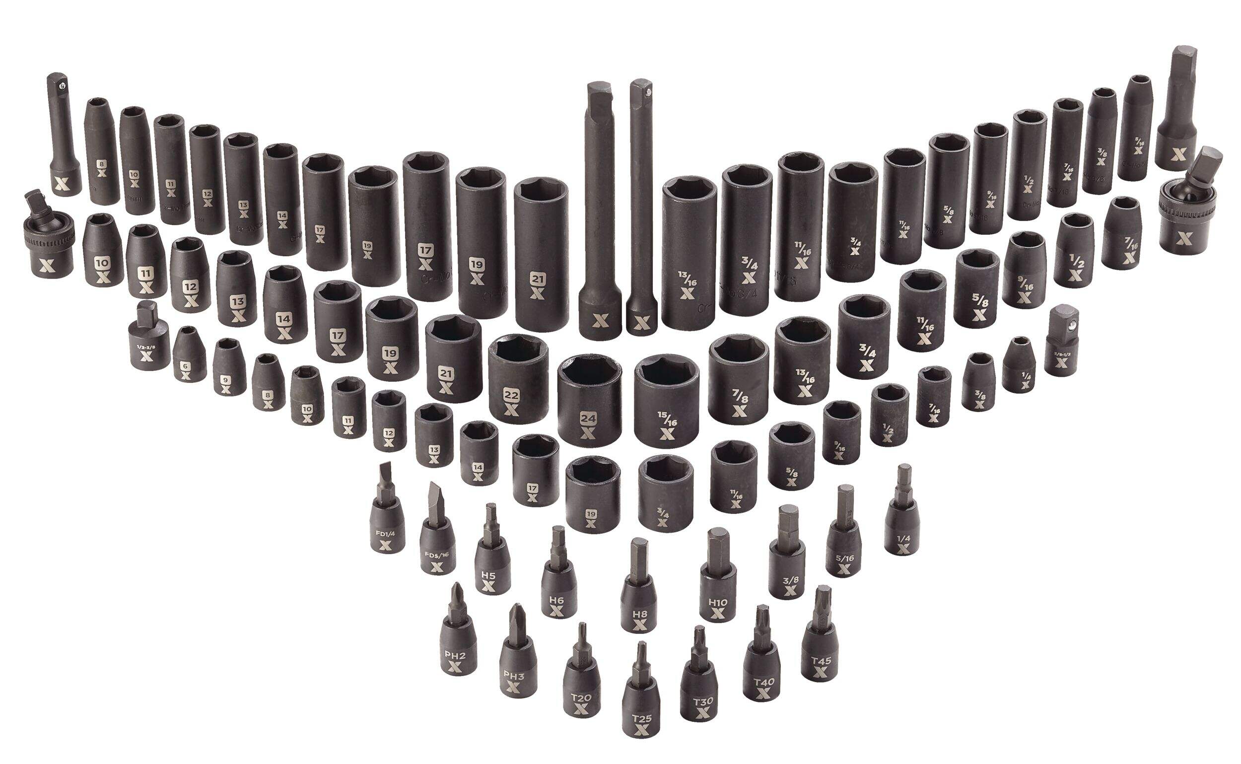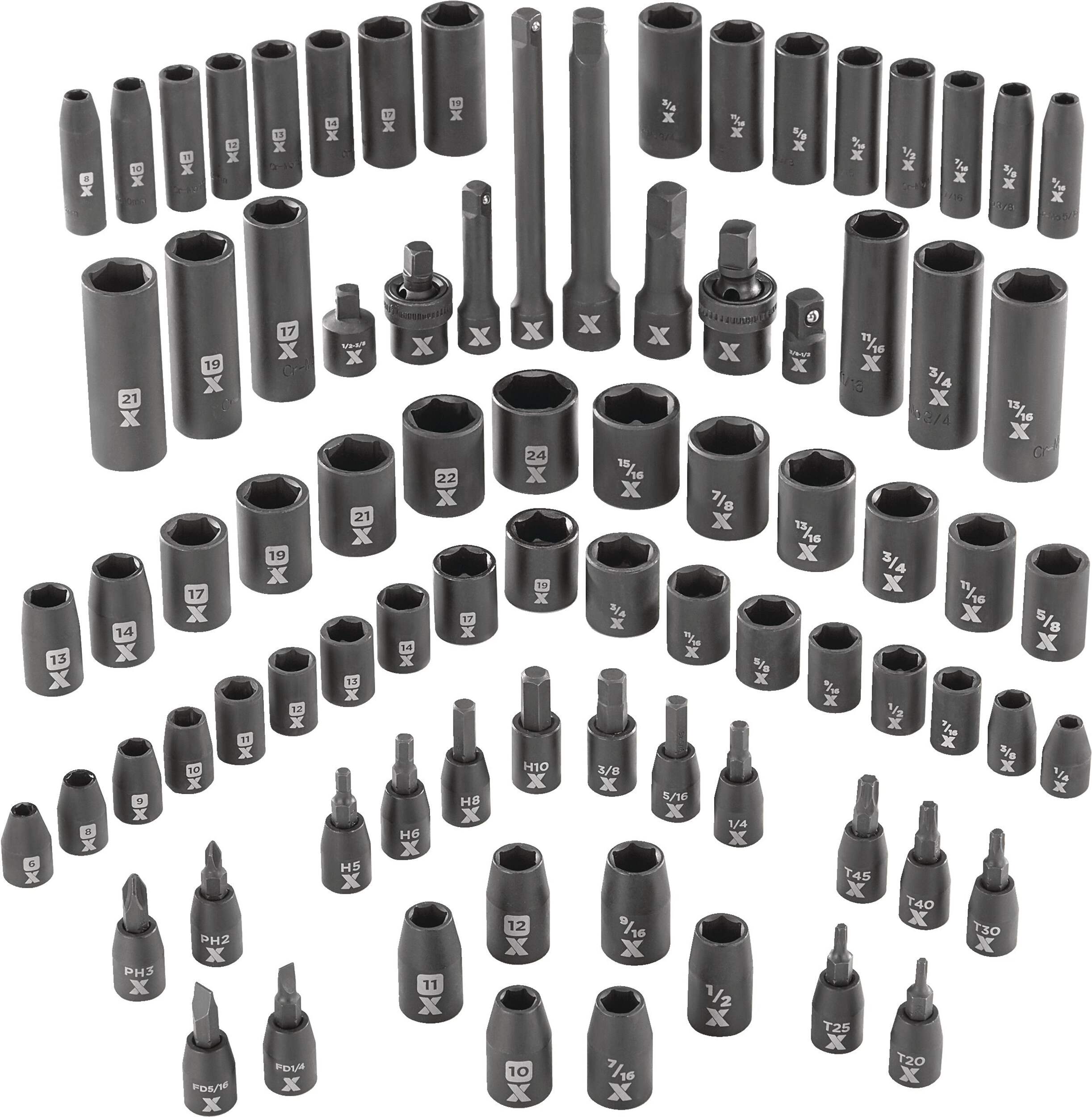 Includes a 58-piece 3/8" drive socket set with the following parts: 18 impact sockets, 16 deep impact sockets, 16 impact bit sockets, 2 impact extension bars, and 1 impact U-joint
