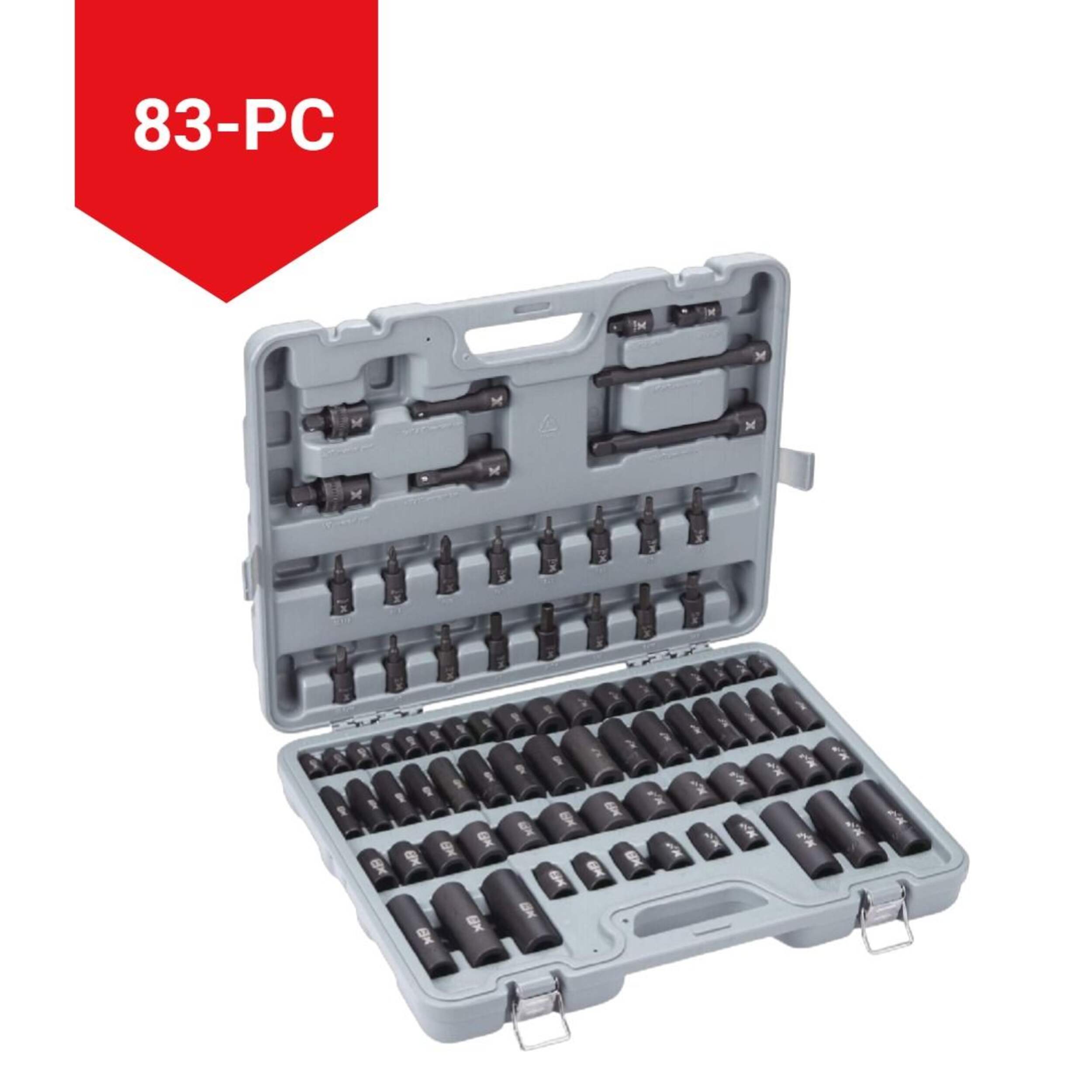 Includes a 28-piece 1/2" drive socket set with the following parts: 19 impact sockets, 6 deep impact sockets, 2 impact extension bars, and 1 impact U-joint