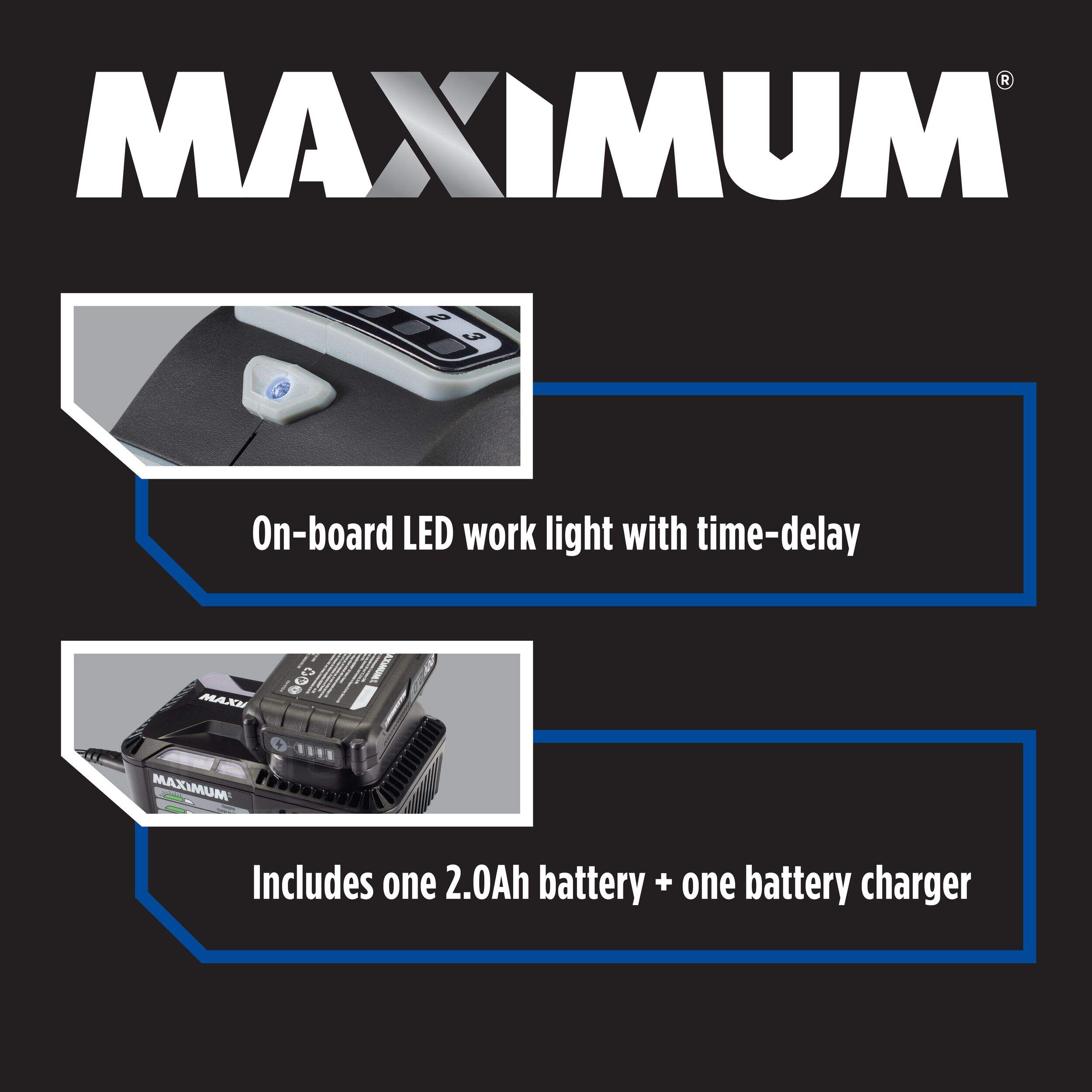 Built-in LED work light with time-delay illuminates work surfaces and remains on 15-seconds after releasing the trigger