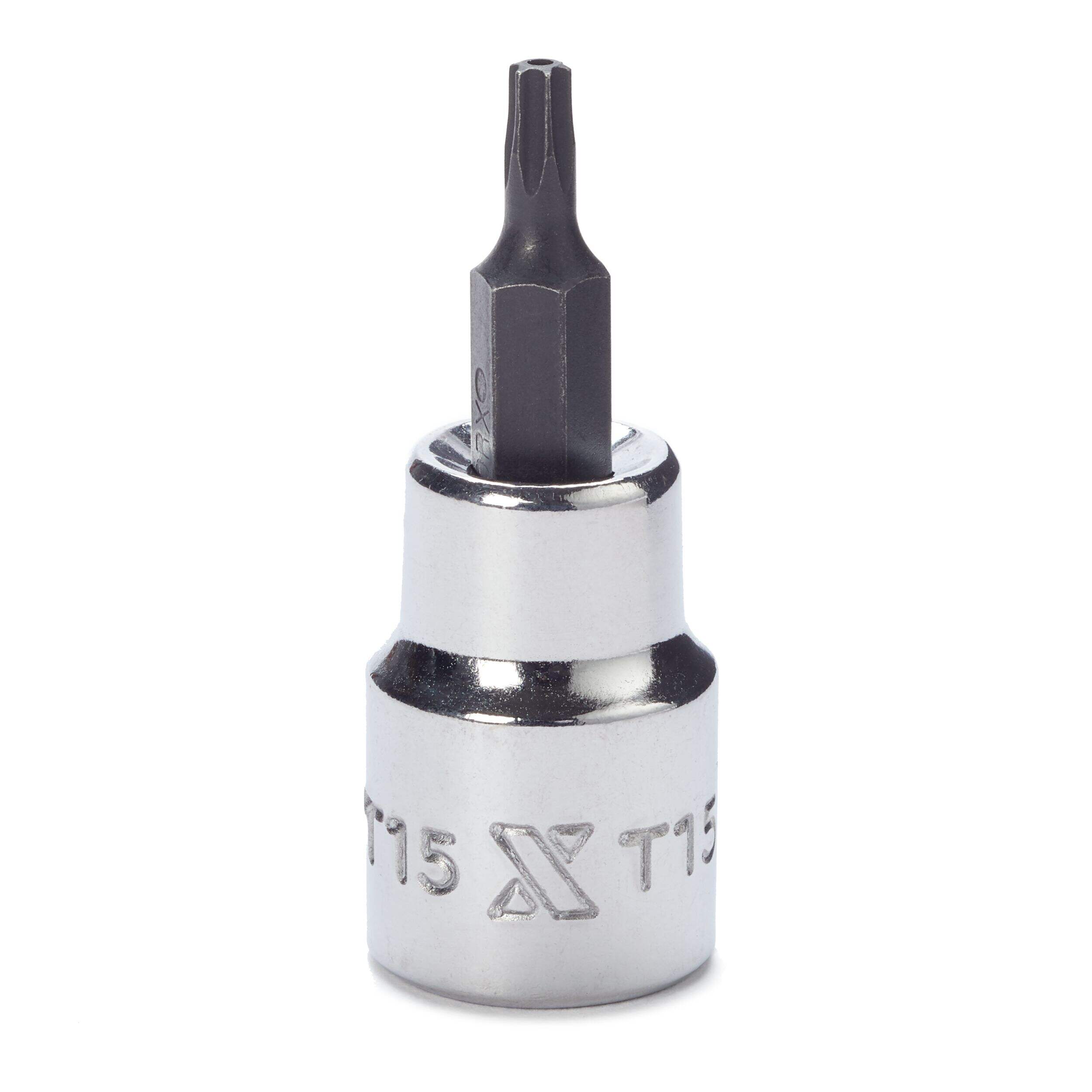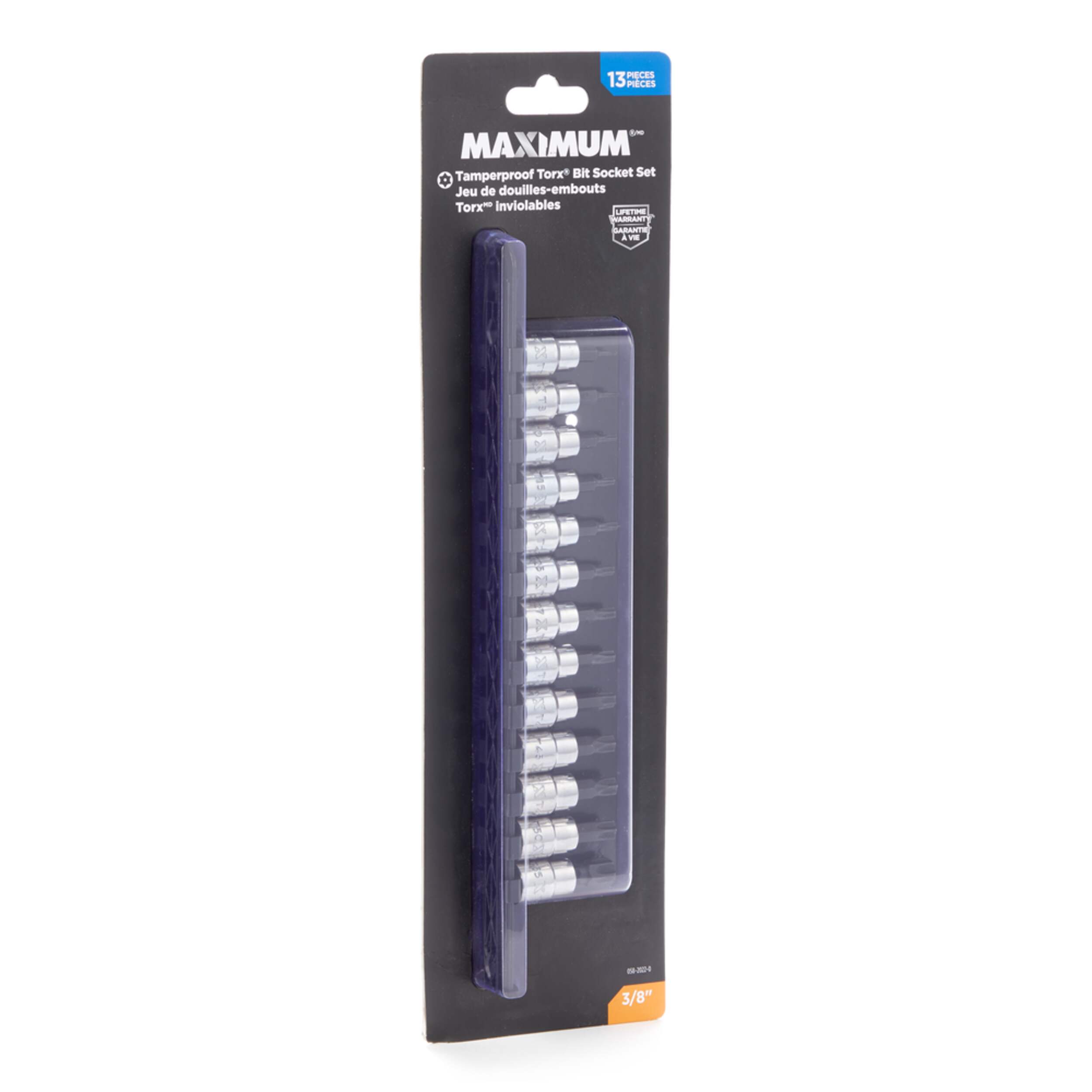 The MAXIMUM 3/8-in Drive Tamper Proof Torx Bit Socket Set has everything you need to tackle a variety of fastening tasks with a secure connection. These socket bits are crafted with a specially treated steel for ultimate durability, and also feature exterior plating that stands up to damage from corrosion. This socket set features high-quality sockets in various sizes, clearly marked for ease of use.