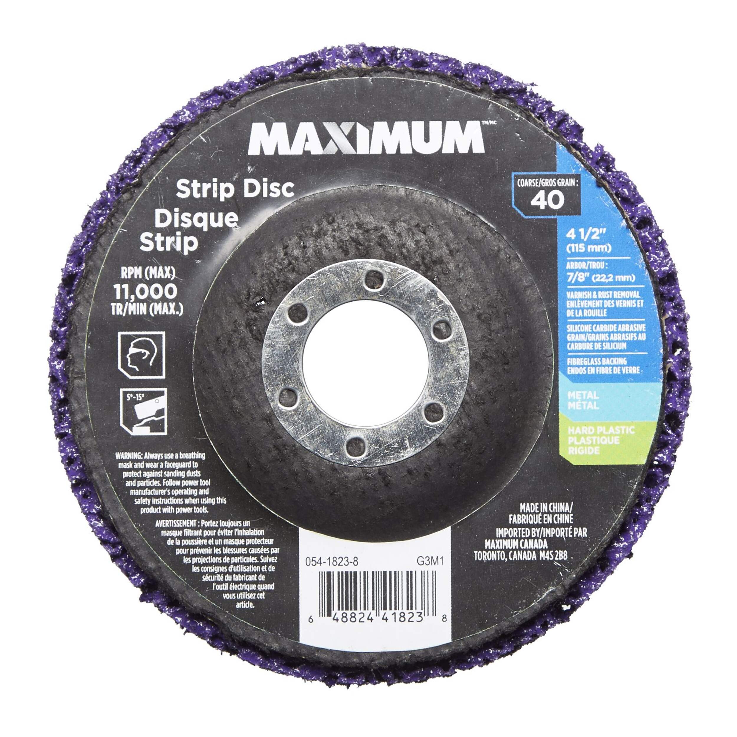 The MAXIMUM Strip-It Abrasive Flex Disc is the ideal option for various surface preparation tasks such as edge finishing, weld dressing, rust cleaning, and more. Built to withstand higher pressures when grinding, this flap disc can operate up to 11,000 RPM on most angle grinders. This strip disc is fitted with a coarse 40 grit, ideal for aggressive grinding on materials such as metal and plastic.