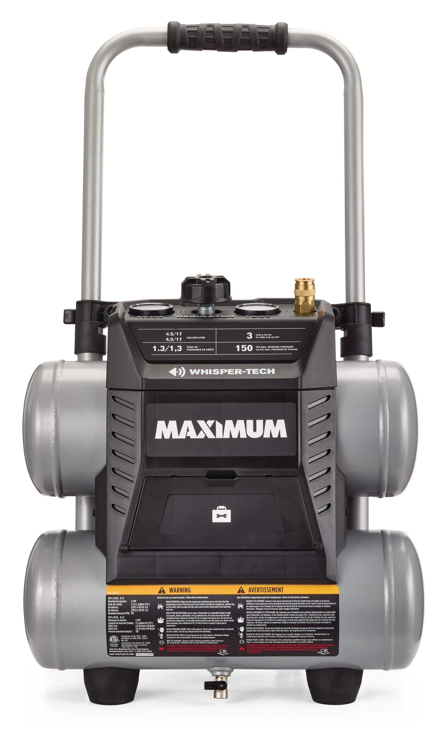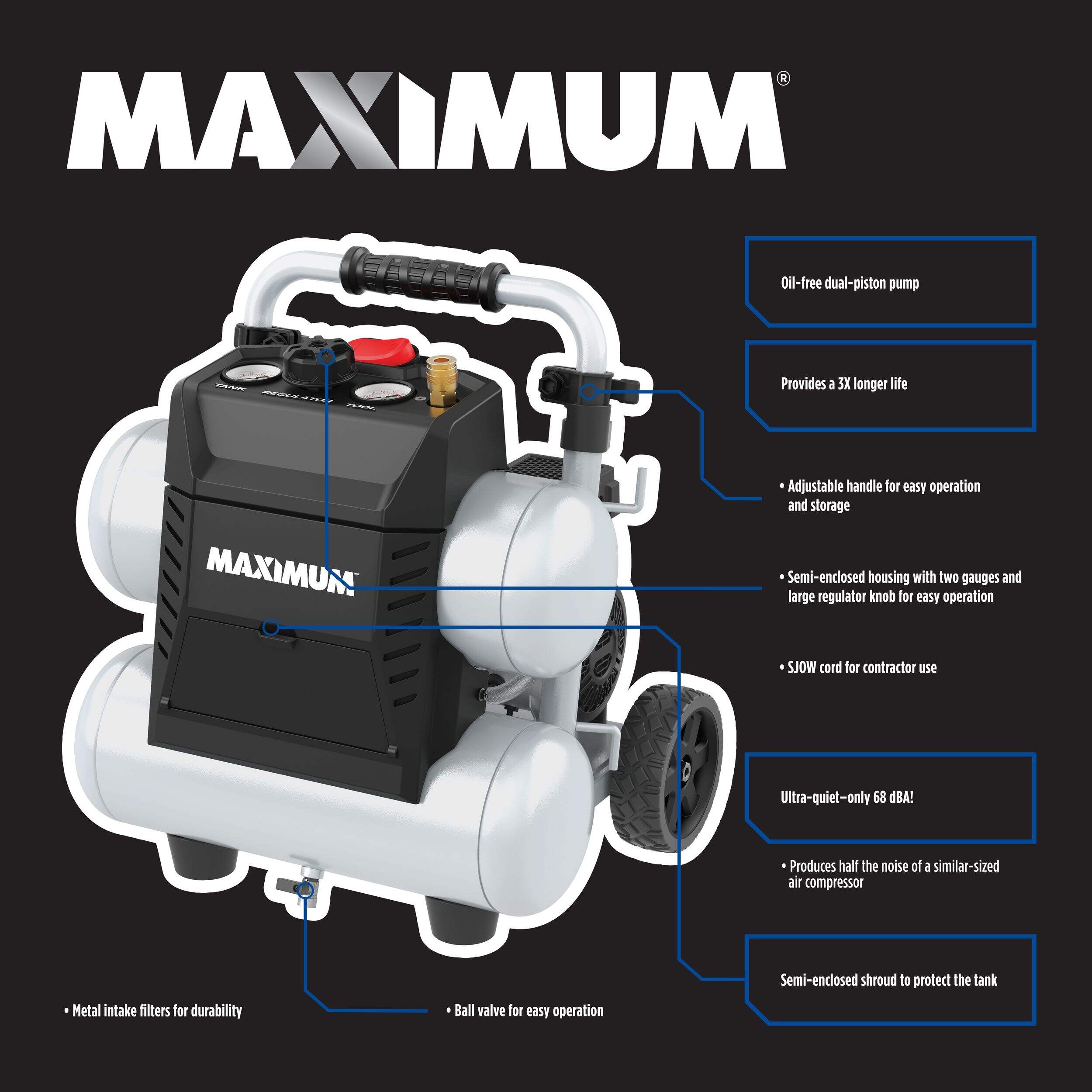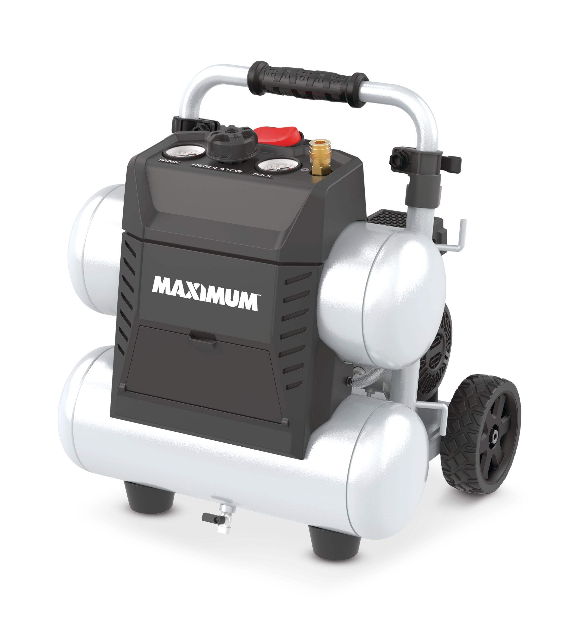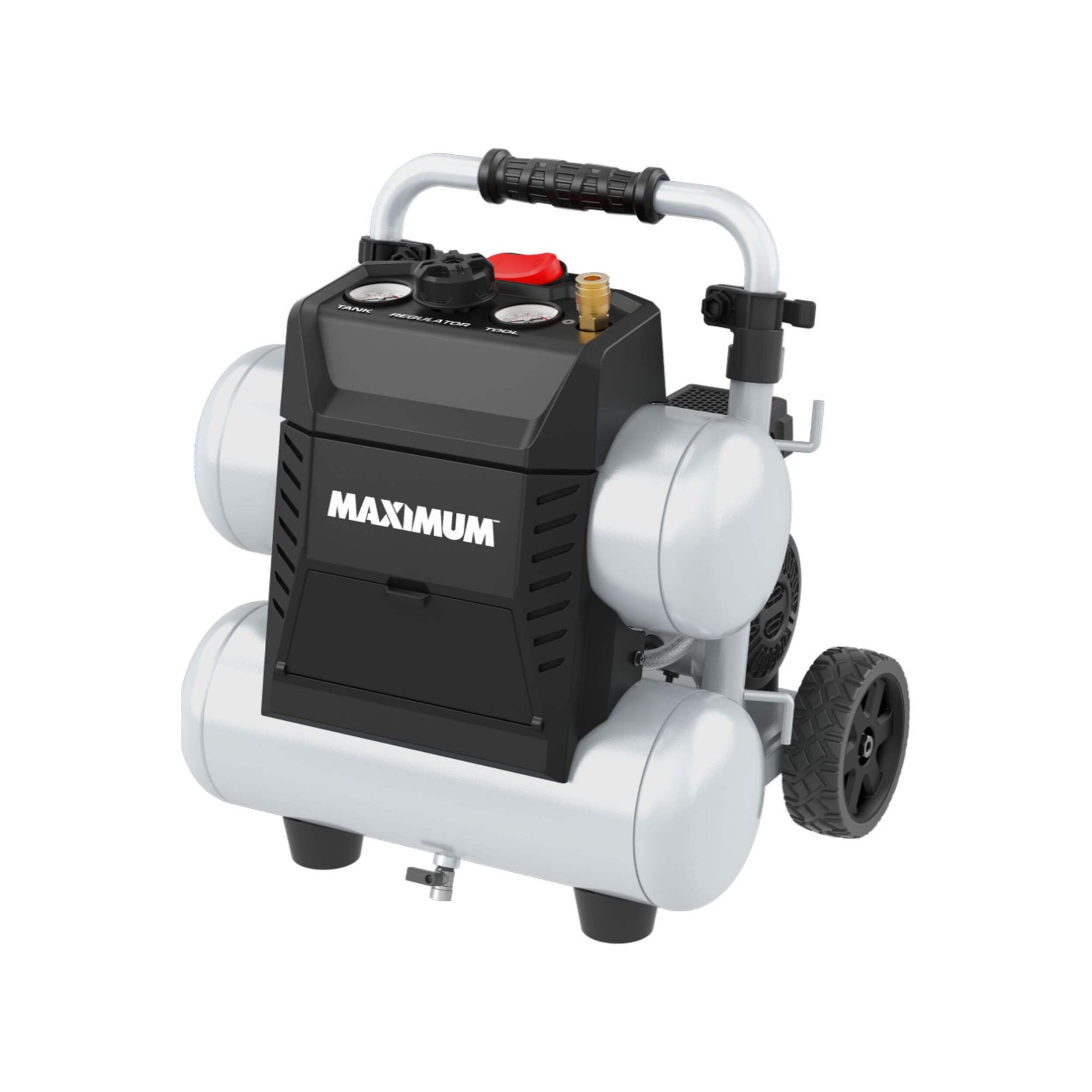 The MAXIMUM 4.5-Gallon Air Compressor combines ultra-quiet operation, compact design, and effortless setup for a hassle-free work experience. Operating at just 68 dBA, it produces 60% less noise than standard compressors without compromising on air delivery power. With a lightweight yet durable composite steel construction, this twin stack air compressor is built for longevity. The adjustable handle features a comfort grip, making it easy to maneuver wherever you need it.