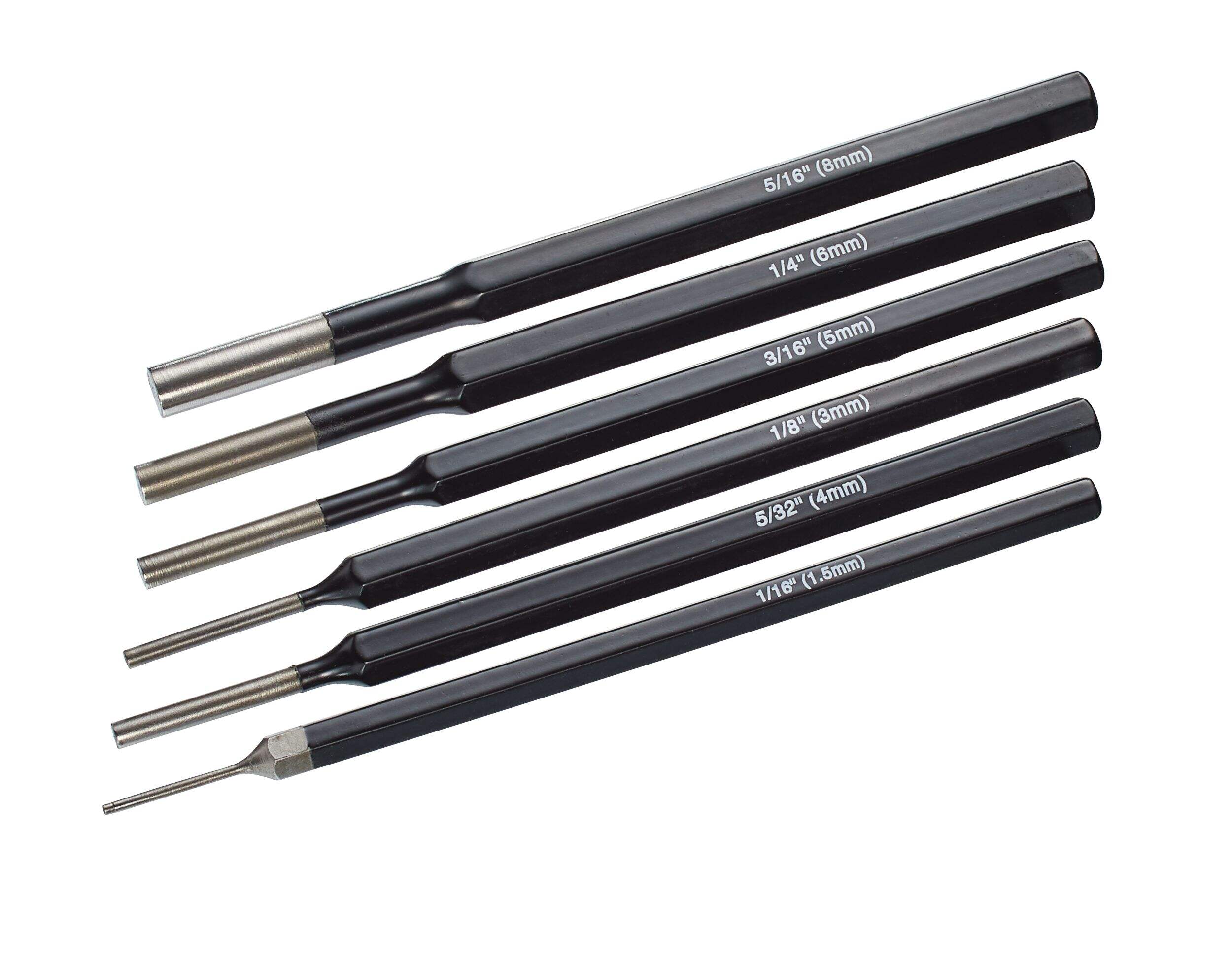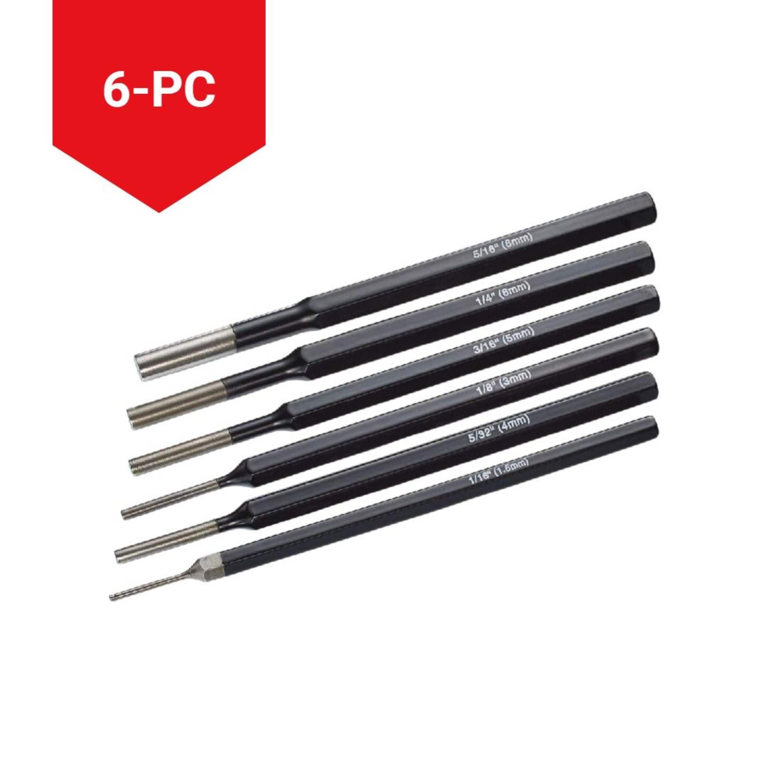 This set includes the following punch sizes: 1/16" x 1/4" x 6", 1/8" x 5/16" x 6", 5/32" x 5/16" x 6", 3/16" x 5/16" x 6", 1/4" x 3/8" x 6", and 5/16" x 3/8" x 6"