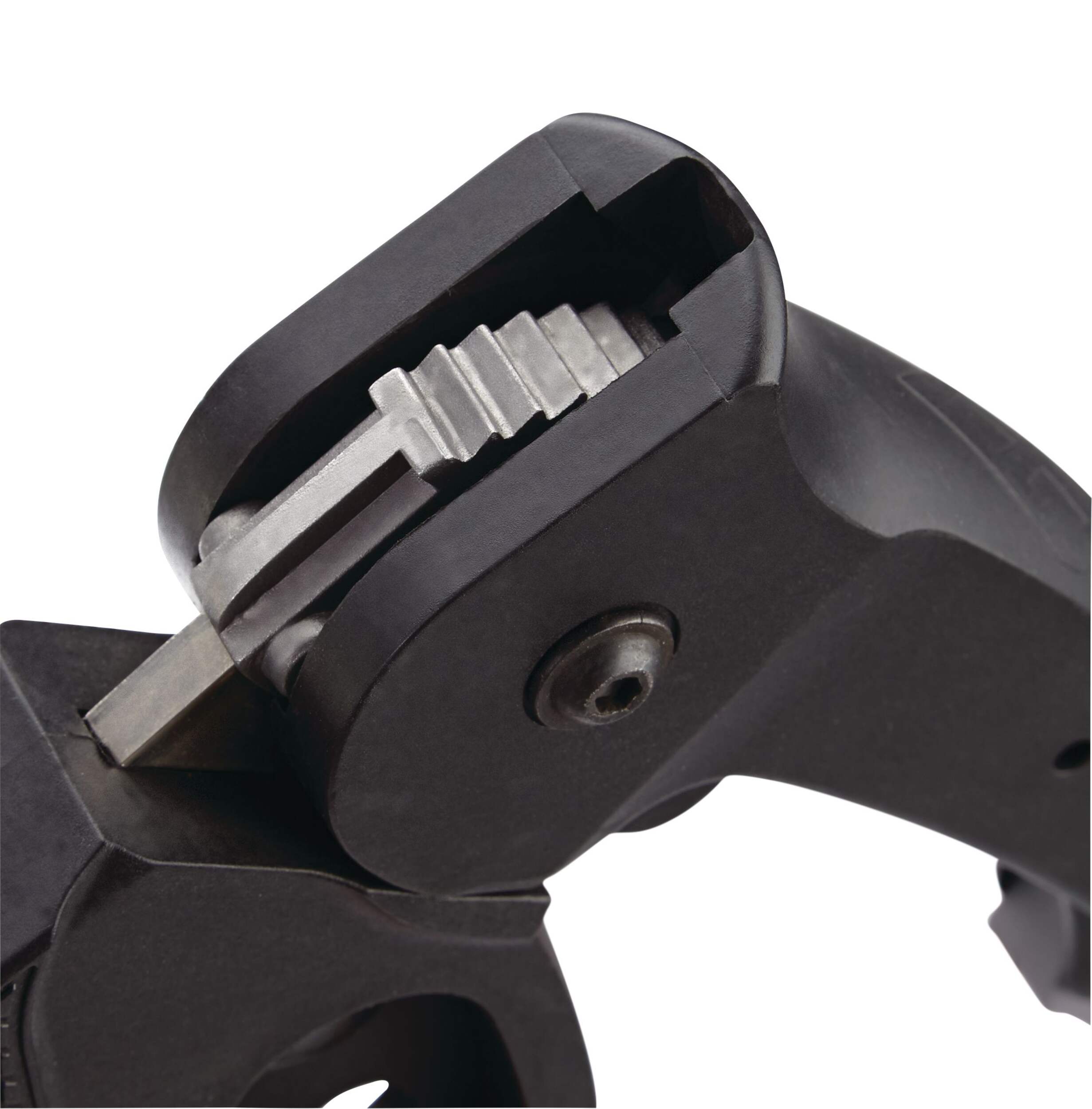 Heavy-duty ratcheting and locking system offers a secure grip and can be easily used with the raised button
