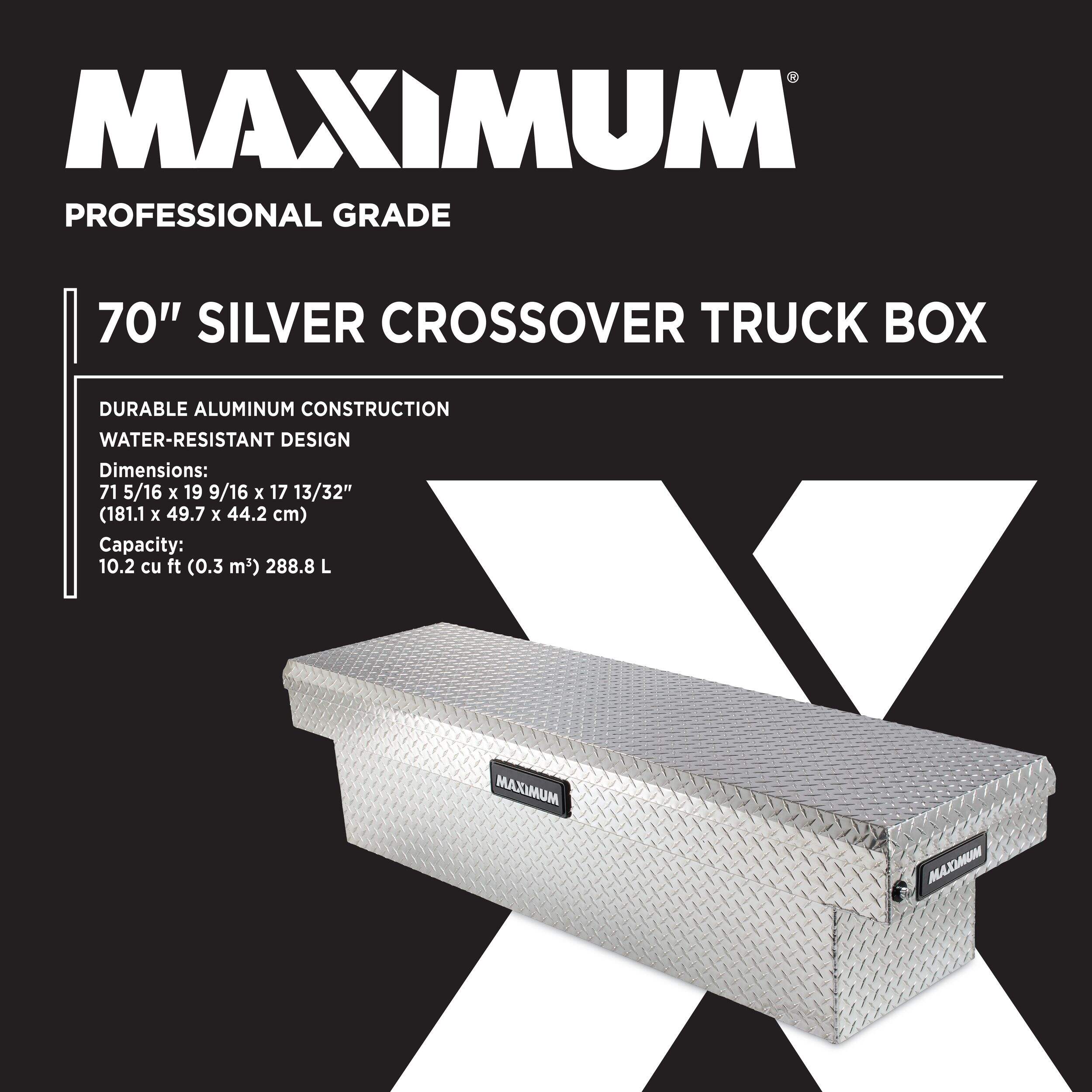 The MAXIMUM 70-inch Crossover Truck Box in silver offers enhanced security with dual tamper-resistant push button locks and a drill-resistant keyed lock. Its C-channel reinforced welded lid and reinforced front panel deter prying. Dual stage rotary latches with hook loop strikers further prevent theft. The D-shaped foam seal blocks outside elements from entering.