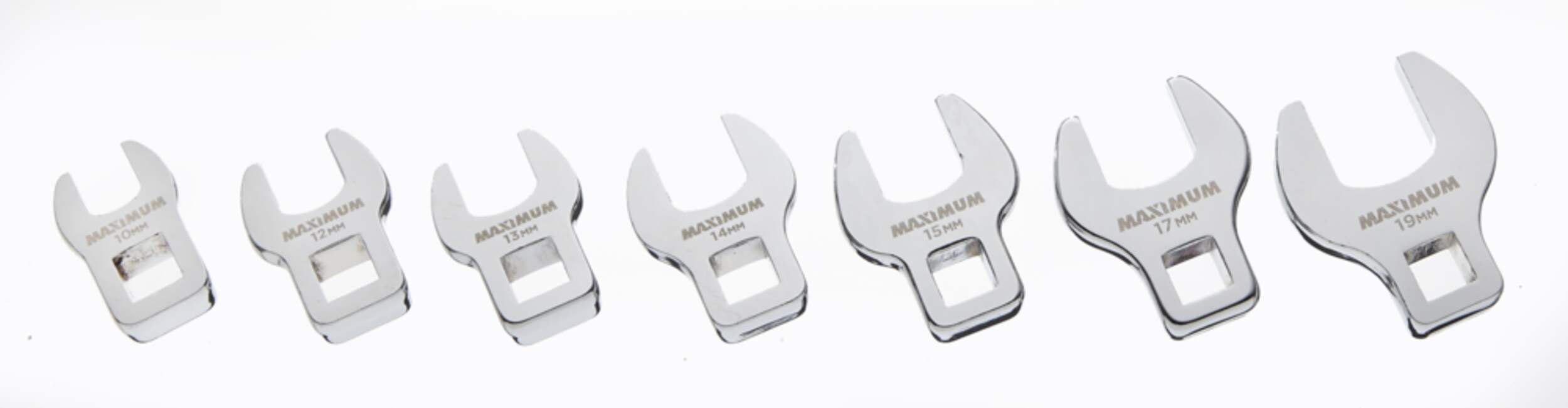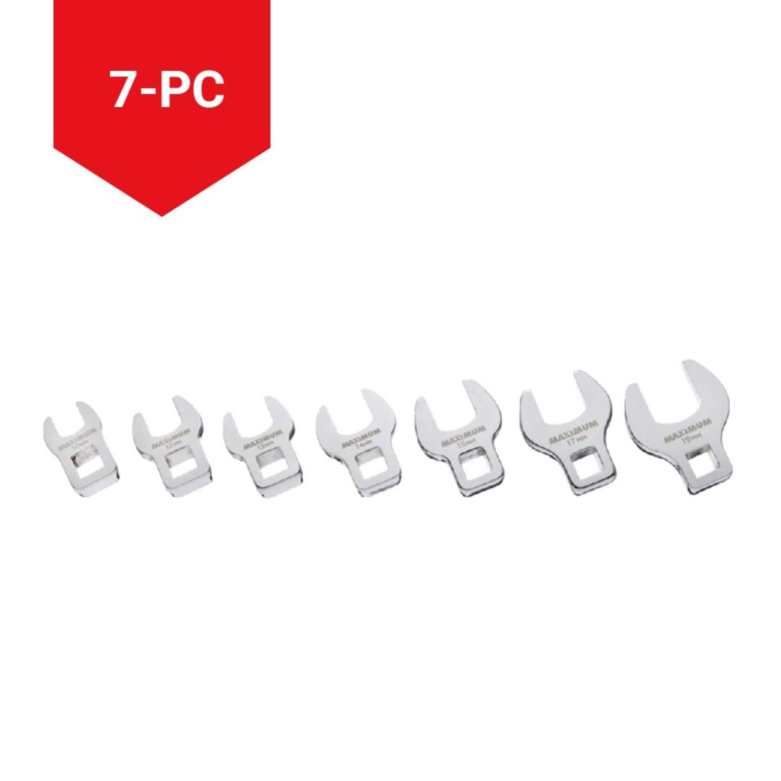 Upgrade your toolkit with the MAXIMUM 3/8-in Drive Crow Foot Wrench Set, 7-pc. These handy tools have a compact open end that makes it easy to reach those tricky spots. Each crowfoot wrench acts as an extension to a standard wrench, boosting torque and making your wrench even more efficient. Available in both metric and SAE sizes, these wrenches are built for high performance and durability. Perfect for adding to your collection of reliable tools!