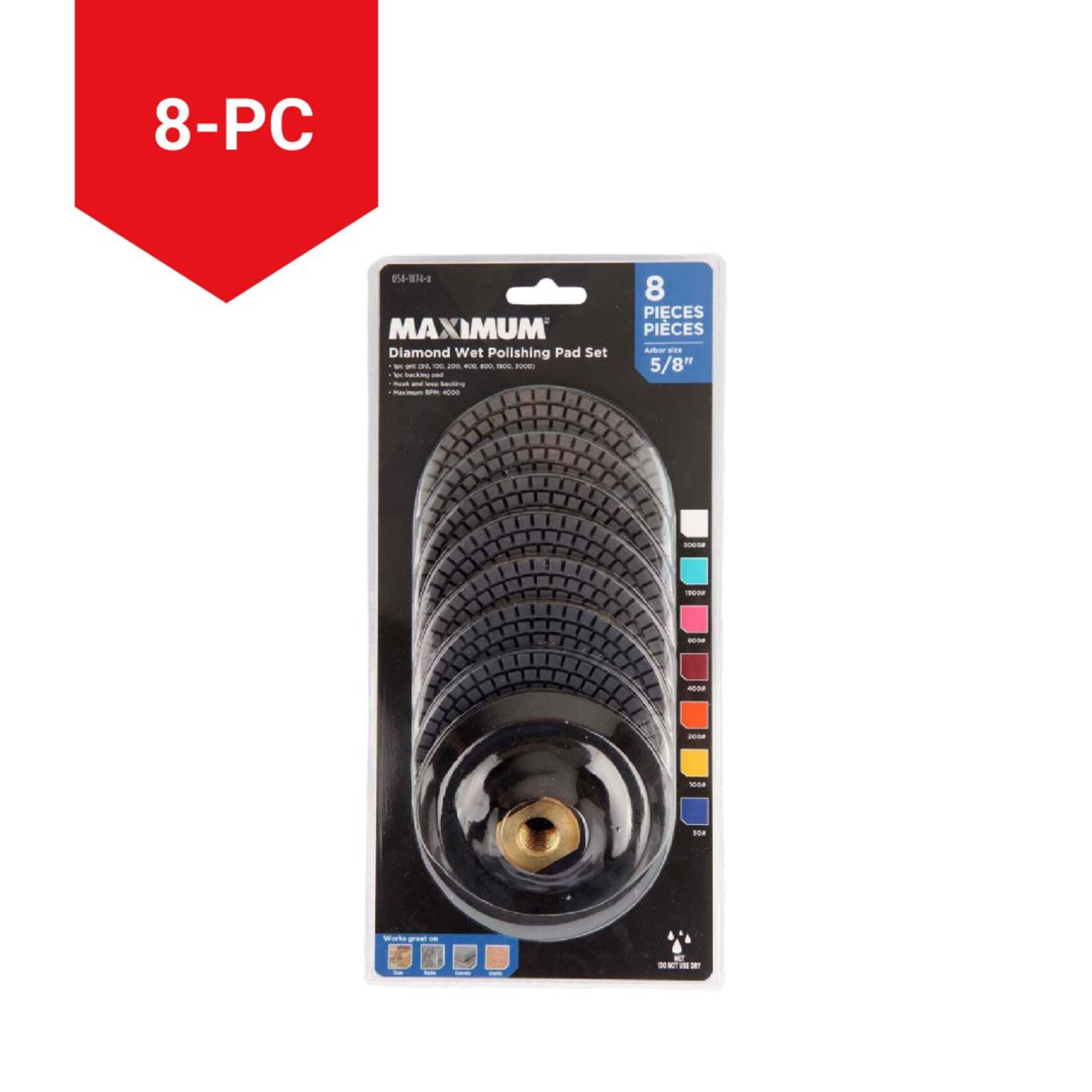 Buff your hard surfaces to a professional sheen with the MAXIMUM Diamond Polish Pads. This versatile wet-use polishing pad set works wonders on stone, marble, granite and concrete surfaces. The hook-and-loop attachment lets you change pads quickly, reducing downtime when you’re in the middle of the job. The set includes a backing pad and 50, 100, 200, 400, 800, 1500, and 3000 grits—enough to tackle the toughest polishing applications.
