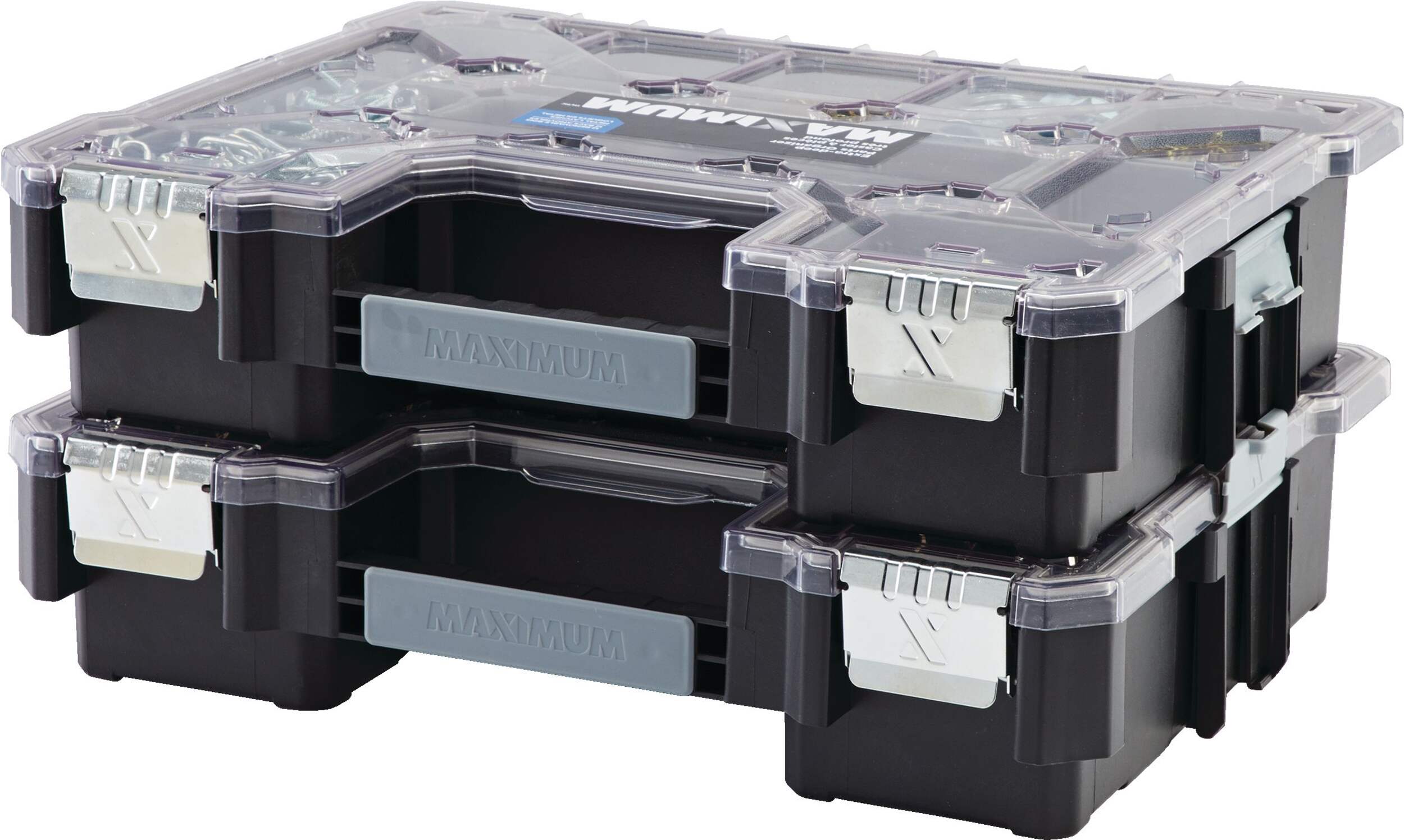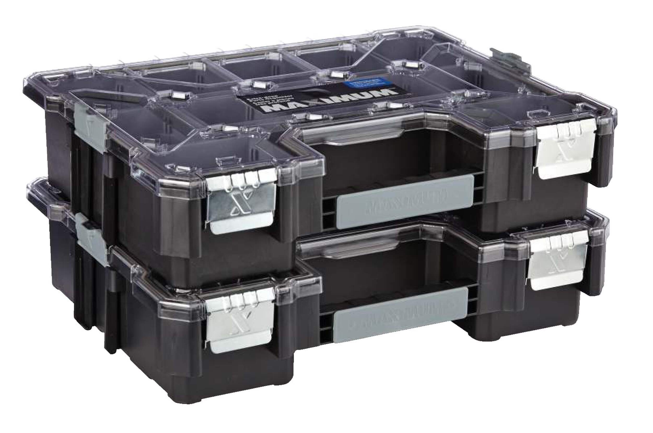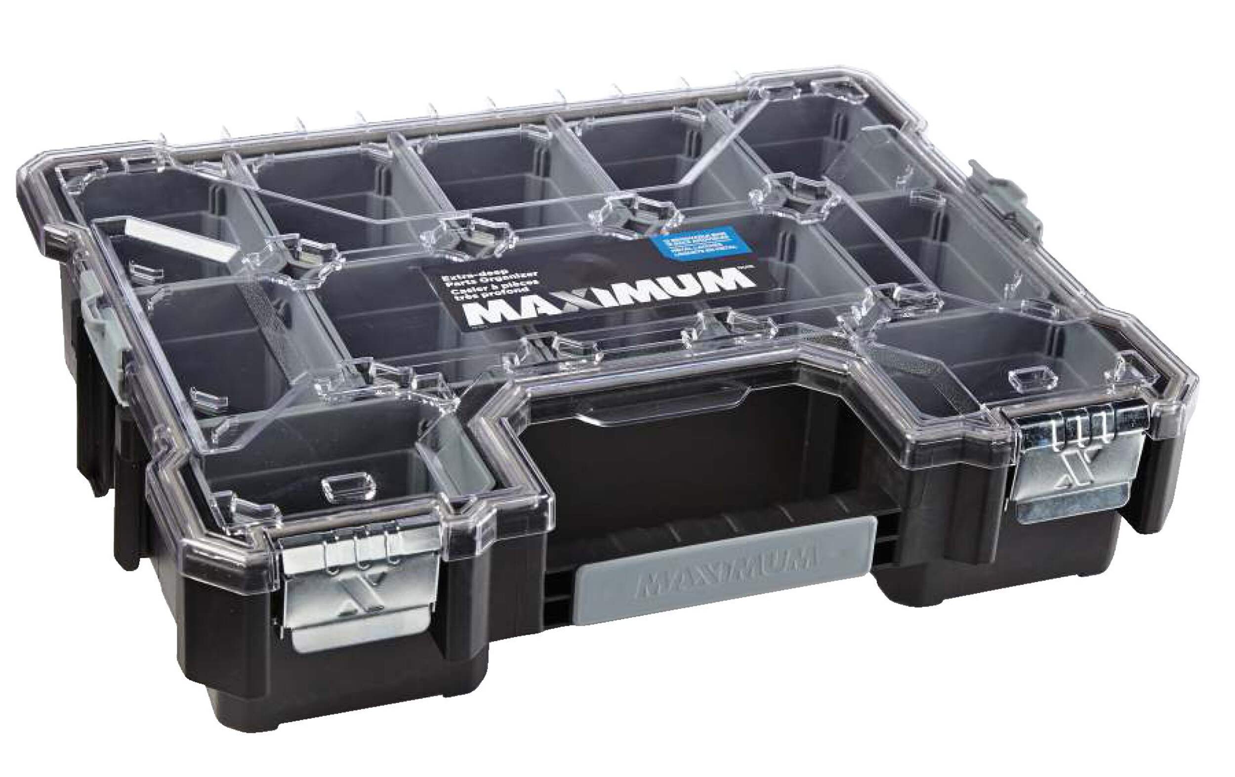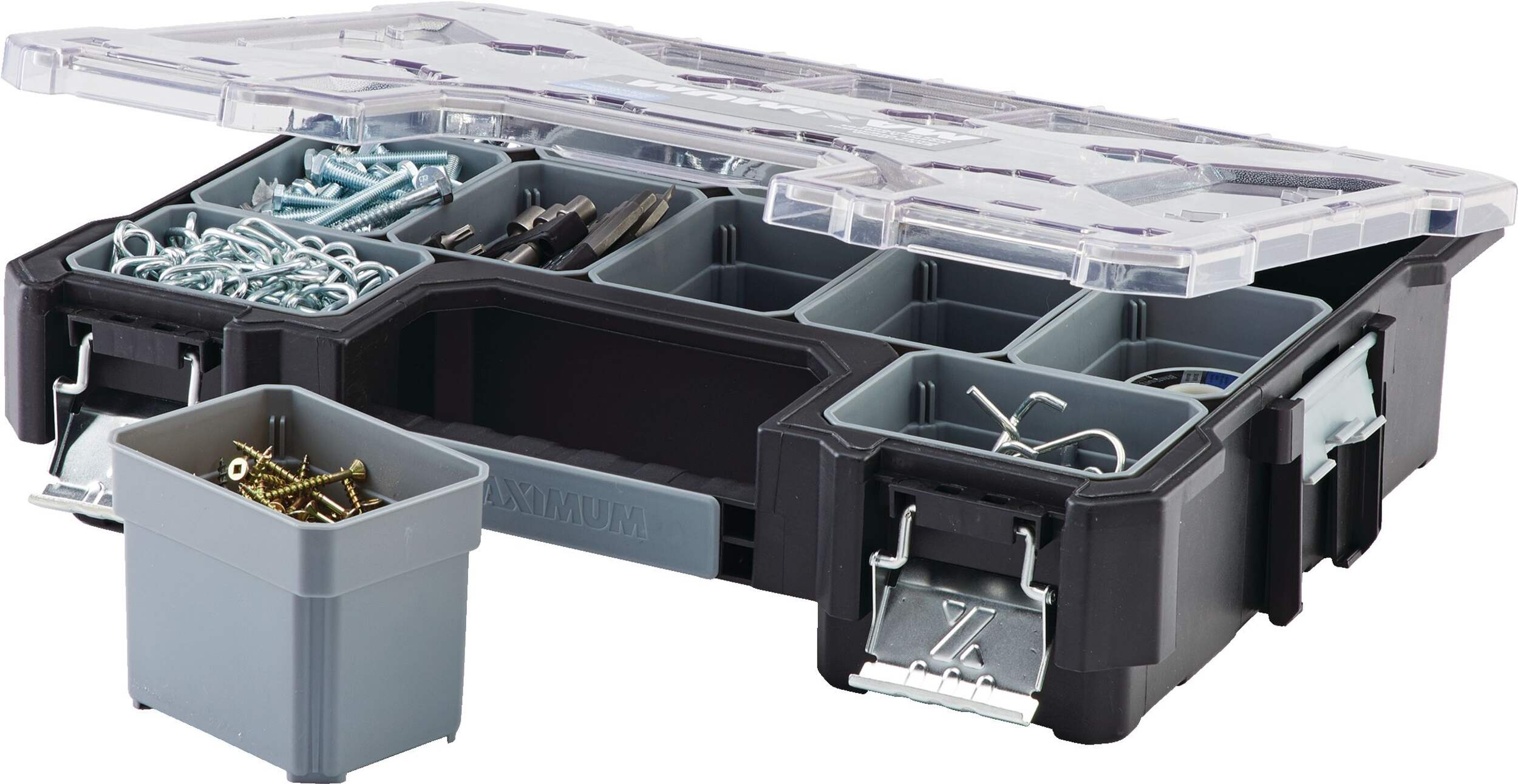 The MAXIMUM Extra-deep Parts Organizer features removable bins for storing parts, so you can declutter your workspace and get back to work. This organizer has a transparent top, allowing you to check the contents quickly when you’re trying to locate a specific item. The MAXIMUM organizer’s top locks down to help secure the contents and keep them in place, and the deep design of the bins allows for storage of larger materials. A pair of heavy-duty latches provides a final layer of additional security to ease your mind on busy jobsites. If you need to get your hand tools, fasteners, small parts, and other accessories organized, this organizing toolbox makes for an ideal storage solution.
