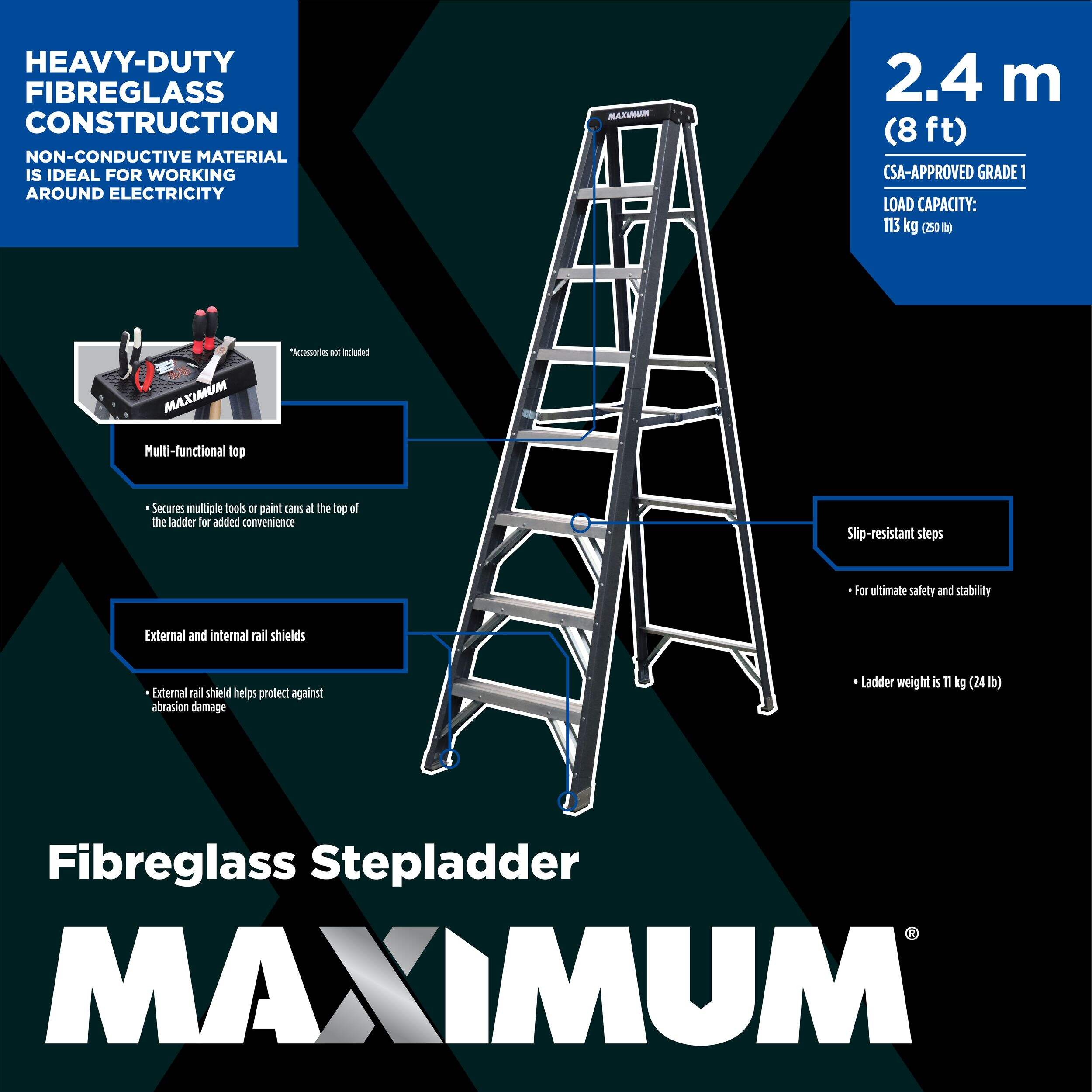 The MAXIMUM Fibreglass Industrial Step Ladder provides a robust and safe solution for industrial and home projects, with an 8-ft reach for high tasks. Constructed from durable, non-conductive fibreglass, it supports up to 250 lbs, making it suitable for various applications, including electrical work. Equipped with non-slip steps and a wide, stable base, this ladder ensures secure footing and reliability. Ideal for professionals and DIYers alike, it combines strength and safety for dependable performance in demanding environments.
