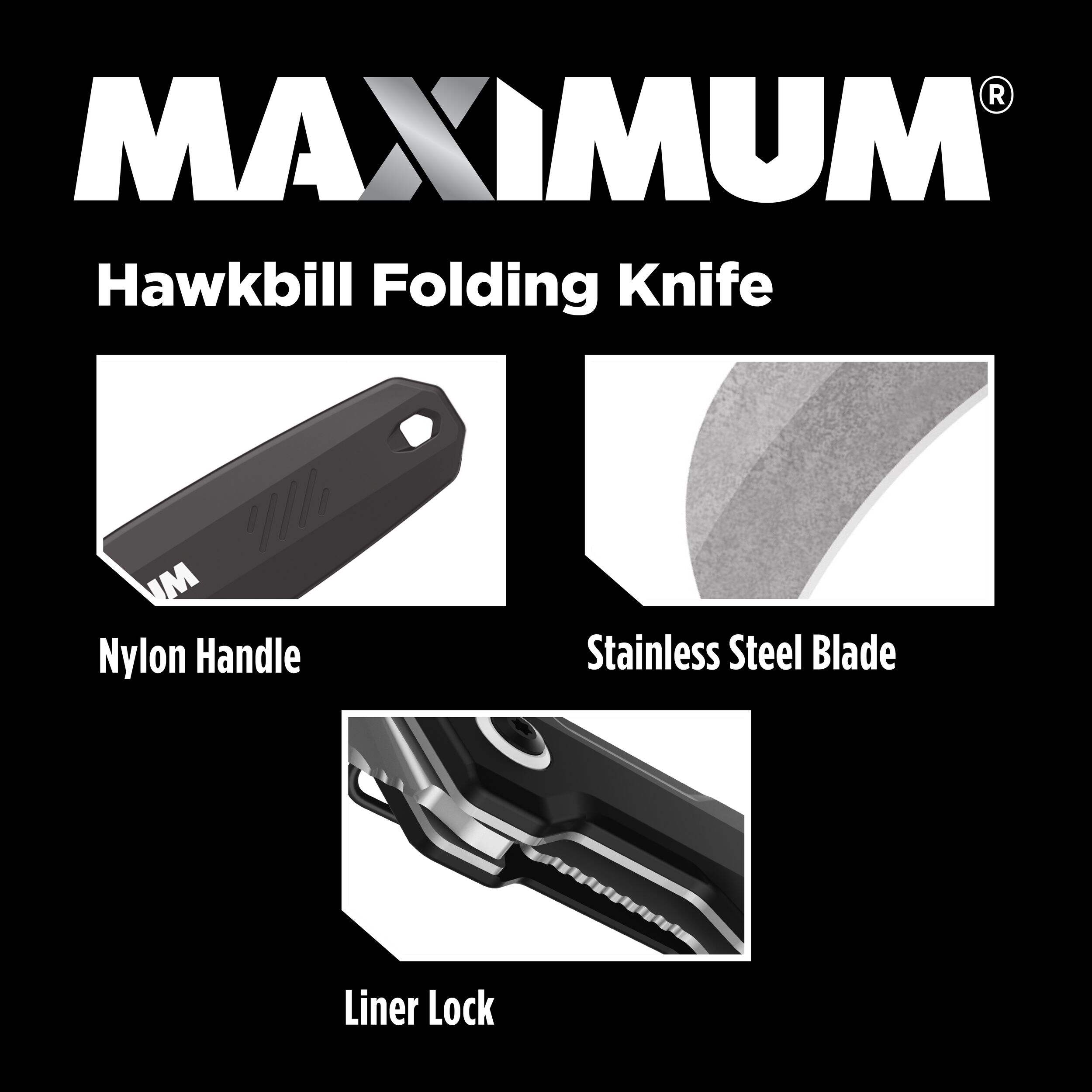 The MAXIMUM Hawkbill Utility Knife offers an essential tool for efficient cutting and scoring. Featuring a convenient one-hand opening, extra-secure locking and a folding blade design for safe storage, this durable utility knife enhances productivity in a variety of applications.