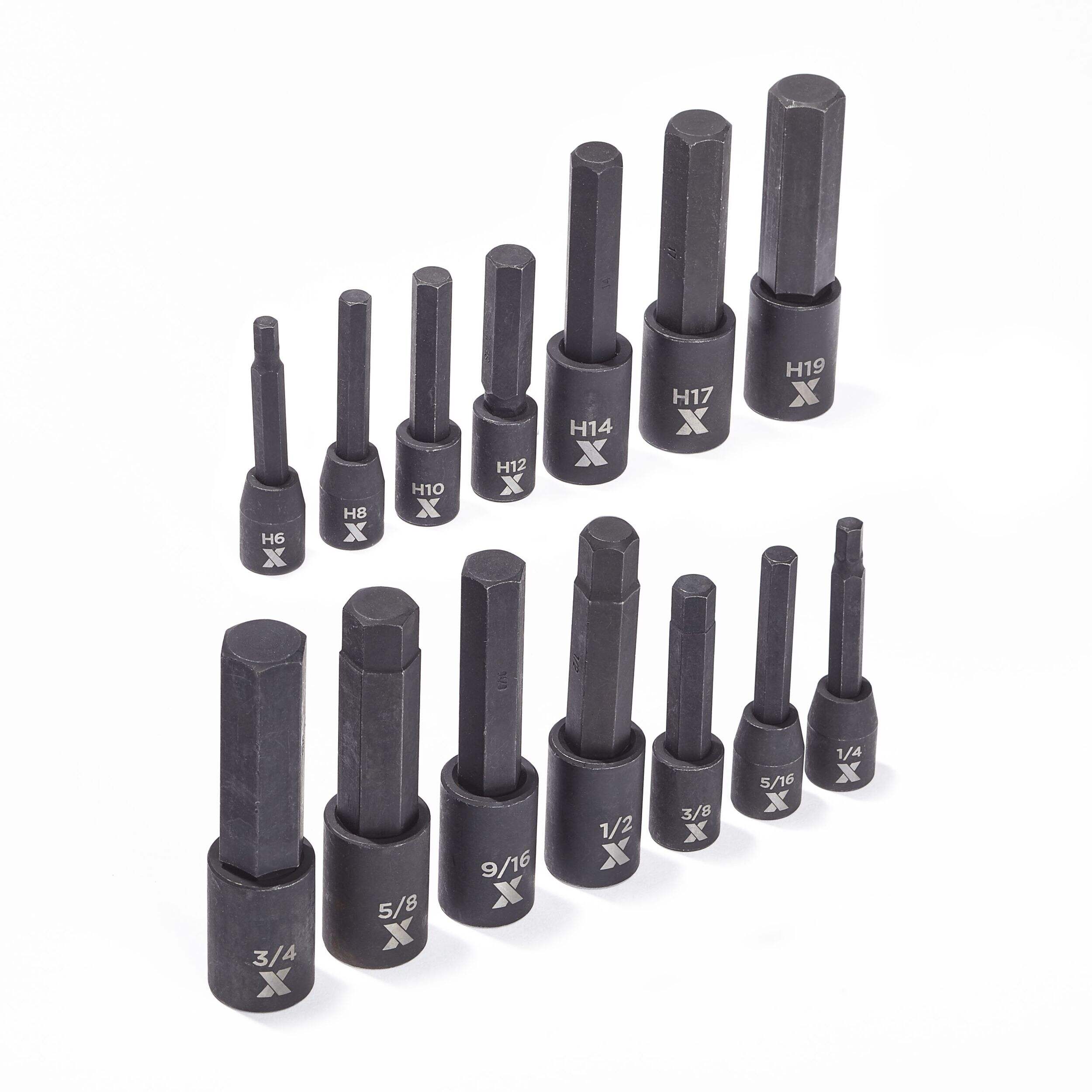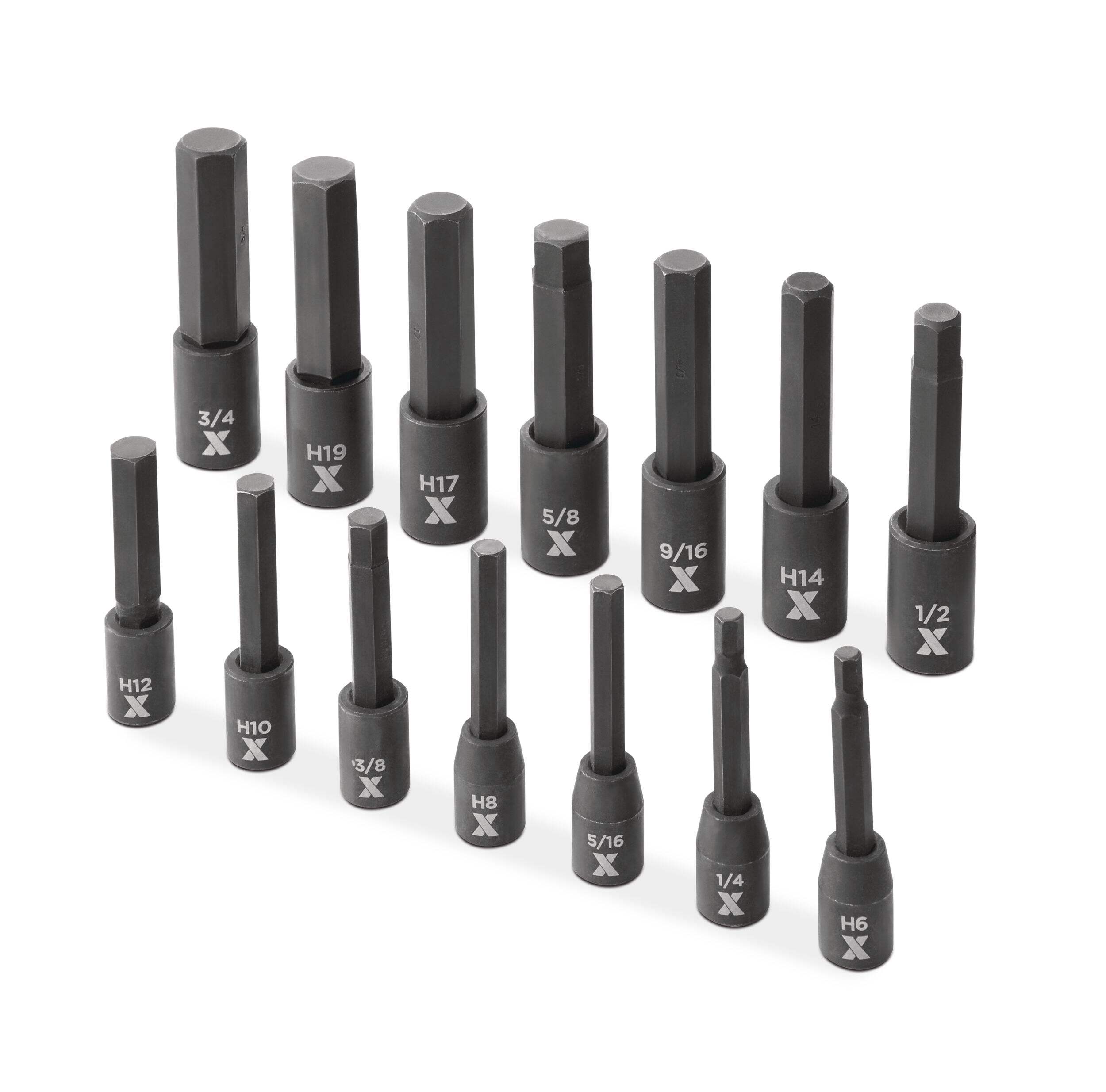 Contains 1/2" drive impact bit sockets in the following sizes: 1/2", 9/16", 5/8", 3/4", 14mm, 17mm, and 19mm