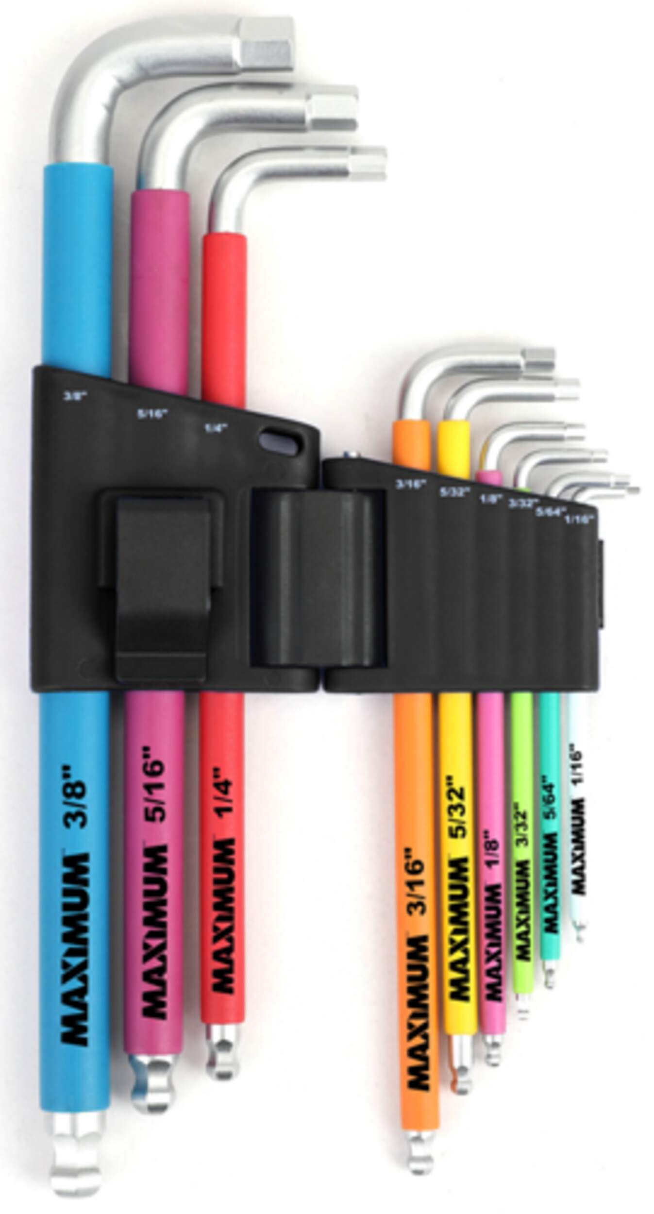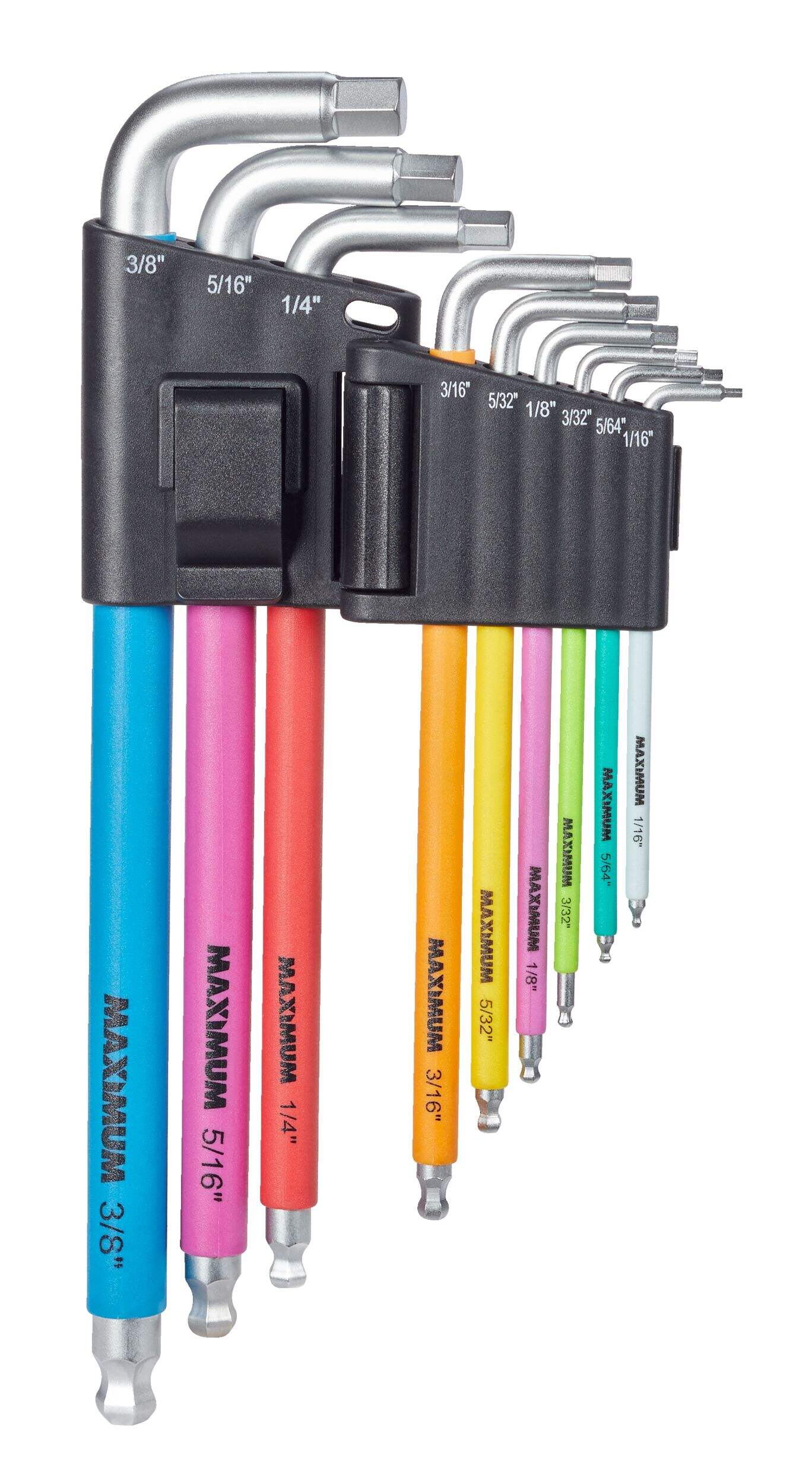 The MAXIMUM Hex Key Set in SAE sizes is an essential 9-piece tool collection designed for various fastening and assembly tasks. Engineered for durability, these hex keys ensure reliable performance in both professional and home environments. Ideal for automotive repairs, machinery maintenance, or DIY projects, this hex key set provides the functionality needed to complete tasks efficiently and with confidence.
