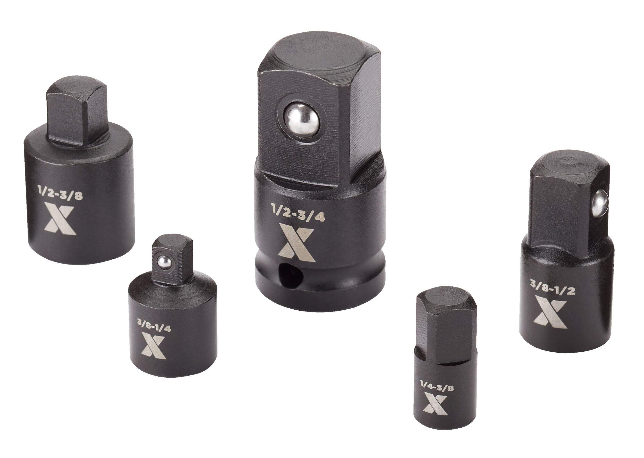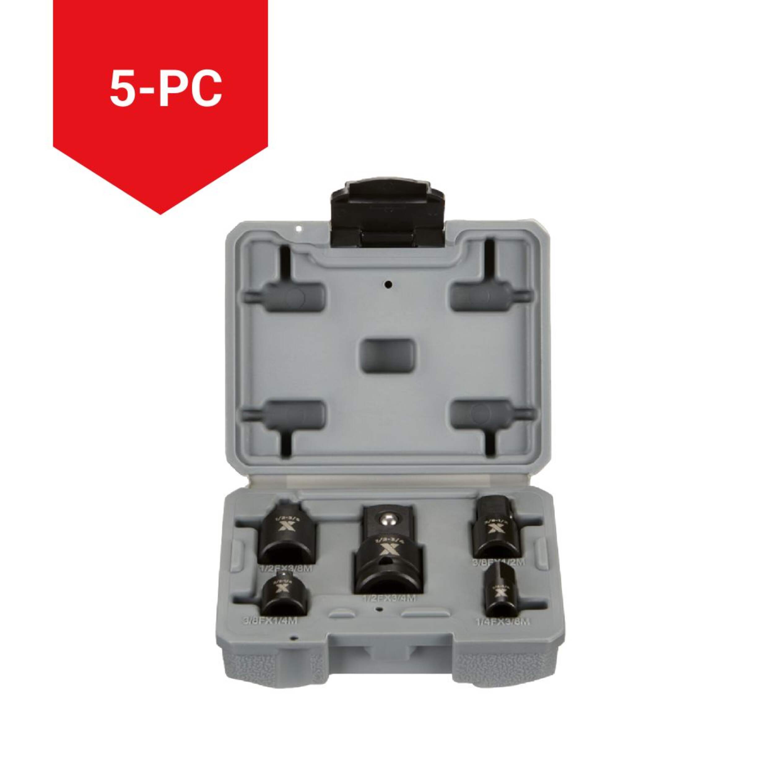 Includes 5 impact adapters: 3/8" F × 1/4" M, 1/4" F × 3/8" M, 3/8" F × 1/2" M, 1/2" F × 3/8" M, and 1/2” F × 3/4" M