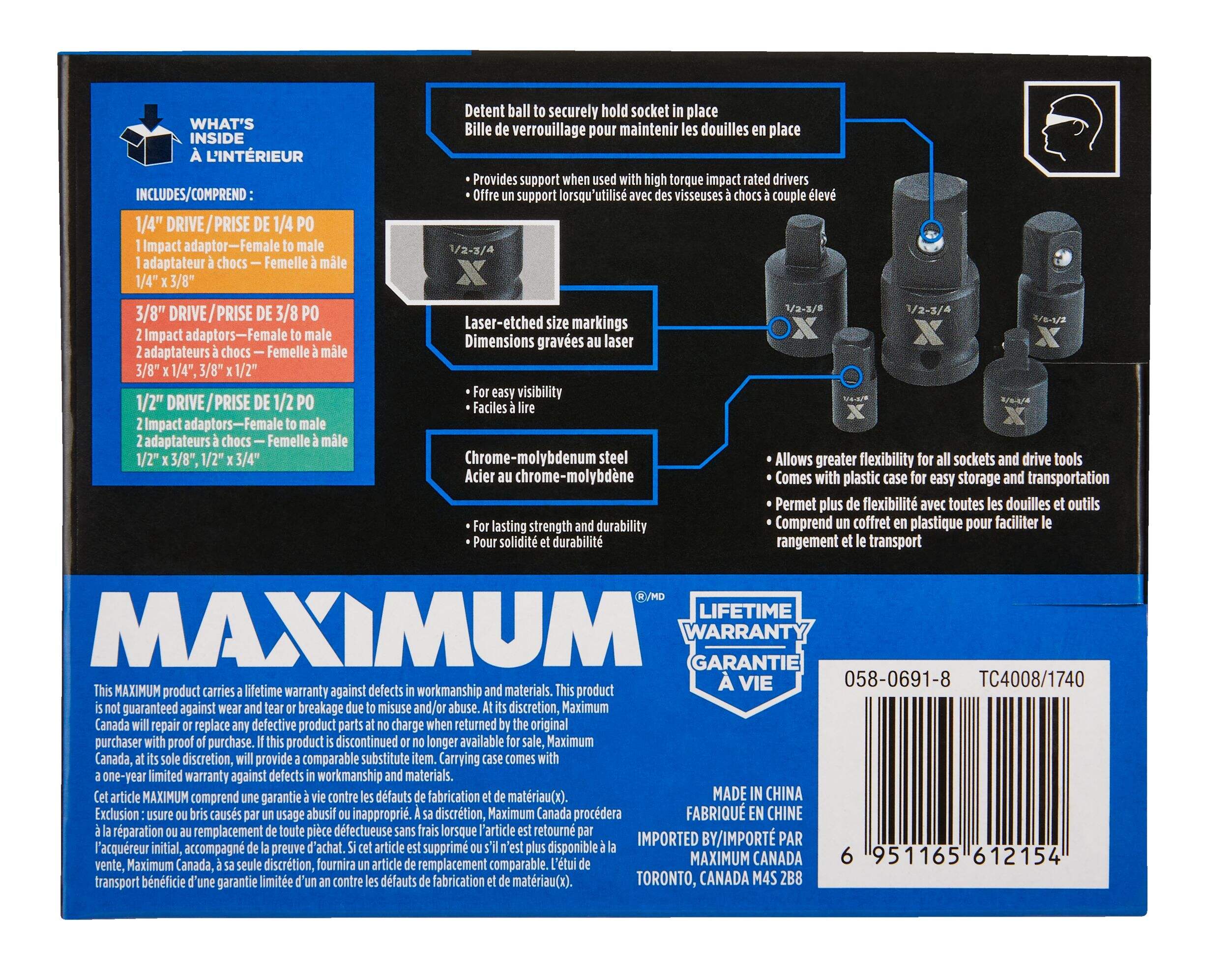 Unlock the versatility of your toolkit with the MAXIMUM Impact Adapter Set, designed to let you effortlessly use one-size drive tools with sockets and accessories of varying drive sizes. Whether you’re a professional or a DIY enthusiast, this adapter set is the perfect addition to your collection. Crafted from heat-treated chrome molybdenum steel, each adapter is forged for exceptional strength and durability. The black phosphate finish enhances corrosion resistance, ensuring your tools withstand the test of time. Plus, with laser-etched markings, size selection is quick and hassle-free, so you can spend less time searching and more time getting the job done.