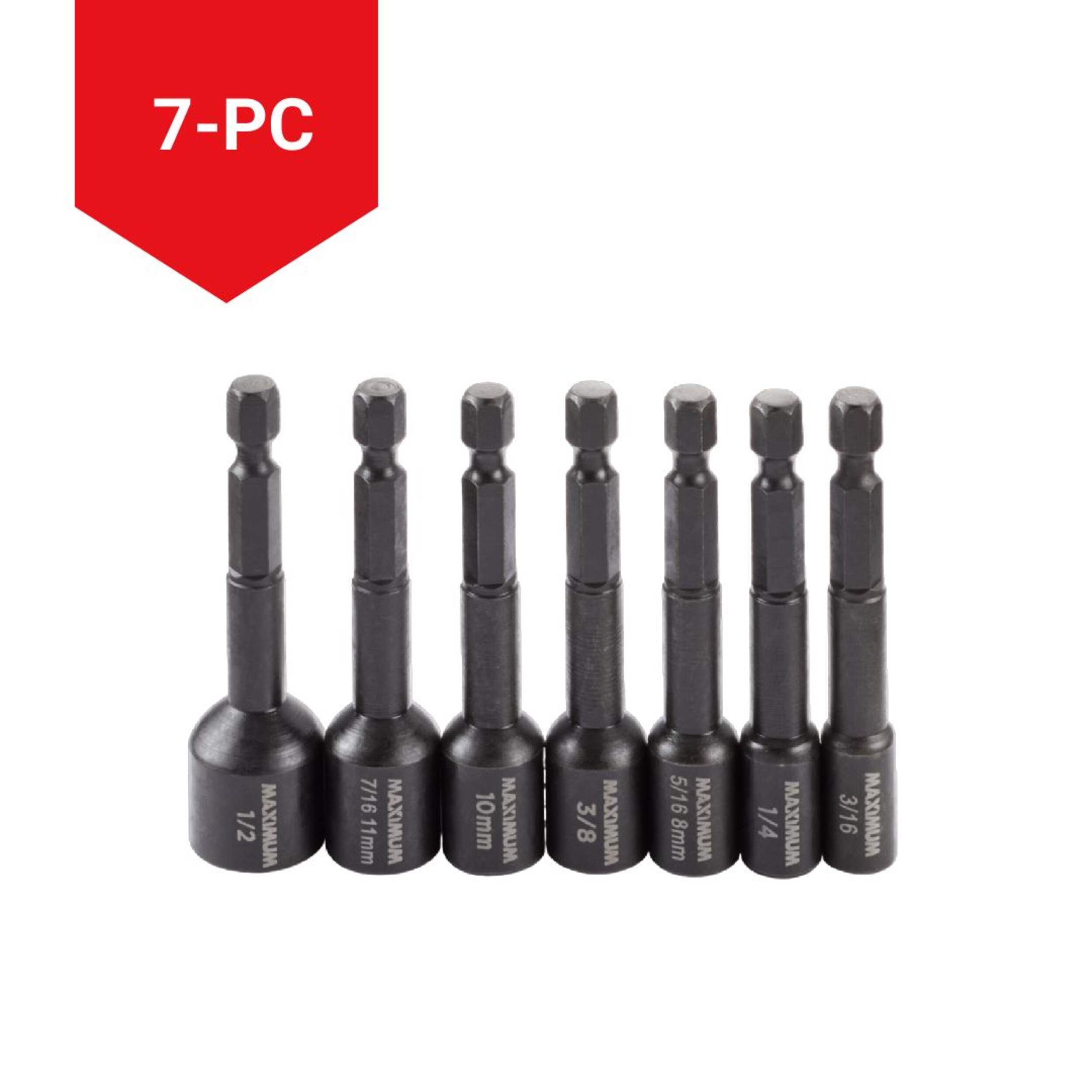 Includes 7 pieces: 3/16", 1/4", 5/16" (8mm), 3/8", 10mm, 7/16" (11mm), 1/2"