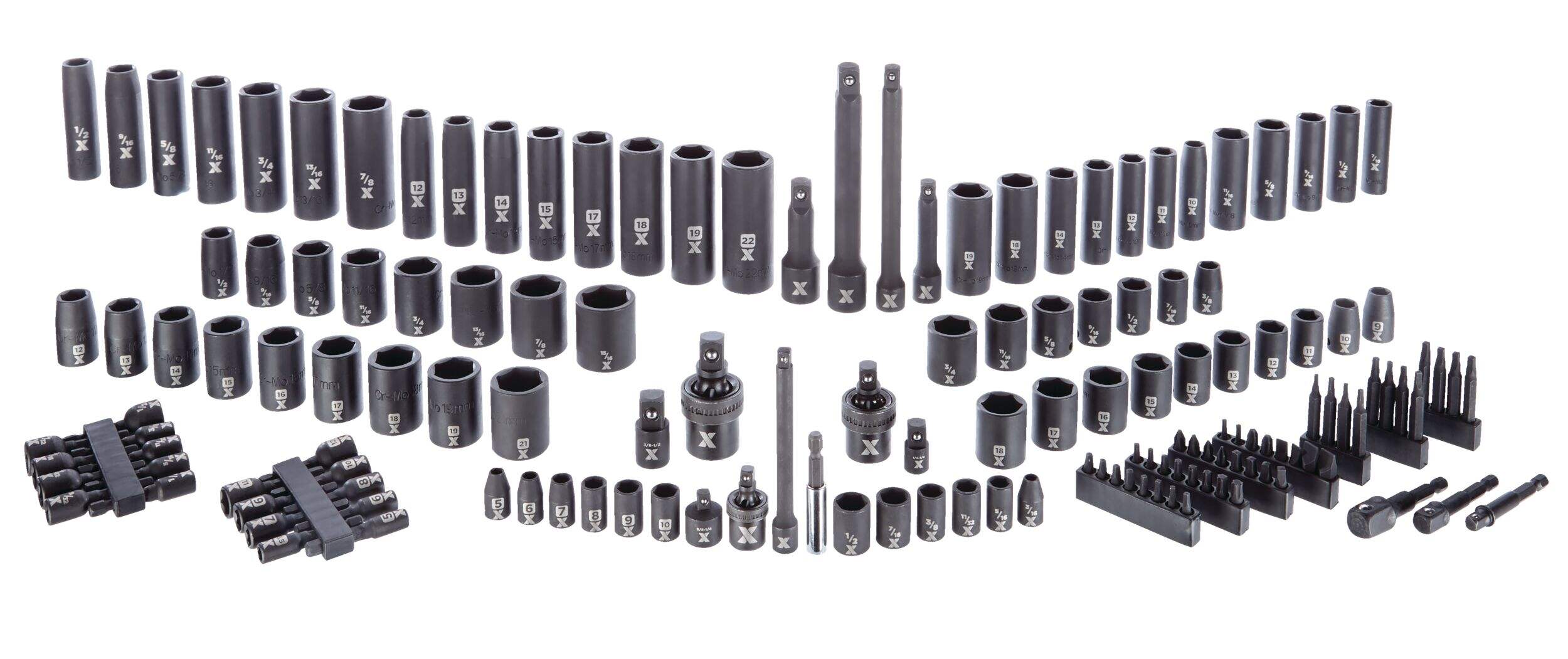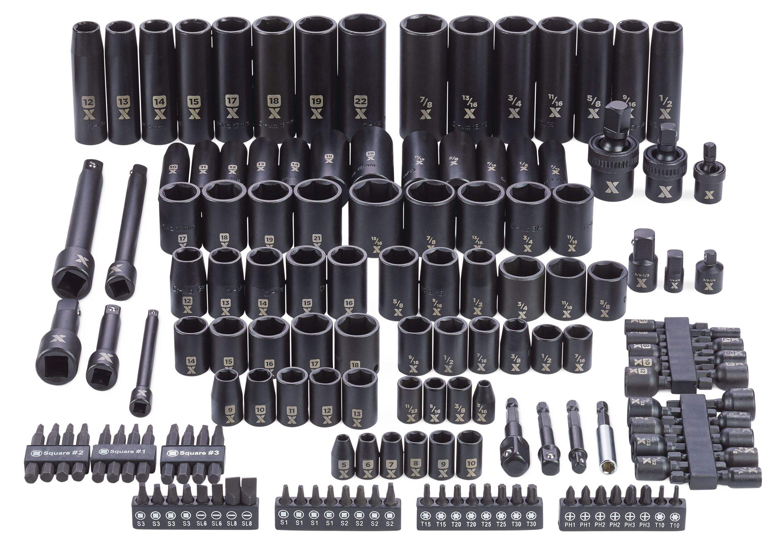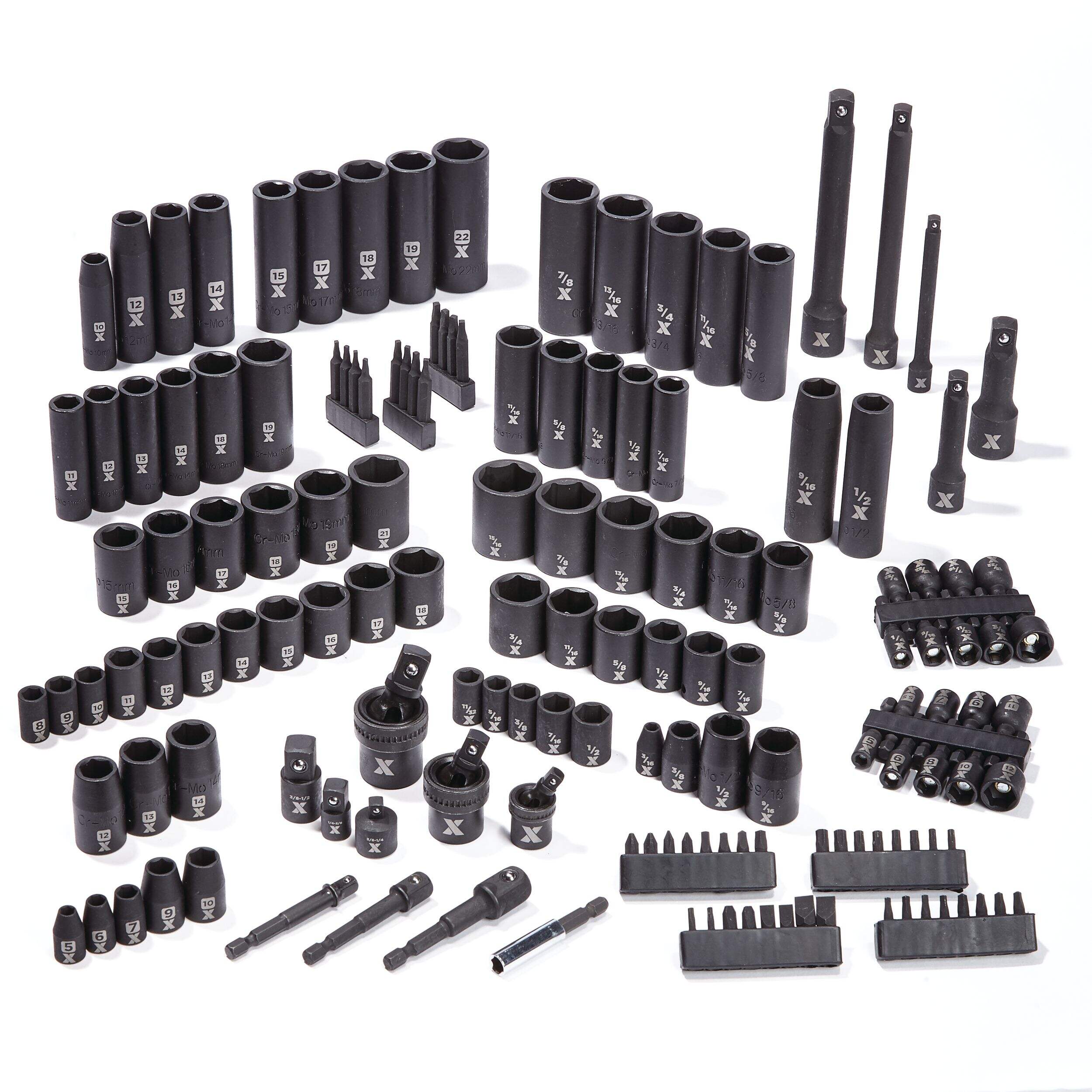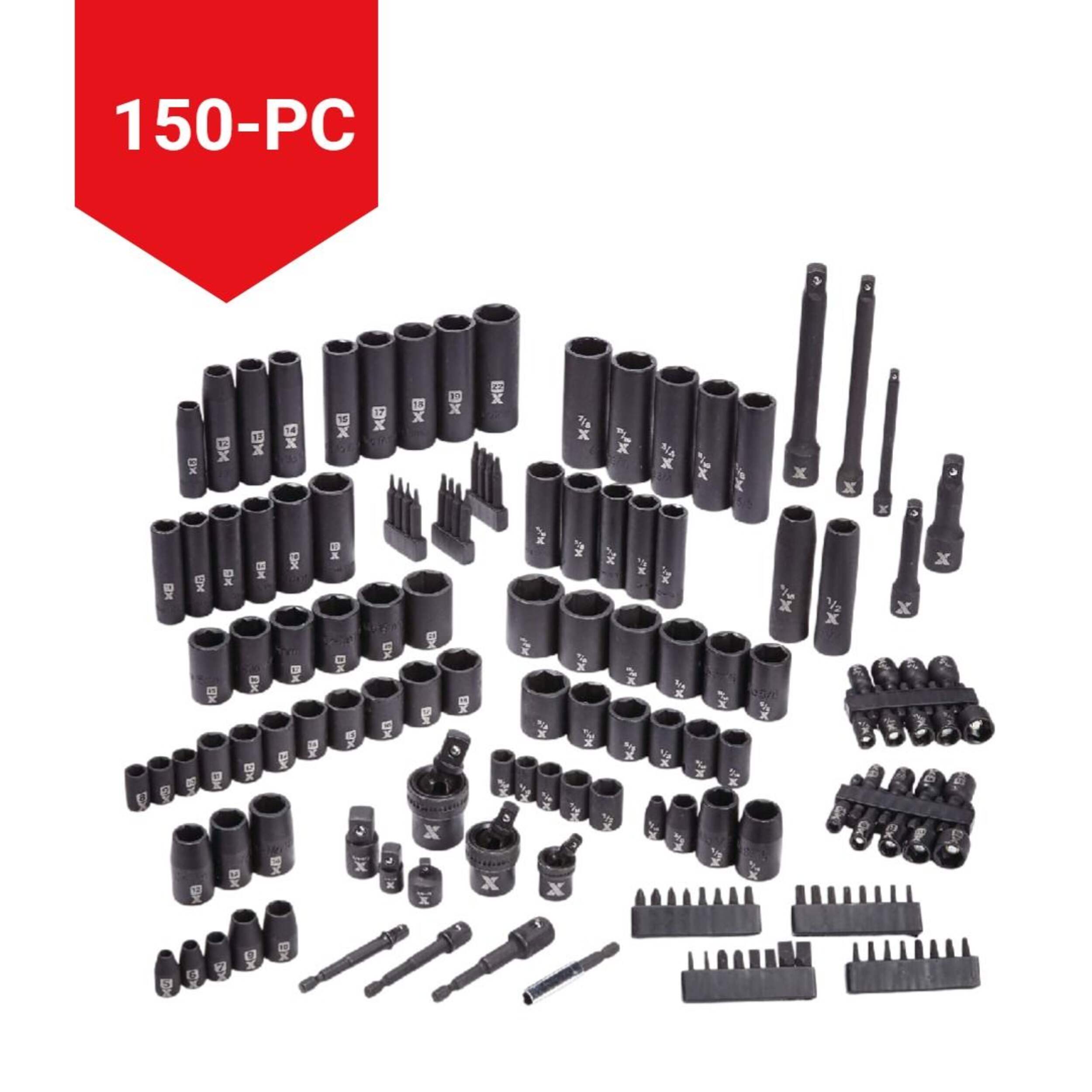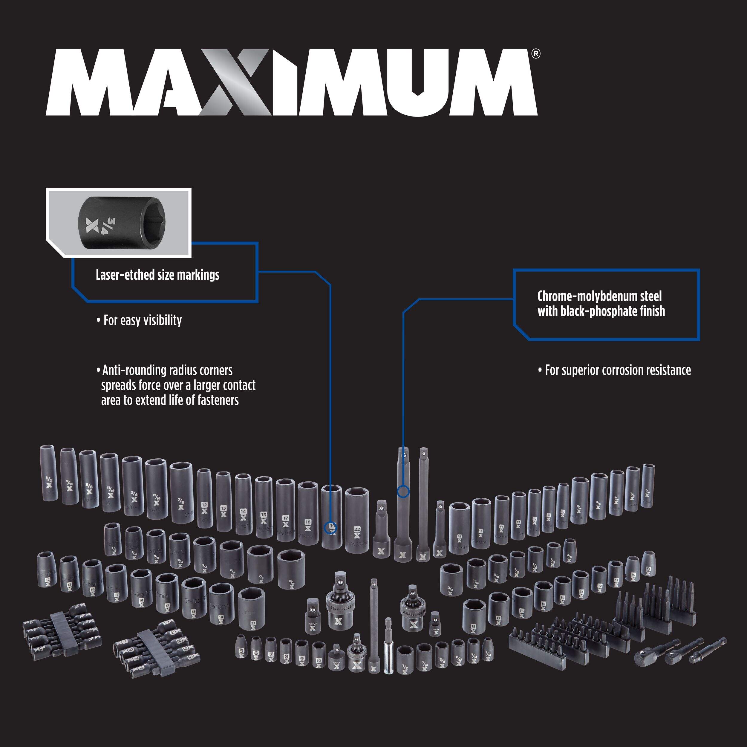 The MAXIMUM Professional Grade Impact Socket Set, 150-pc, is built for tough jobs in the garage or shop, offering dependable and long-lasting performance. The anti-rounding radius corners help spread force over a larger contact area, prolonging the life of fasteners and tools alike. The set includes SAE and metric sockets and accessories across various drive sizes, making it versatile for a range of automotive and mechanical tasks.