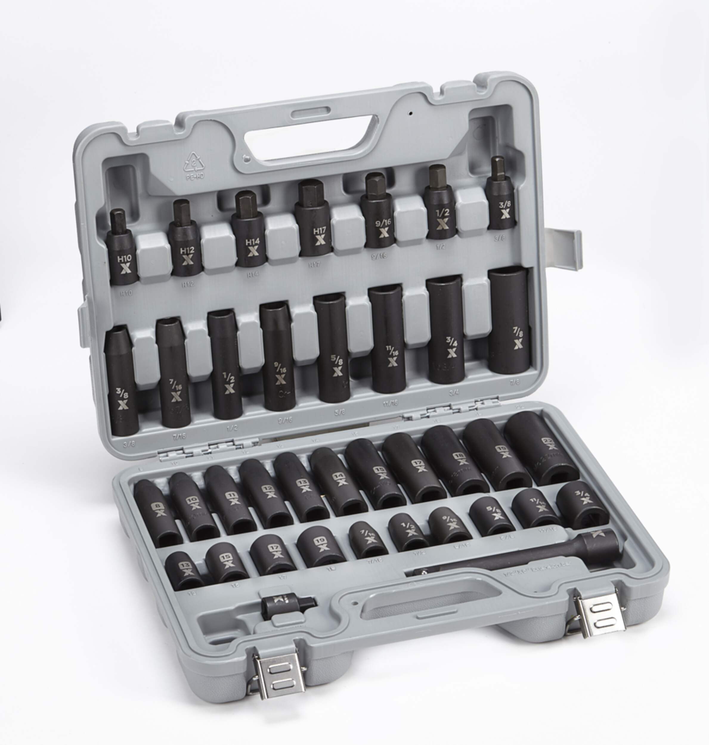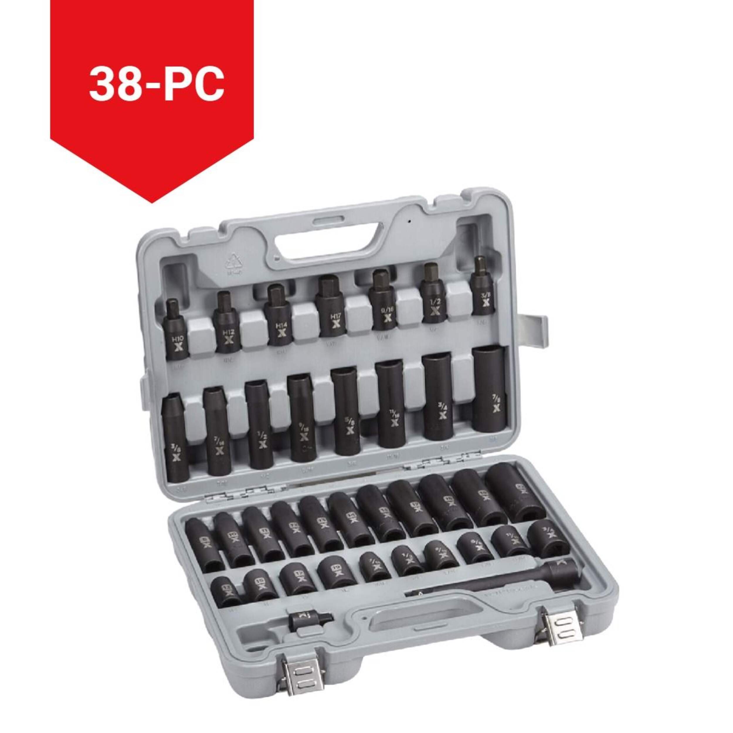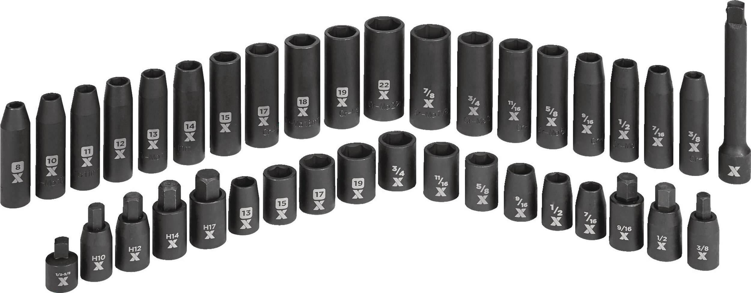 Includes 1/2" drive deep impact sockets in the following sizes: 3/8", 7/16", 1/2", 9/16", 5/8", 11/16", 3/4", 7/8", 8mm, 10mm, 11mm, 12mm, 13mm, 14mm, 15mm, 17mm, 18mm, 19mm, and 22mm