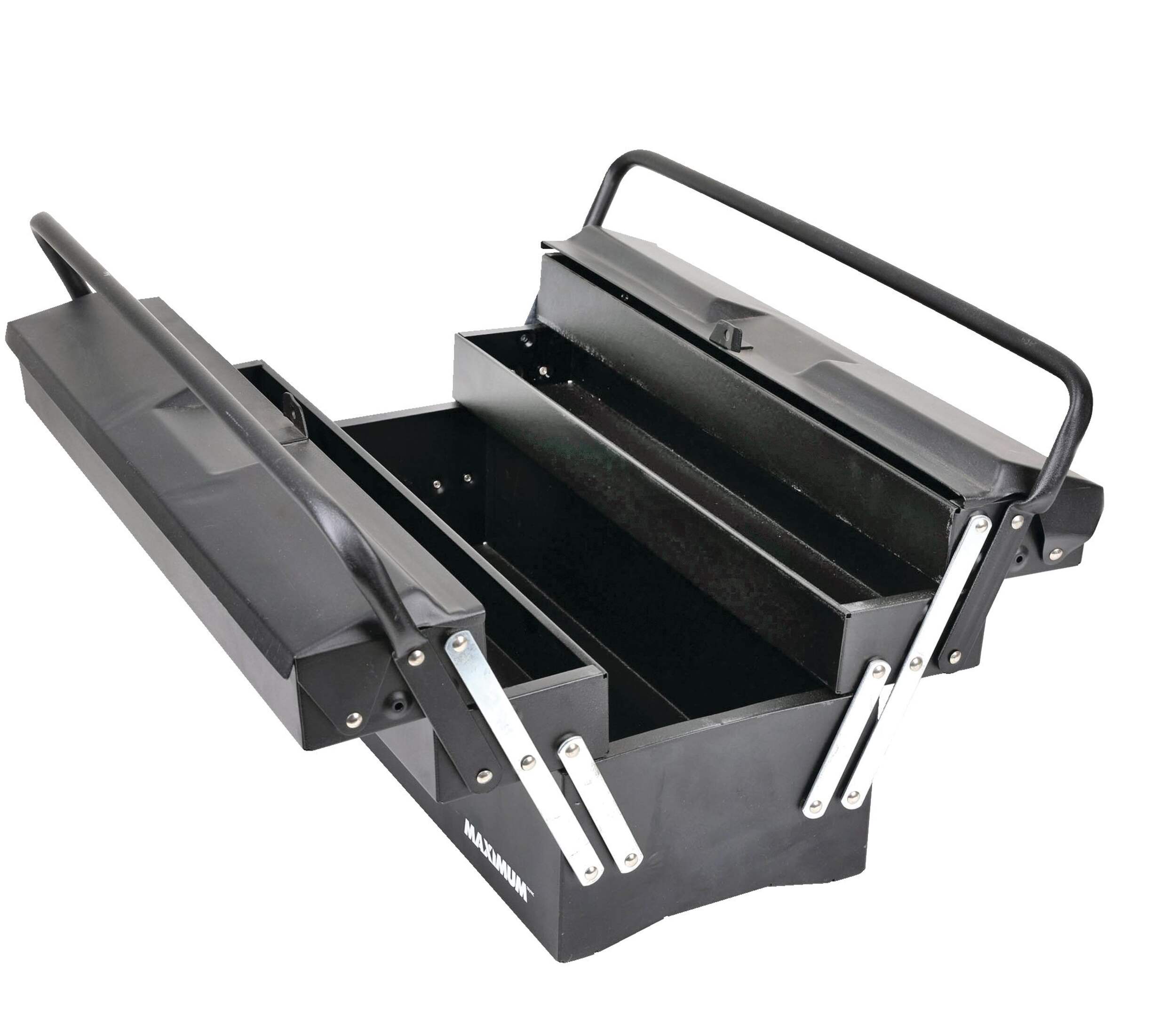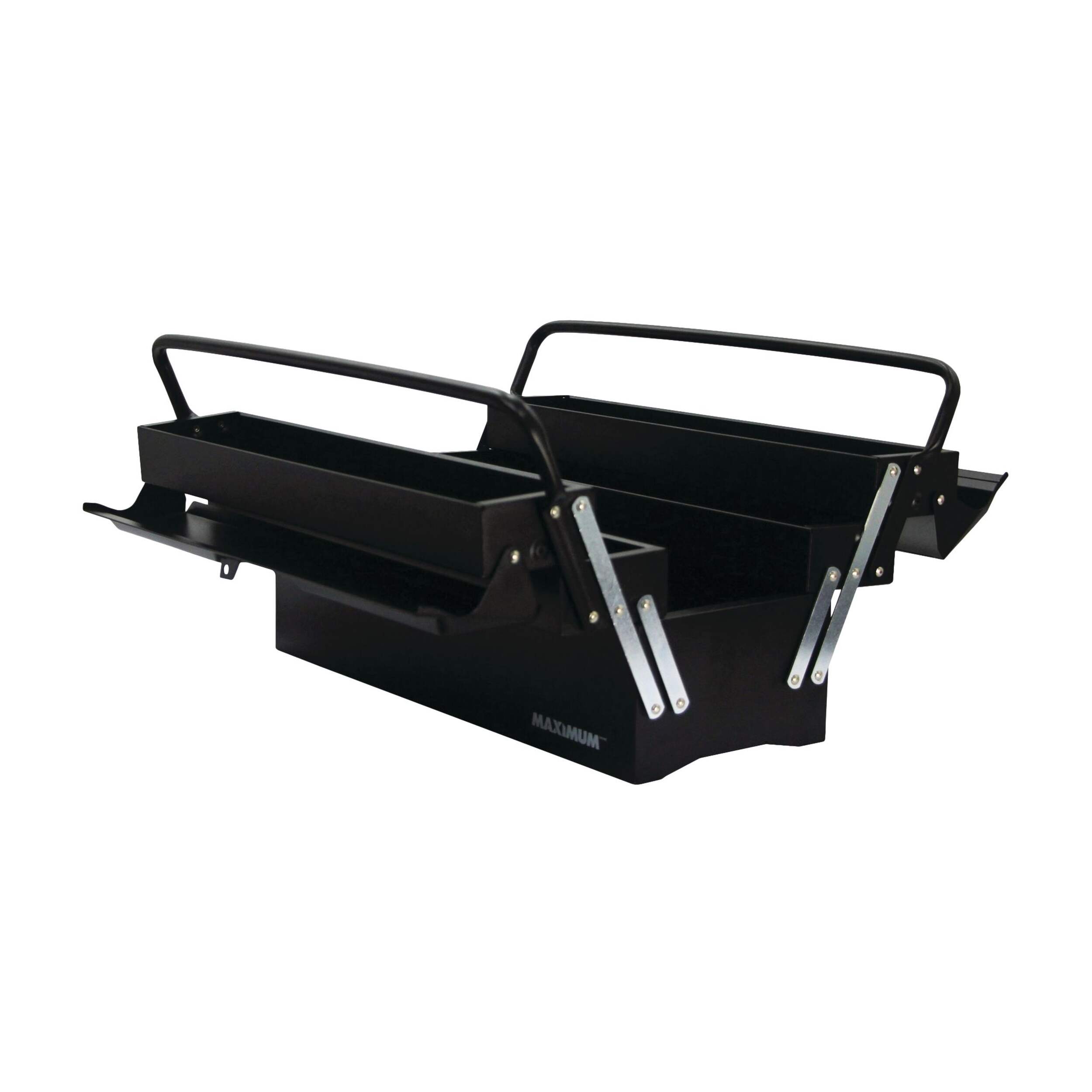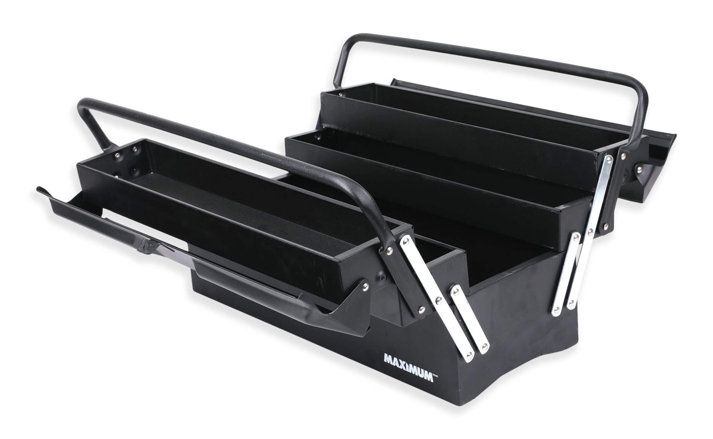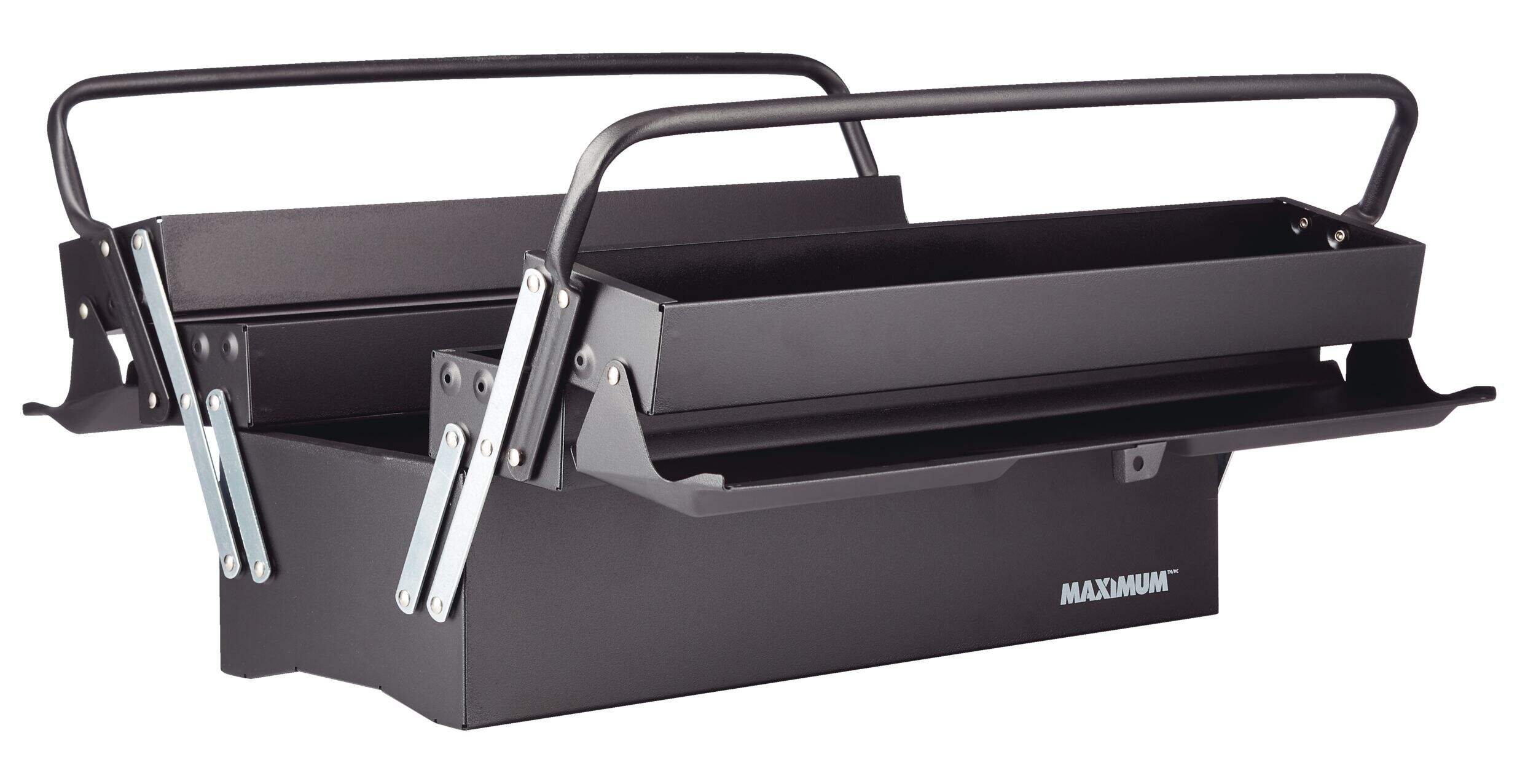 The MAXIMUM 5-Tray Cantilever Tool Box is expertly crafted from cold-rolled steel, making it robust enough to withstand tough work environments. Coated with an industrial-grade powder finish, it resists scratches and corrosion, ensuring long-lasting durability. The toolbox features a metal latch that can be padlocked for added peace of mind. With ample storage space, this versatile tool chest is ideal for ongoing projects and jobs. The built-in cantilever design keeps the trays organized, allowing for quick and easy access to all your tools and accessories in this expanding storage solution.