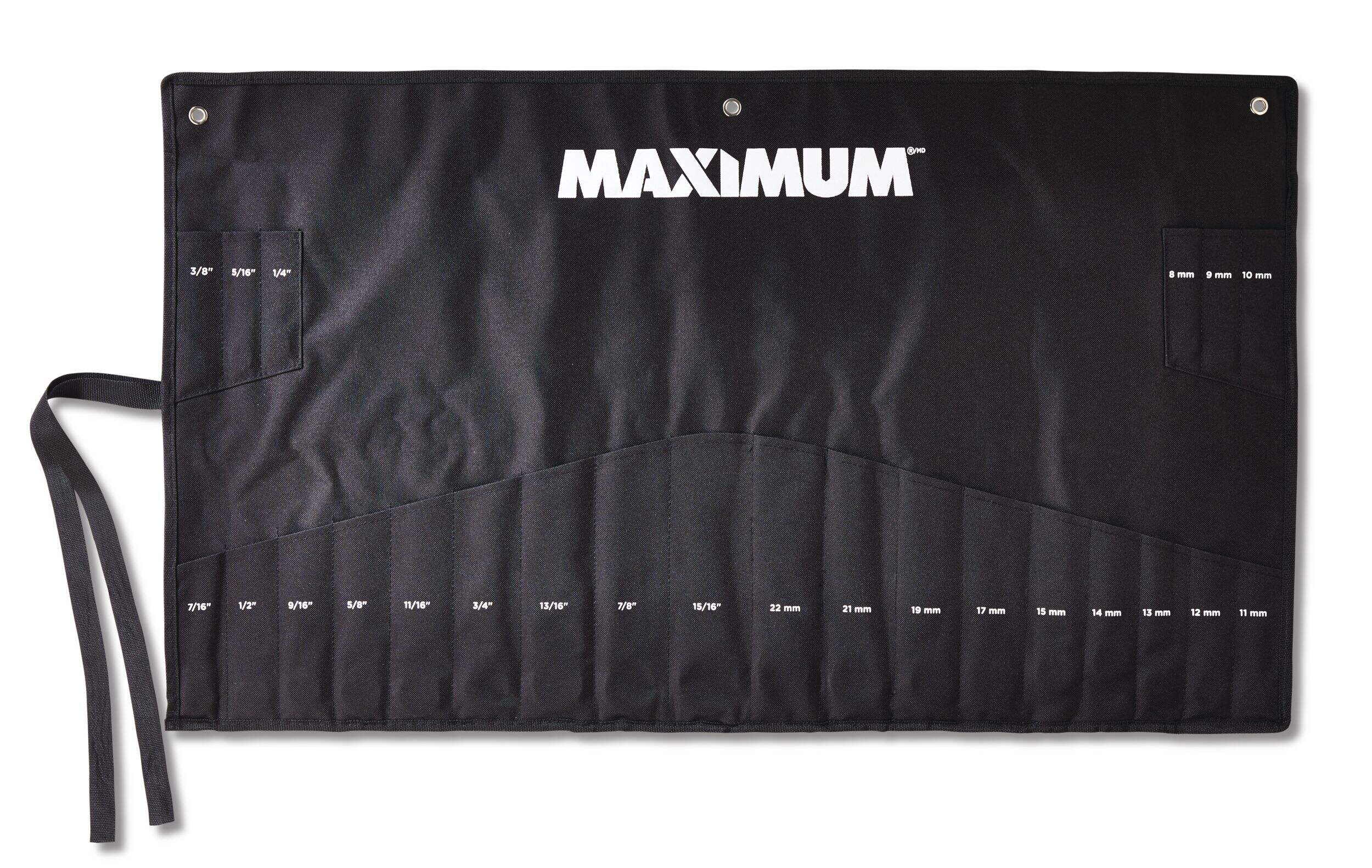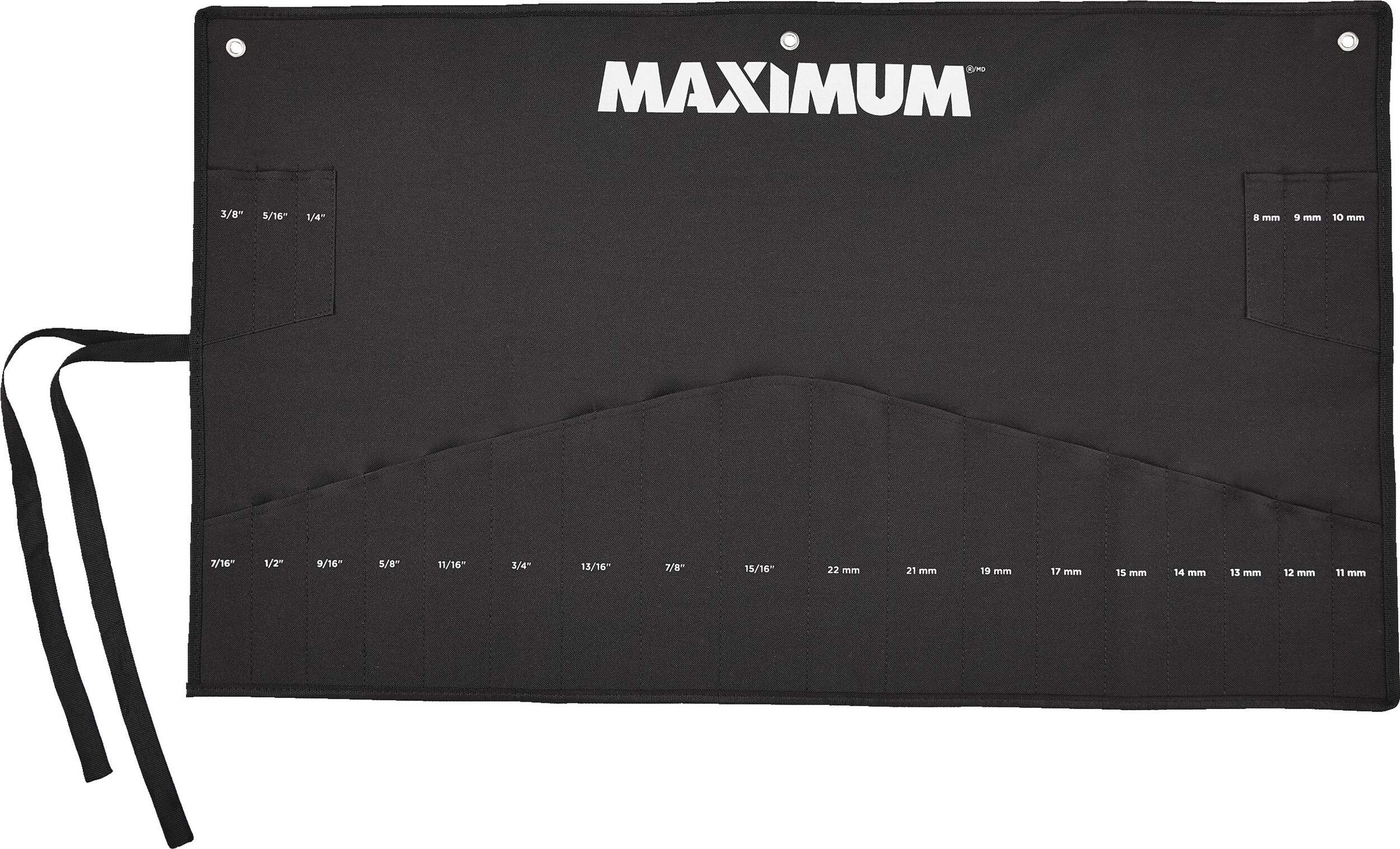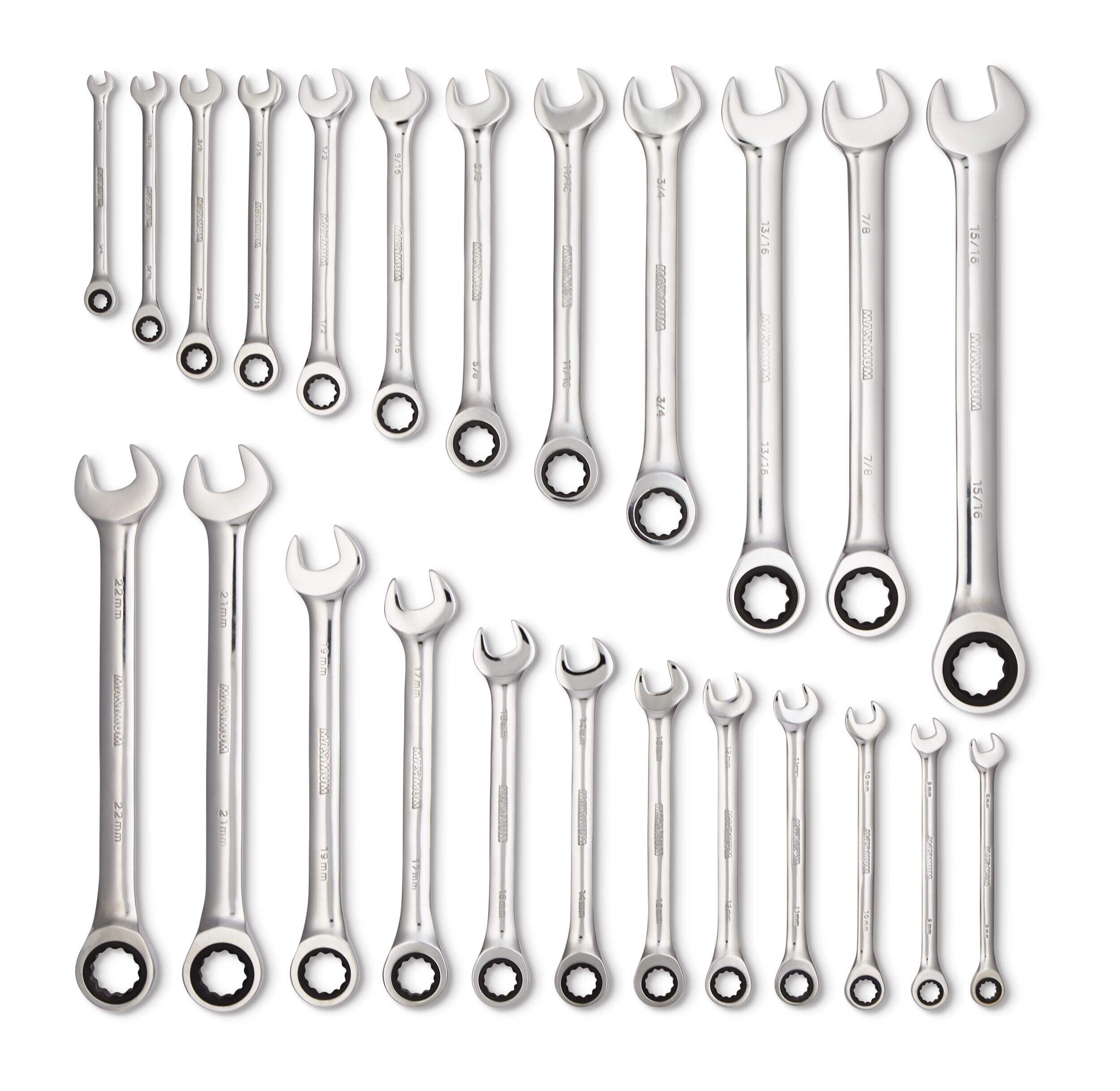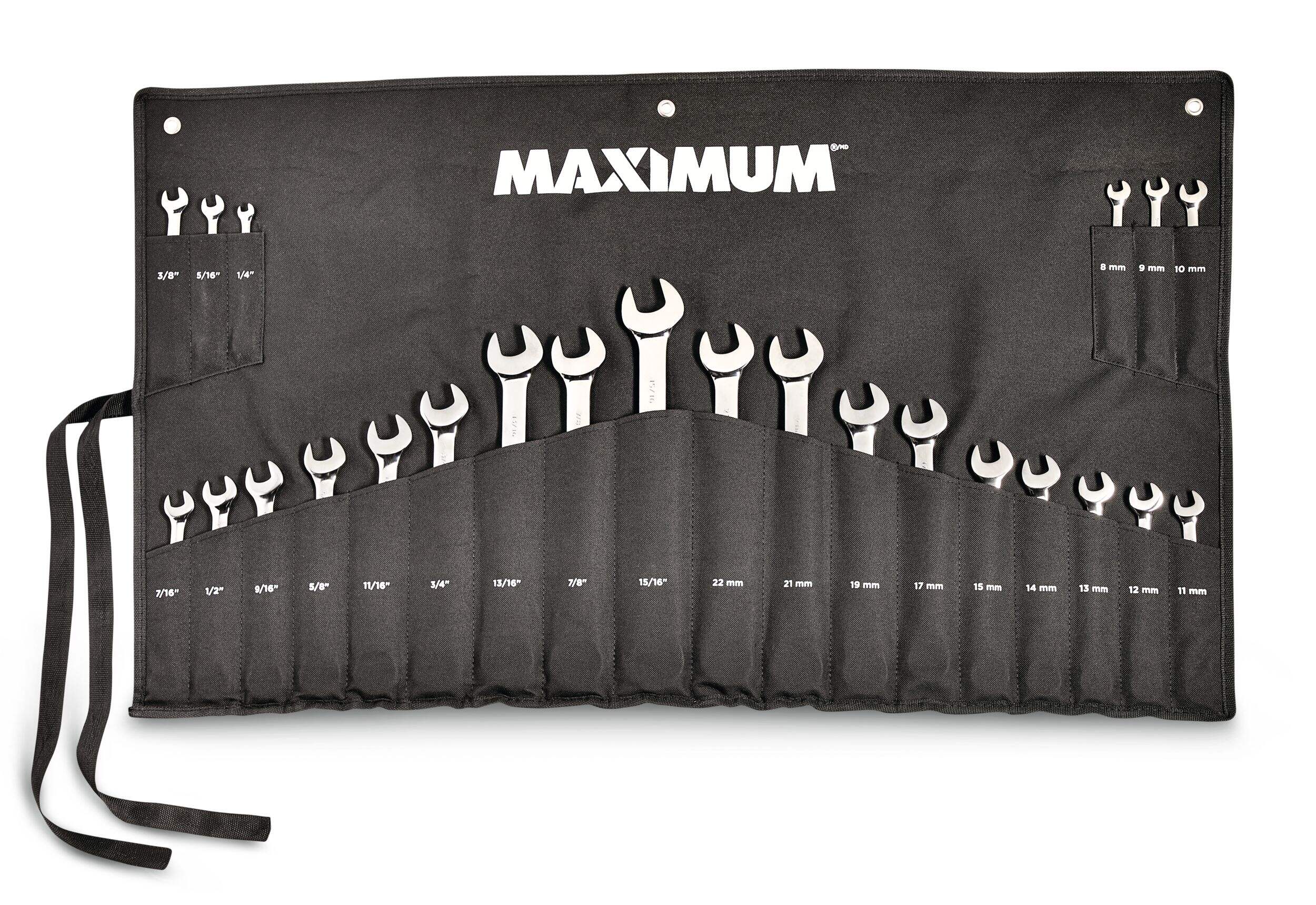 Tackle tough tasks and keep your supplies organized thanks to the MAXIMUM Professional Grade Ratcheting Wrench Set with Roll Case, 24-pc. Each ratcheting wrench is made from chrome-vanadium steel for superior toughness and wear resistance. This spanner set has a fully polished mirror finish for easy cleaning. Each wrench is designed to require as little as 5゚of swing arc to move a fastener. The Surface Drive® box end virtually eliminates rounding of fasteners, while the thin head and handle allow access to hard-to-reach areas. Variety is key, and within this wrench set you’ll find assorted sizes of 24 wrenches: 12 SAE wrenches and 12 metric wrenches. For added convenience, this set includes a roll up wrench pouch which holds all 24 ratcheting wrenches. The pouch is made from heavy-duty oxford cloth and has 3 metal grommets for easy hanging. Each top-grade spanner is engineered for high performance and superior durability, and thanks to a lifetime exchange warranty, these tools will provide many years of use.