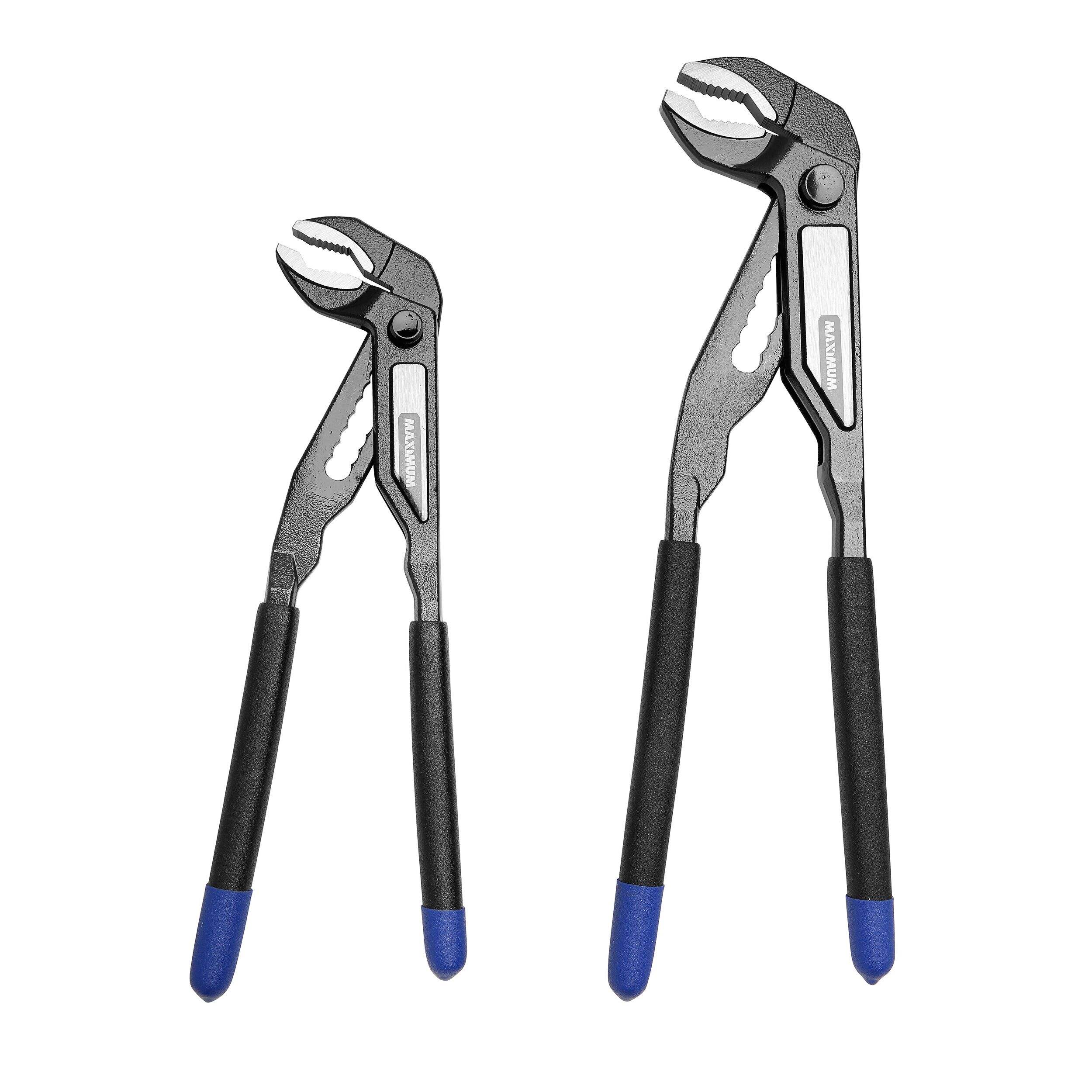 The MAXIMUM Tongue and Groove Pliers Set is designed for efficiency and ease, featuring a push-button mechanism for quick size adjustments and secure locking. The V-shaped jaw grips a variety of shapes, ideal for holding pipes and angular profiles. Constructed from high-quality forged tool steel, these pliers offer superior strength and durability, while induction-hardened teeth and jaws ensure a reliable grip. The extra narrow heads allow for easy access in tight spaces, and the soft vinyl grips provide enhanced control and comfort during extended use.