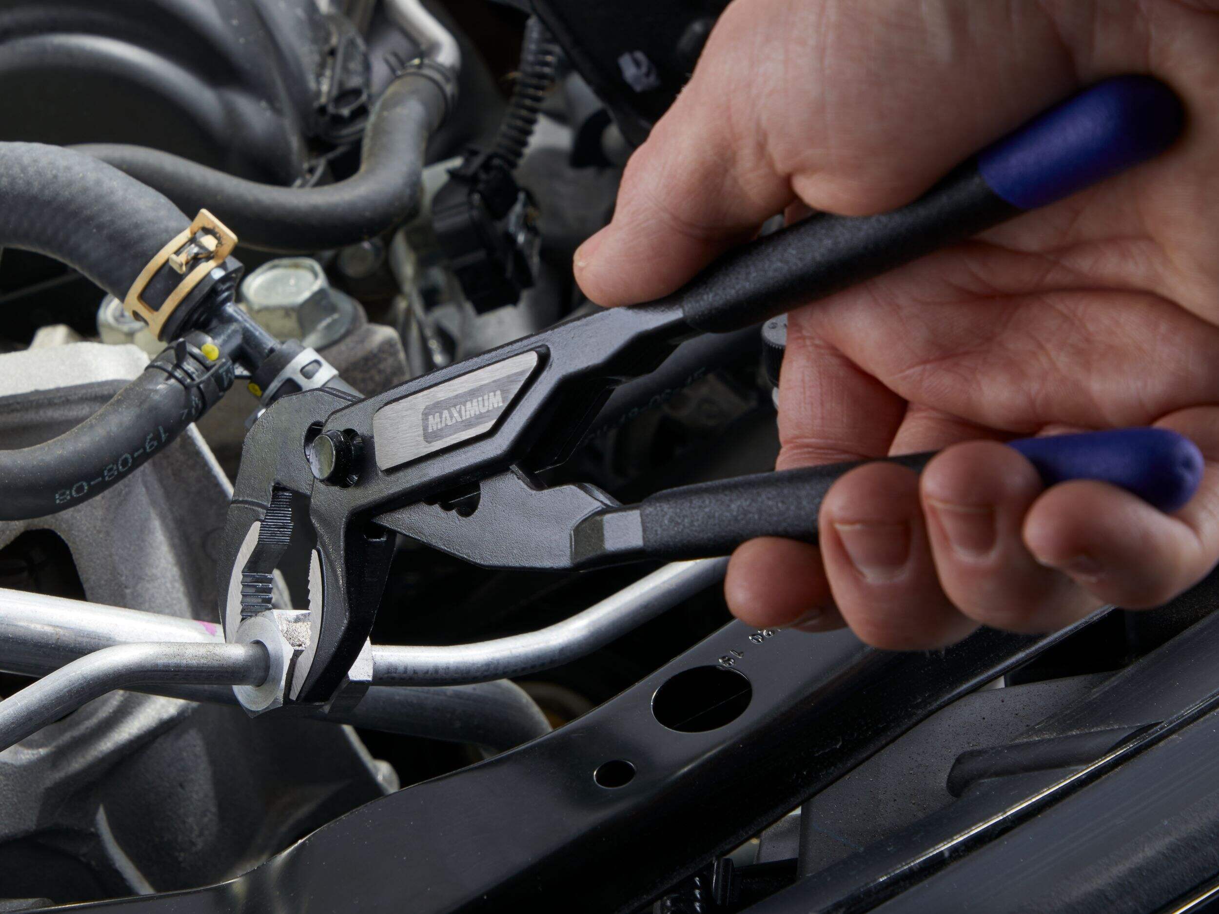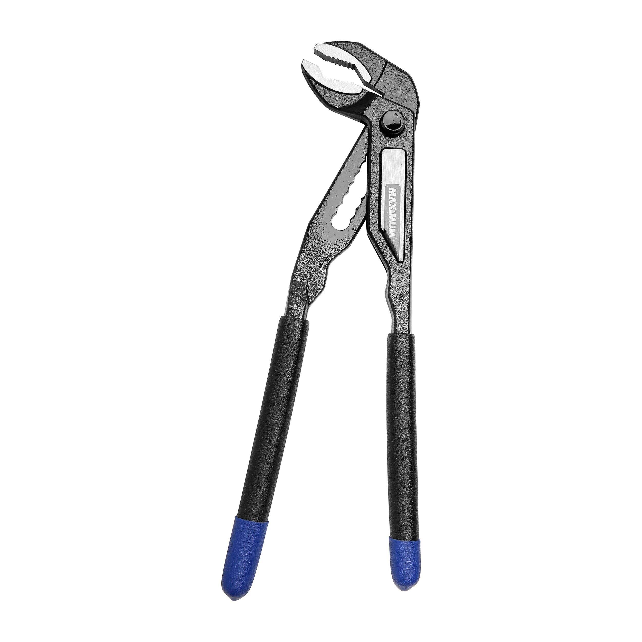 The MAXIMUM Push Button V Jaw Tongue & Groove Pliers are designed to grip various shaped objects and materials. Featuring a convenient push button locking mechanism for easy one-handed use, these pliers have an oil and solvent-resistant finish for effortless maintenance. Constructed from durable alloy steel, they also feature a comfortable handle and colour-coded tips for easy identification in your toolbox.