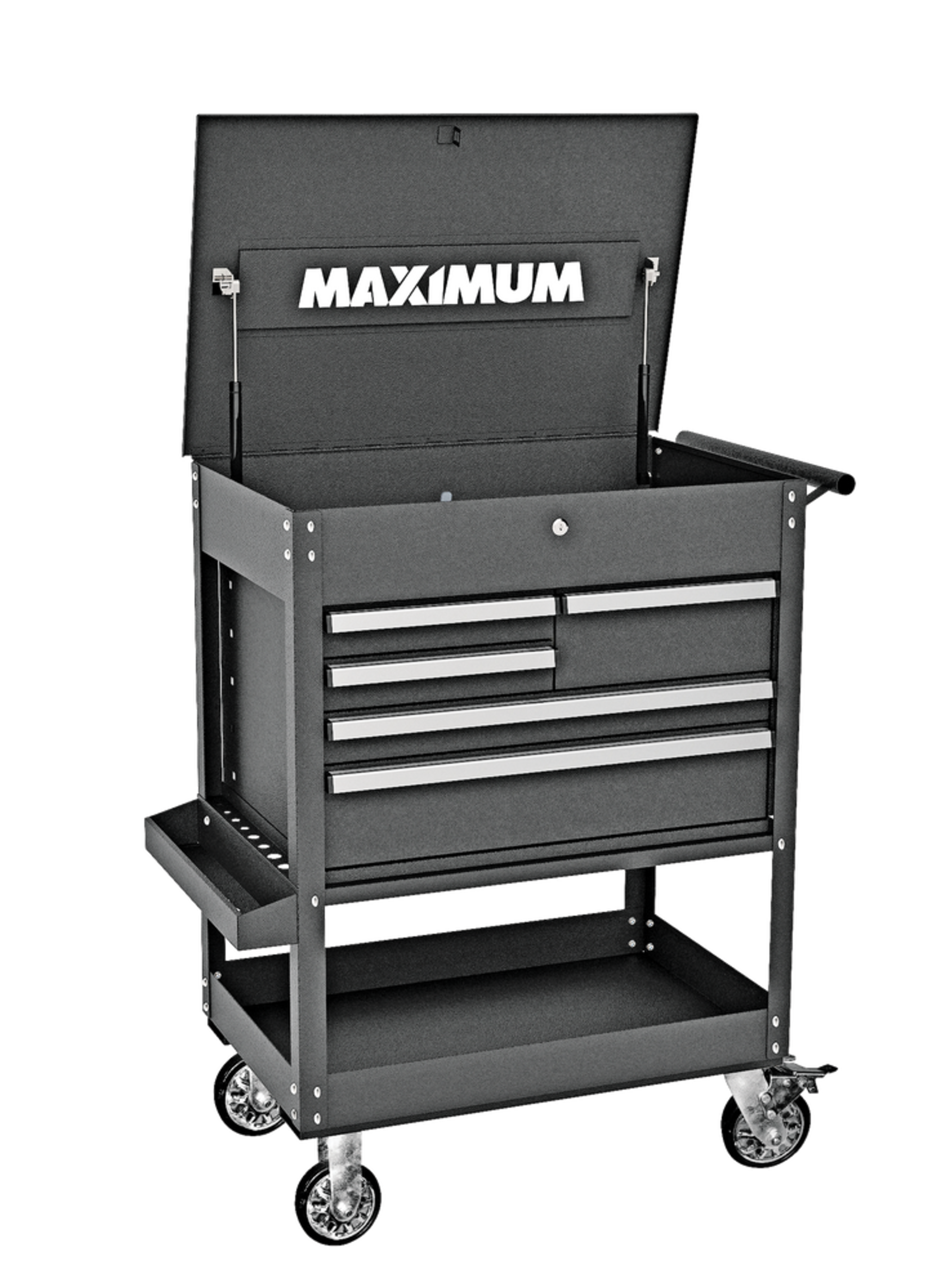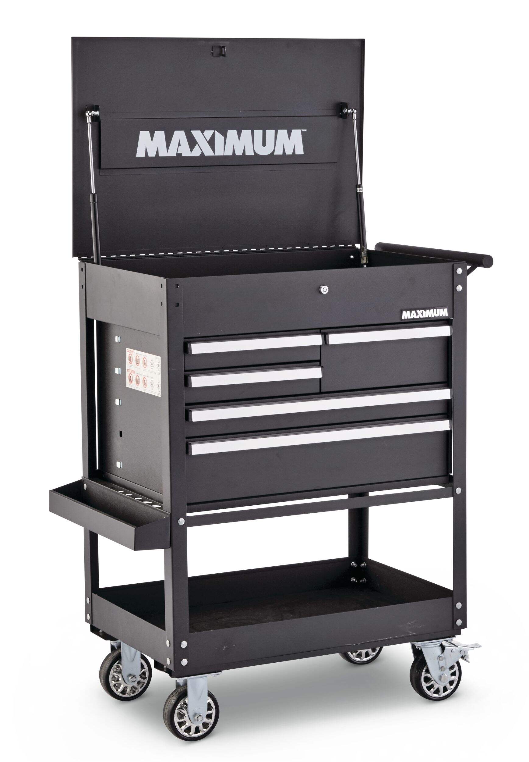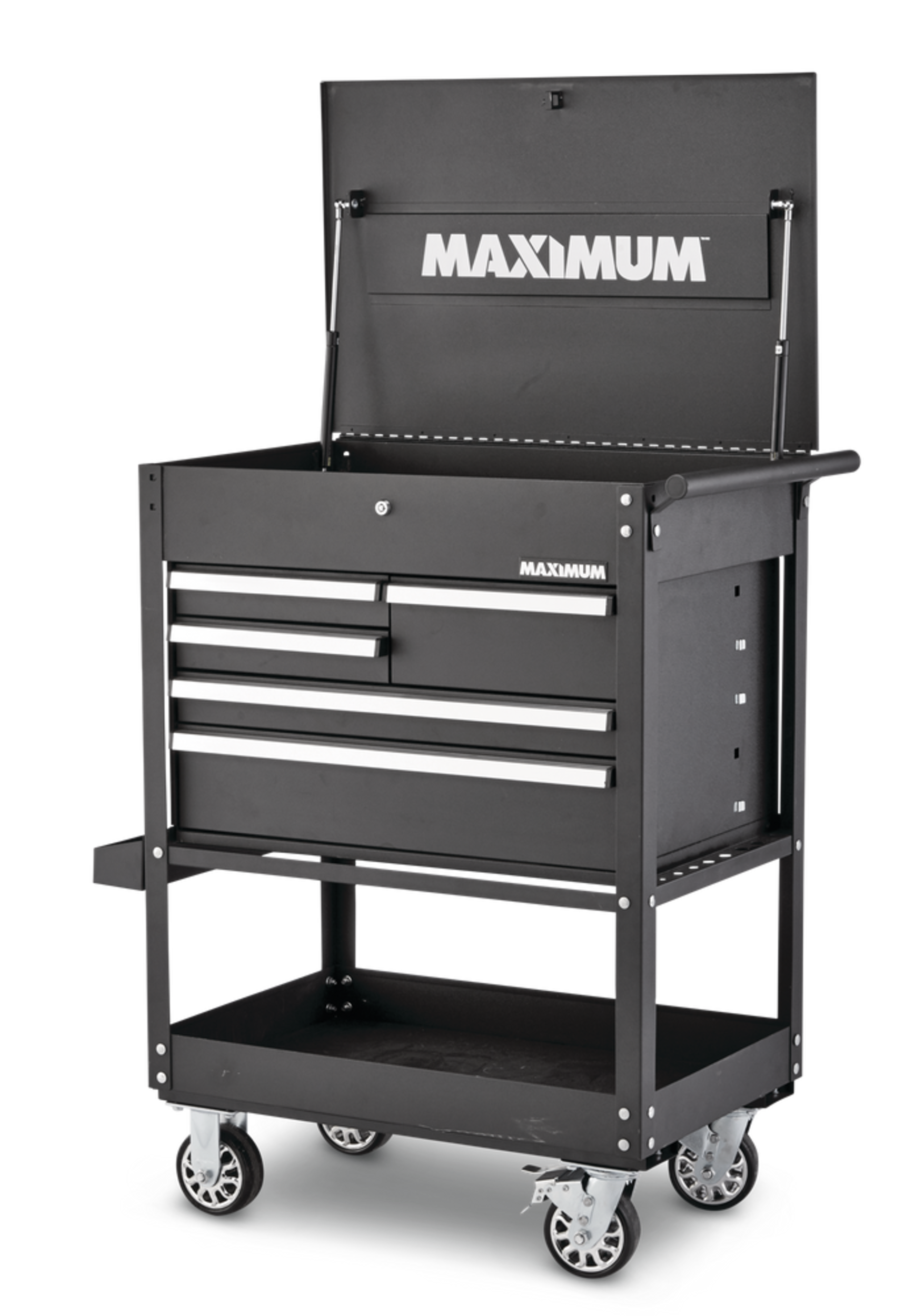 Keep your tools organized and close at hand with the MAXIMUM 5-Drawer Mechanics Tool Cart. Designed for convenience, it features an easy-lift latch that keeps drawers securely closed, with auto-return slides for smooth, quiet self-closing. A compact side tray offers quick access to essential tools, while a lower shelf provides space for larger items. With sturdy casters for effortless repositioning, this tool cart is a practical solution for any garage or workspace.
