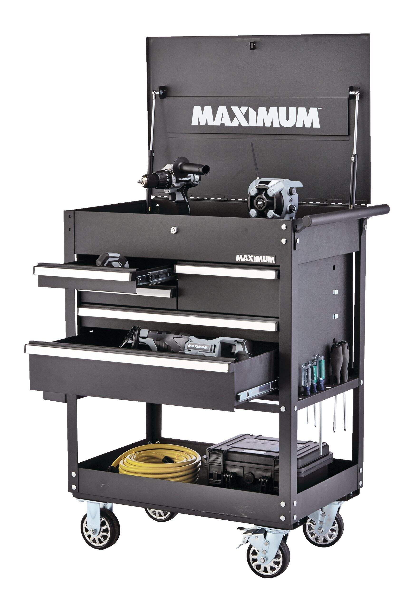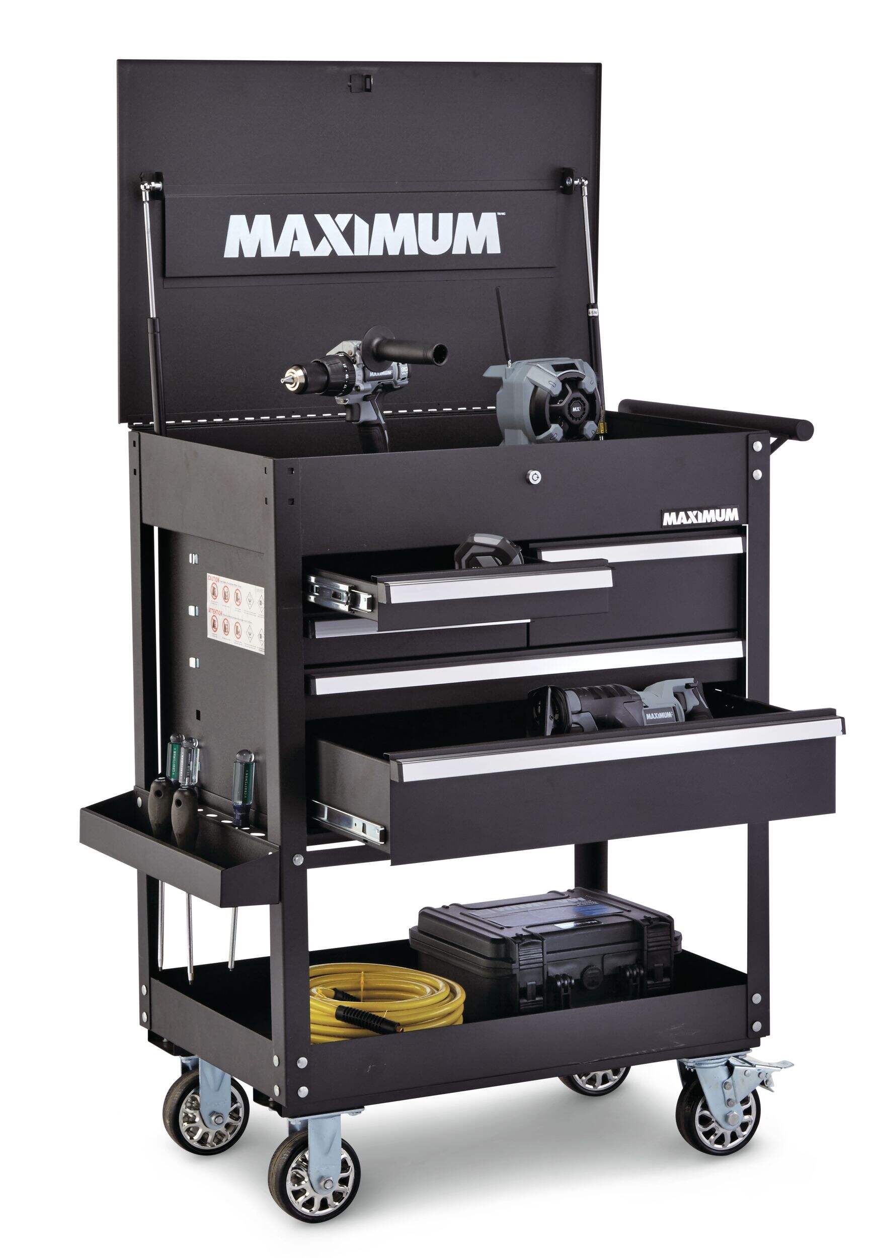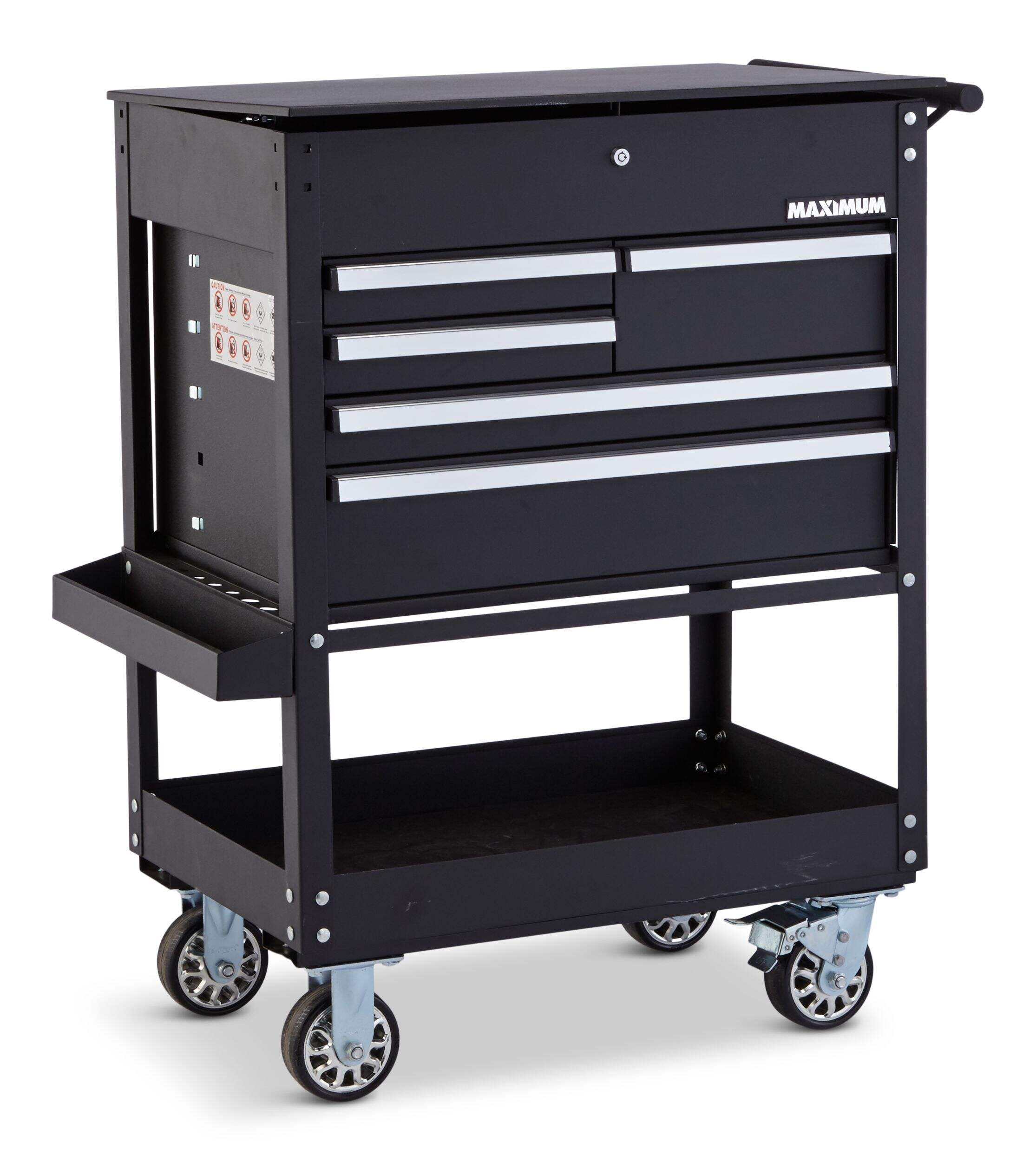 Keep your tools organized and close at hand with the MAXIMUM 5-Drawer Mechanics Tool Cart. Designed for convenience, it features an easy-lift latch that keeps drawers securely closed, with auto-return slides for smooth, quiet self-closing. A compact side tray offers quick access to essential tools, while a lower shelf provides space for larger items. With sturdy casters for effortless repositioning, this tool cart is a practical solution for any garage or workspace.