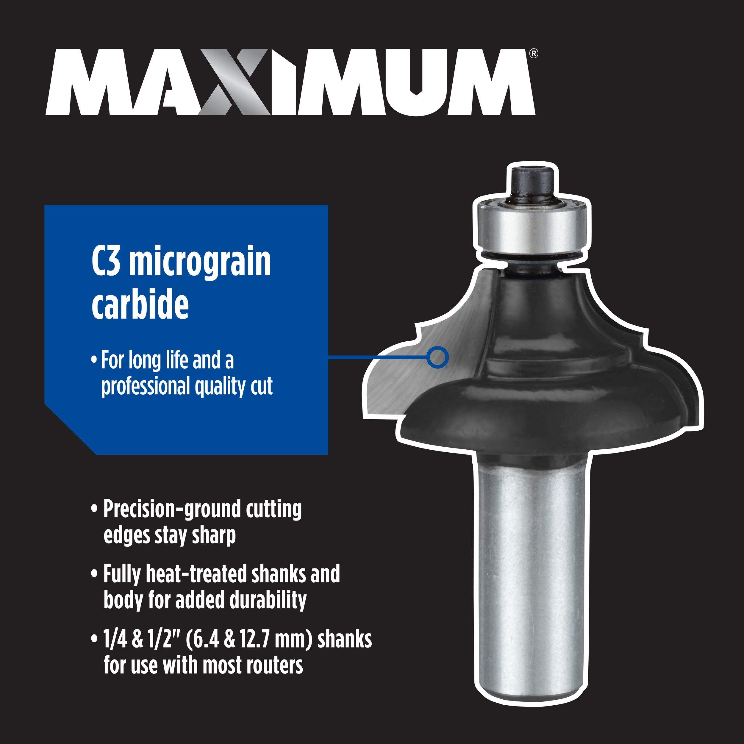Tackle woodworking projects with ease using the MAXIMUM Assorted Carbide-Tipped Router Bit Set. This comprehensive collection includes various bit types and sizes for joining, trimming, and decorative edging, ensuring flexibility and versatility for any job. Featuring a mix of shanks, this set is compatible with most routers. The durable C3 micrograin carbide cutting edges offer long-lasting performance and professional-quality cuts.