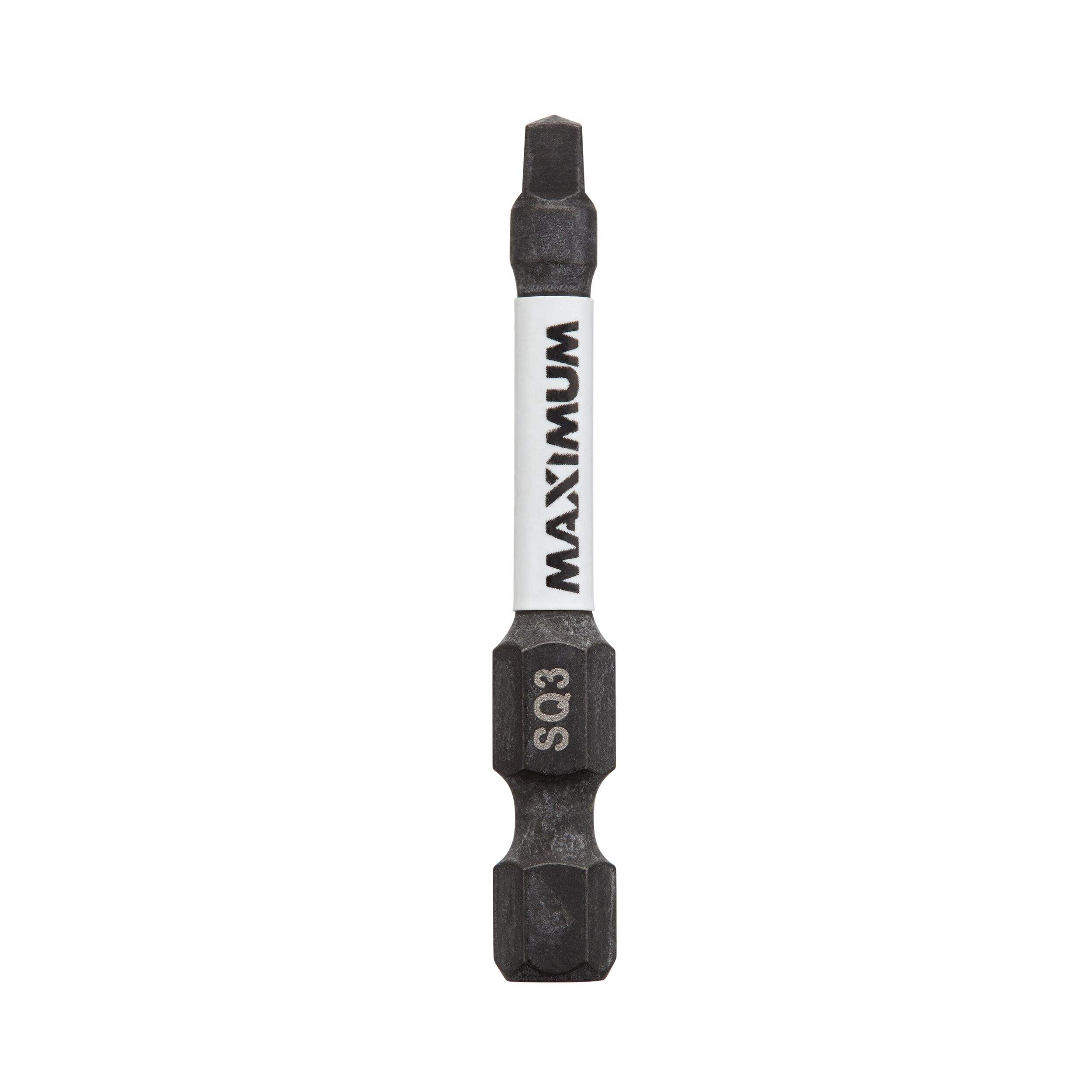 Count on the MAXIMUM Square Screwdriver Bit, 3-1/2-in, for any construction or repair project. This square-head carbide drill bit is ideal for drilling metal, plastic, or masonry material. The torque screwdriver bit has a square recess to increase the engagement of the driver bit in the screw head. The tight connection of the drill bit to the screw head resists cam-outs. The square screw bit features a torsion zone that helps absorb impact and withstands the high levels of torque needed in impact drivers. This square screwdriver bit is coated with black oxide to resist corrosion and provide extra durability for longer life.