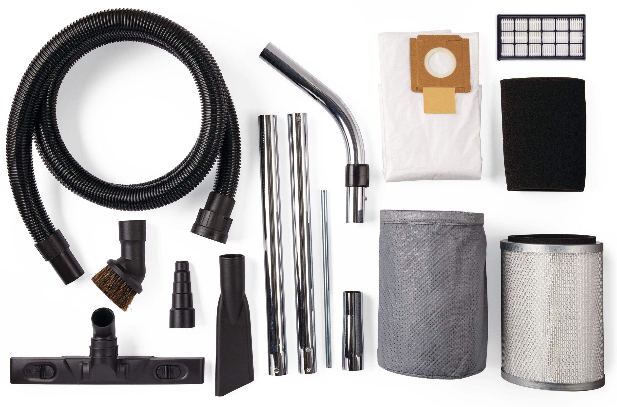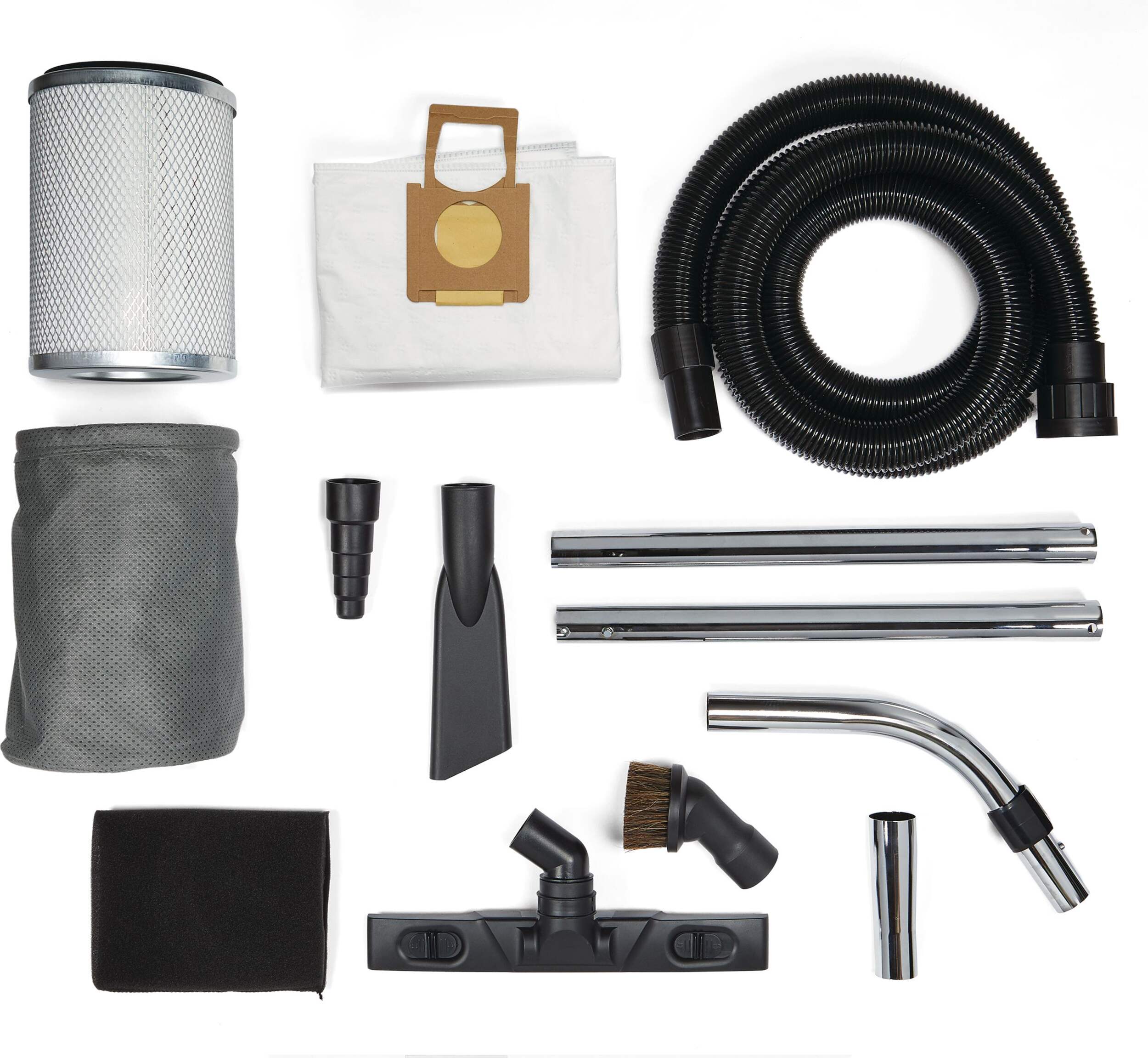 This vacuum includes a crush-resistant EVA hose with a 1 1/2” (3.8cm) diameter, 2 locking steel extension wands, a steel elbow with airflow adjustment, a 15” (38.1cm) professional floor nozzle, a crevice tool, a horsehair dust brush, a power tool dust collection adaptor, a HEPA cartridge filter, a microfibre pre-filter, a HEPA material exhaust filter, a foam sleeve/wet filter and a high-efficiency collector bag