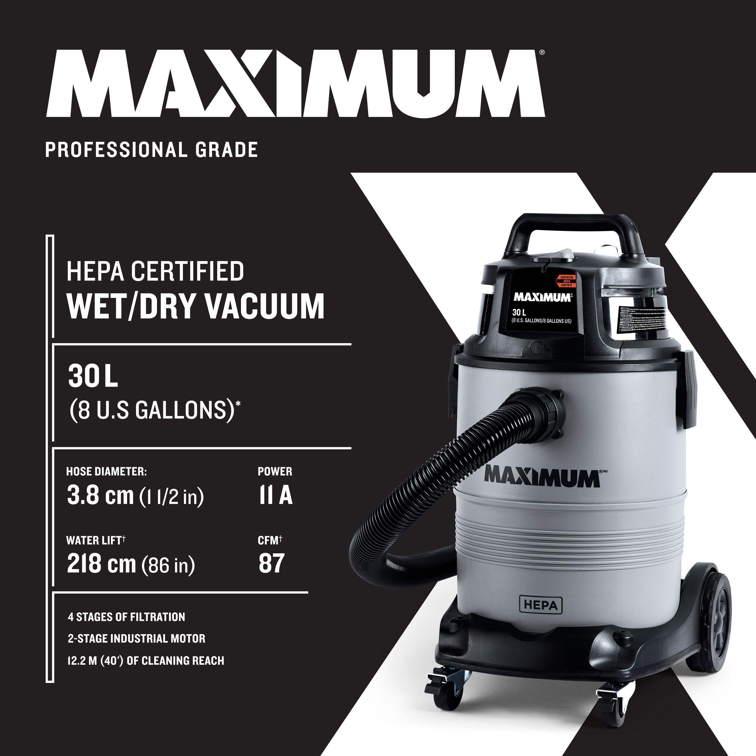 Tackle the toughest messes with the MAXIMUM HEPA Certified Wet/Dry Shop Vacuum. This versatile powerhouse boasts a 4-stage filtration system that captures 99.97% of particles down to 0.3 microns, making it perfect for construction sites and home renovations. With its beefy 11A motor and 30L capacity, you'll power through both wet and dry clean-ups with ease. The 30 ft cord lets you roam free, while the durable polypropylene body and non-marring wheels ensure it can handle rugged job sites. Packed with accessories like a crush-resistant hose, steel wands, and specialized nozzles, this vacuum is ready for any challenge. Whether you're a pro or a DIY enthusiast, this HEPA-certified shop vacuum delivers the performance and versatility you need to keep your workspace clean and healthy.