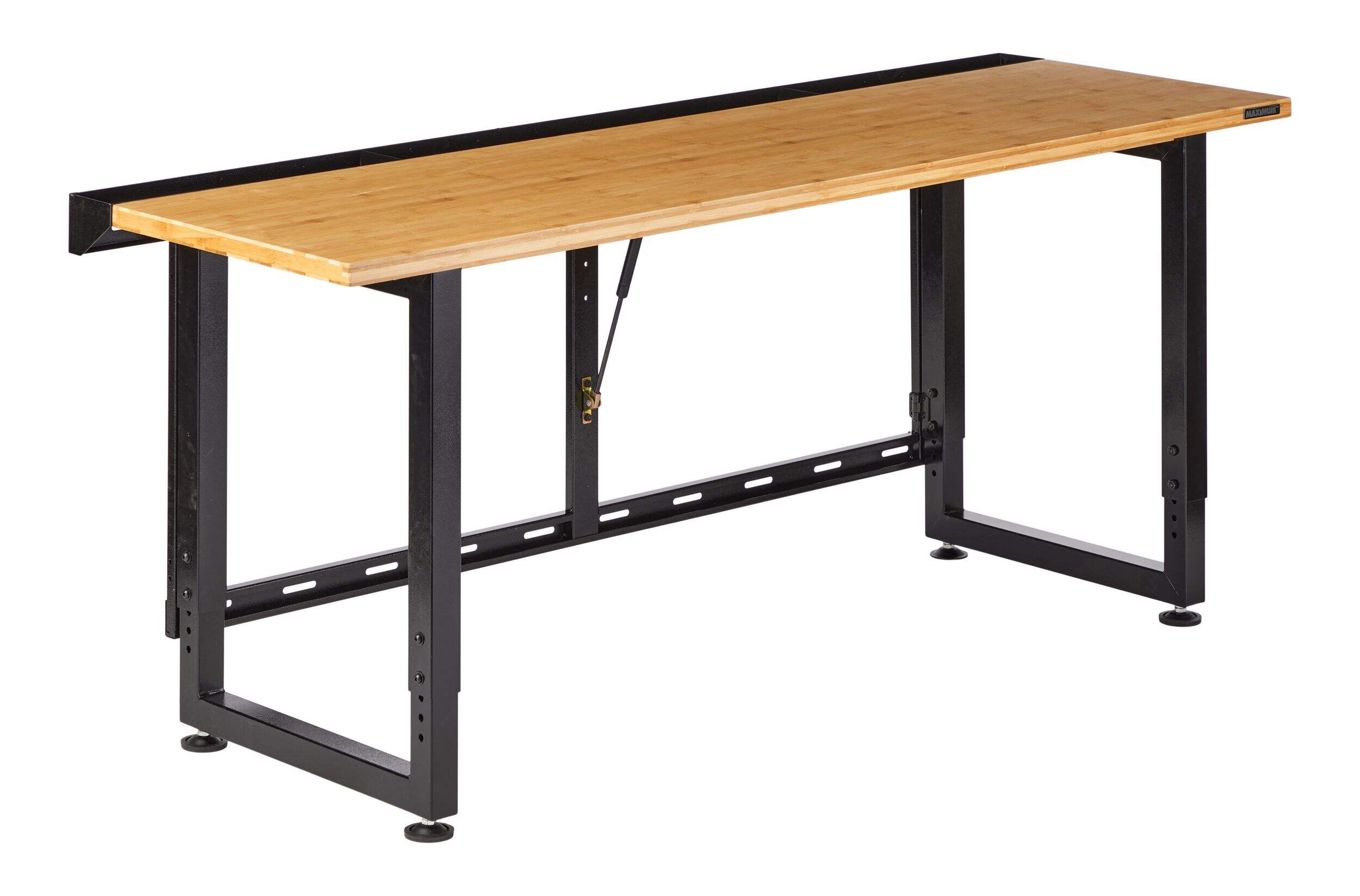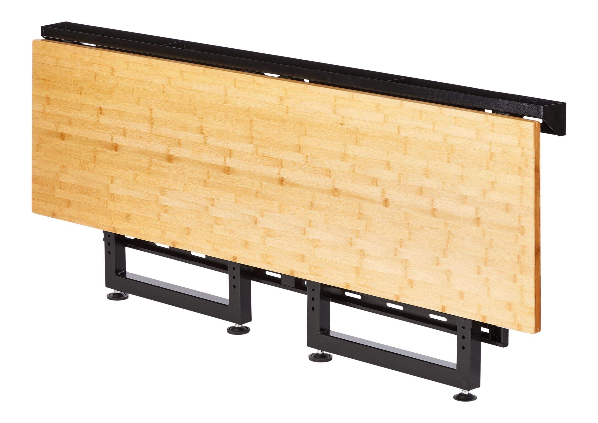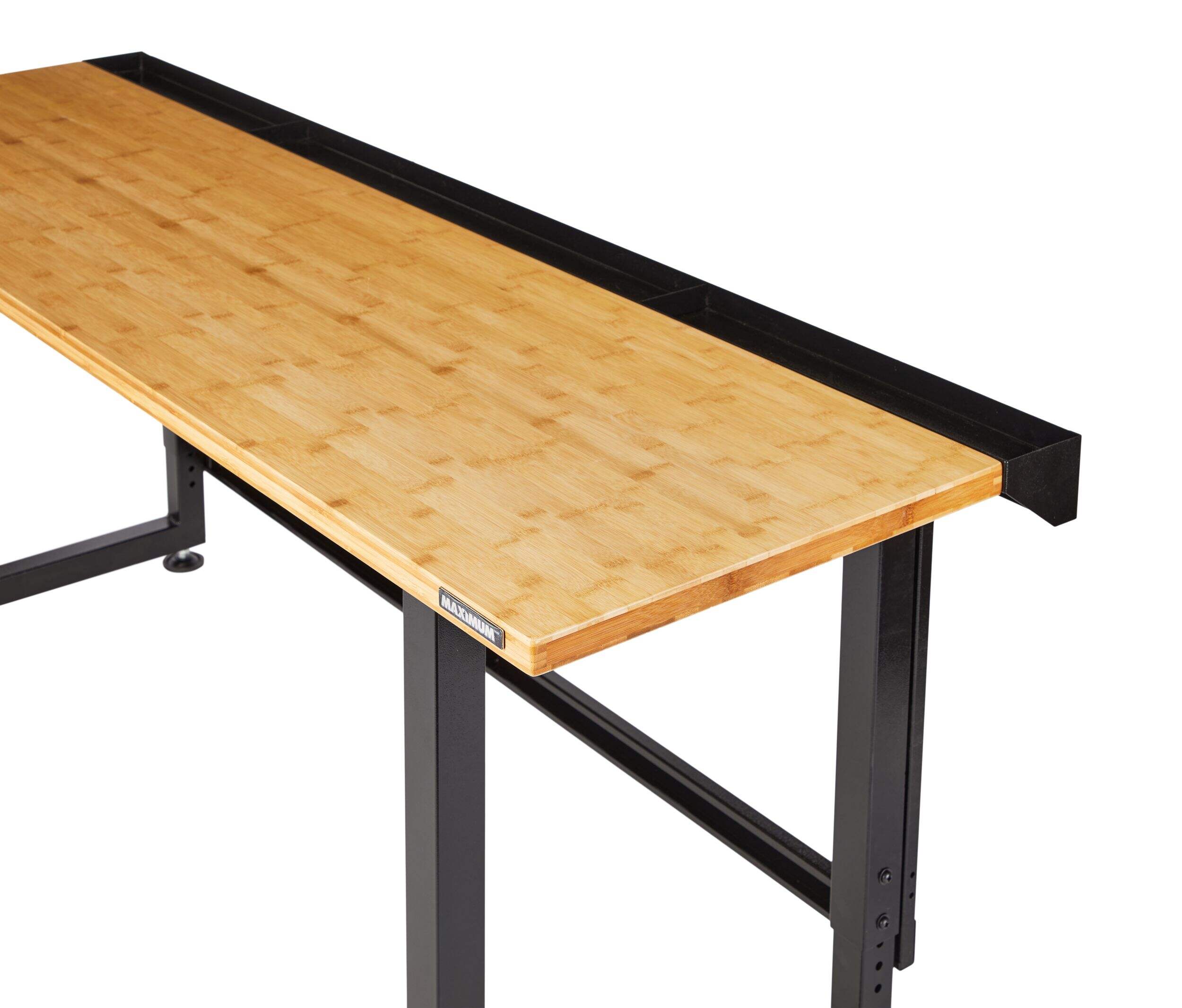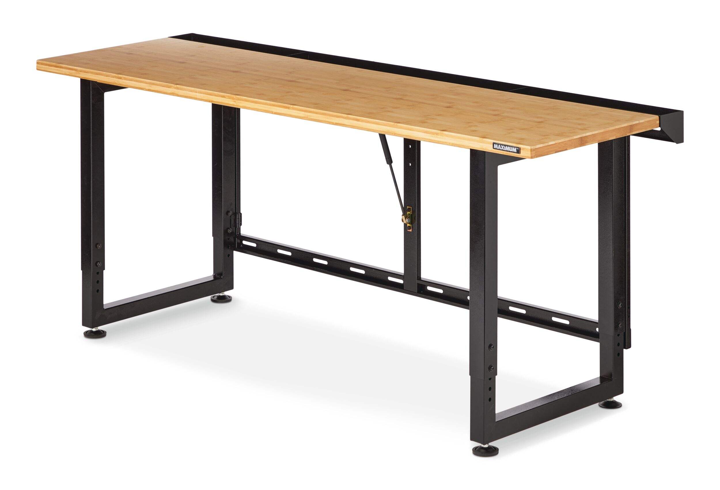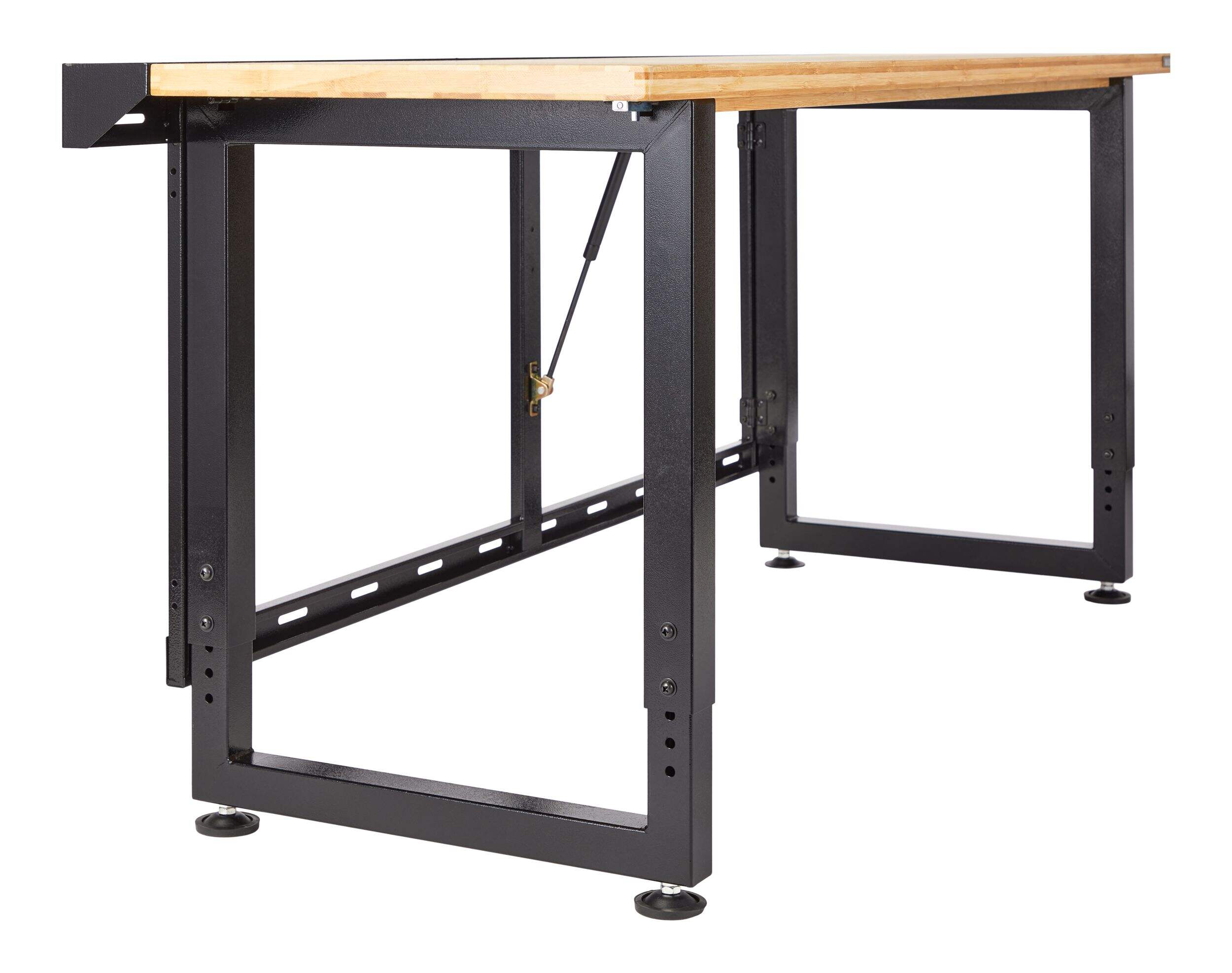 Get ready to tackle any project with the MAXIMUM Folding Workbench. The sturdy bamboo surface offers a spacious 6-ft workspace that can handle up to 800 lbs, perfect for your toughest jobs. Adjust the height to find your ideal working position, whether you're seated or standing. The four levelling feet ensure stability on uneven surfaces, making this bench a reliable stationary work area. When you're done, simply fold it up for compact storage.