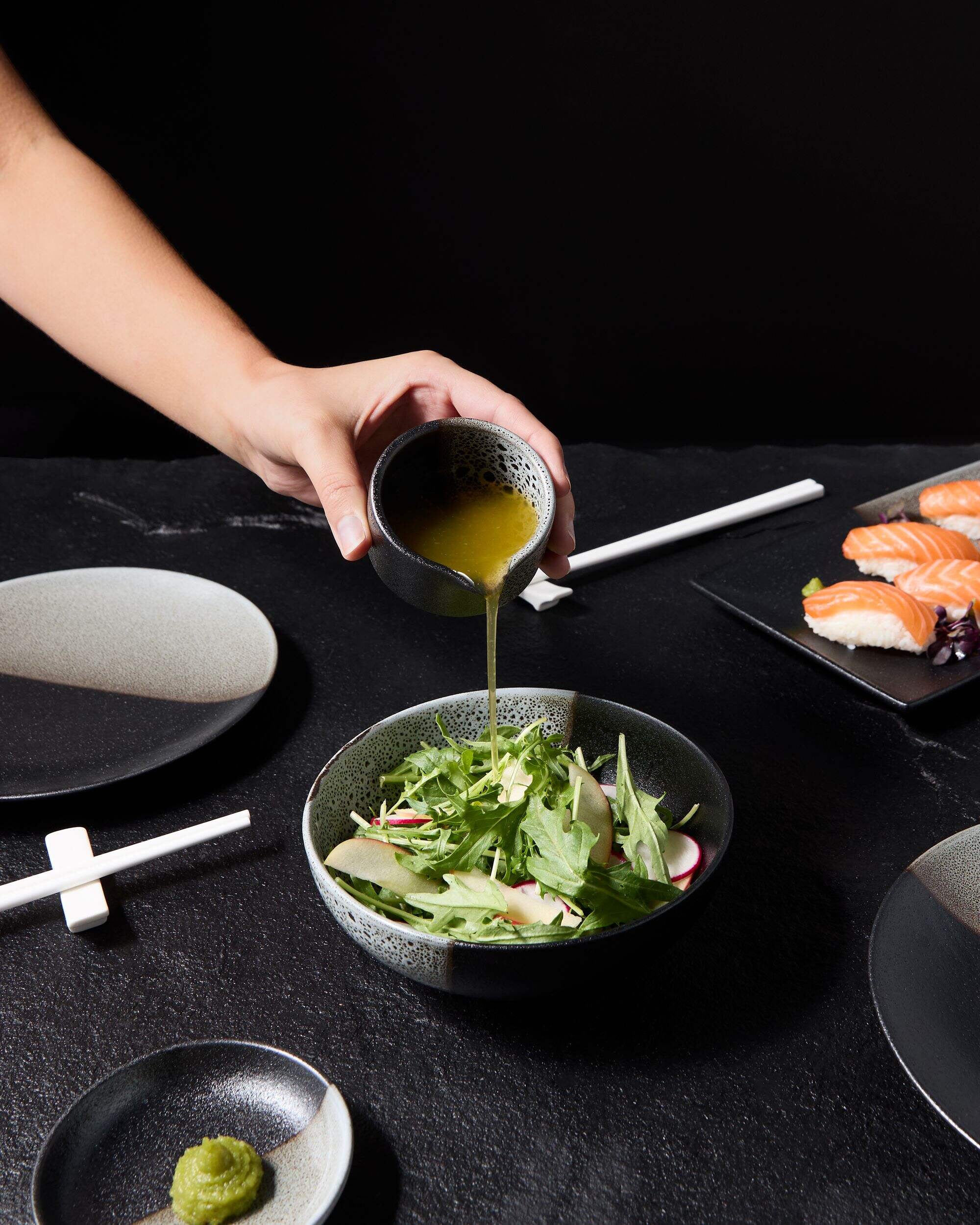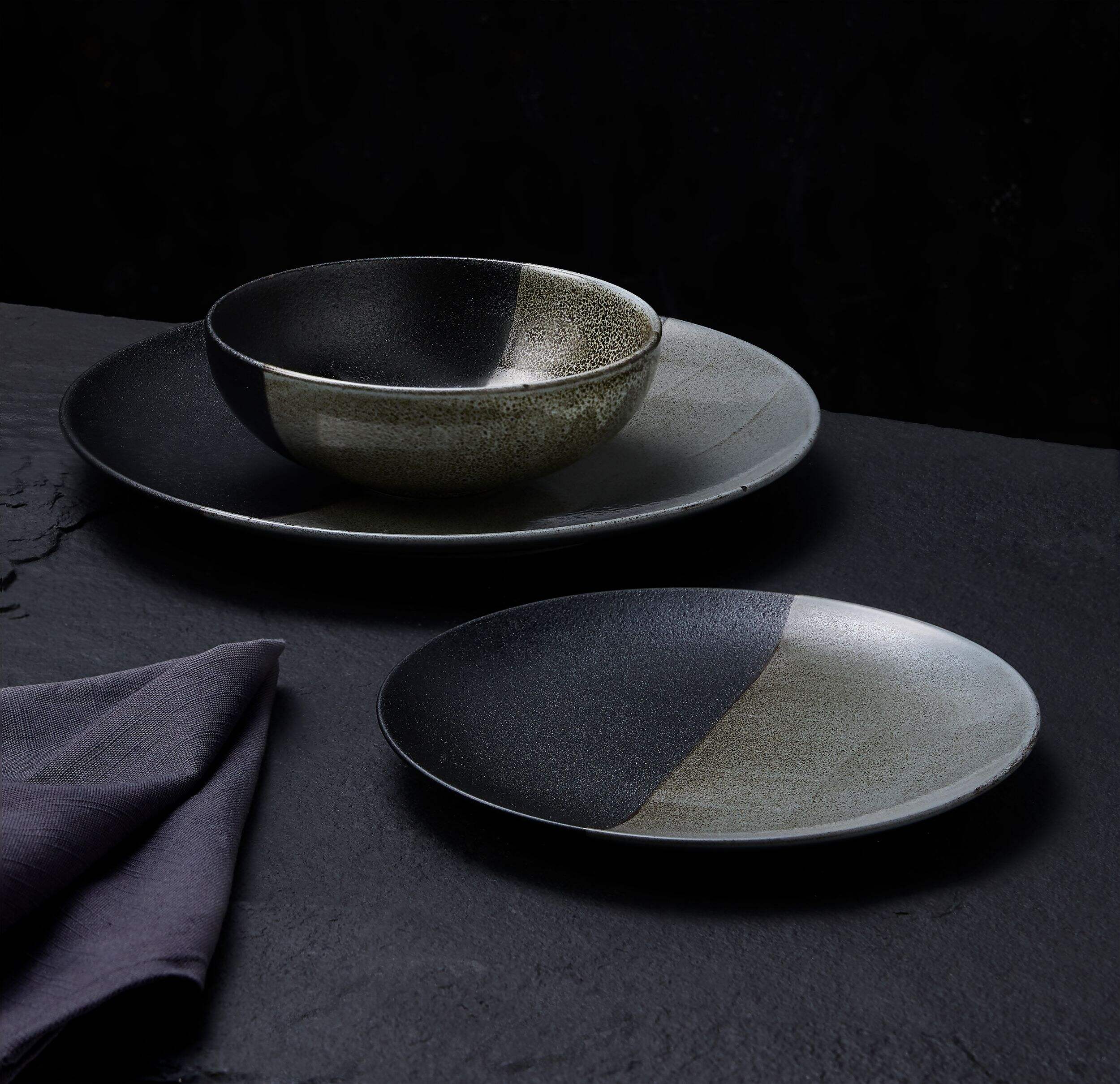 This contemporary collection of dinnerware features a two-tone reactive glaze that makes each piece unique, adding visual depth and striking contrast to all pieces in the set. Set includes 12 matching pieces.
