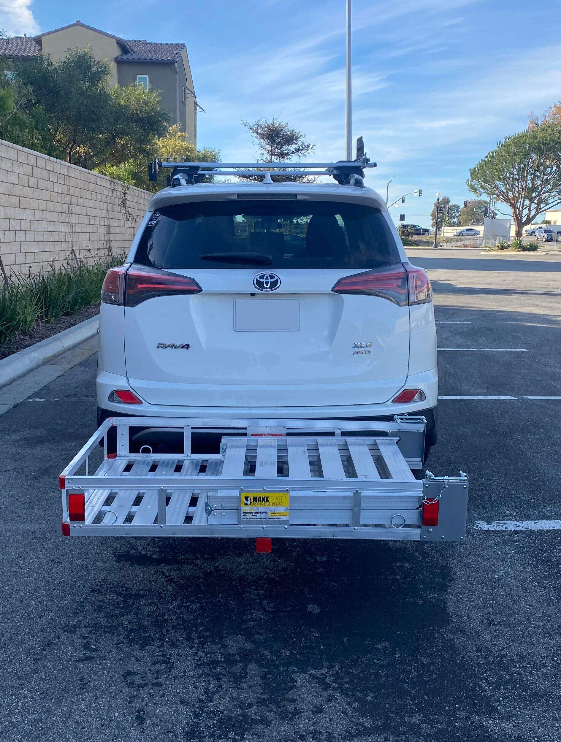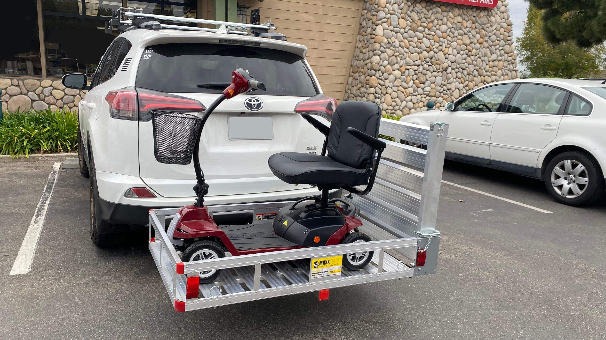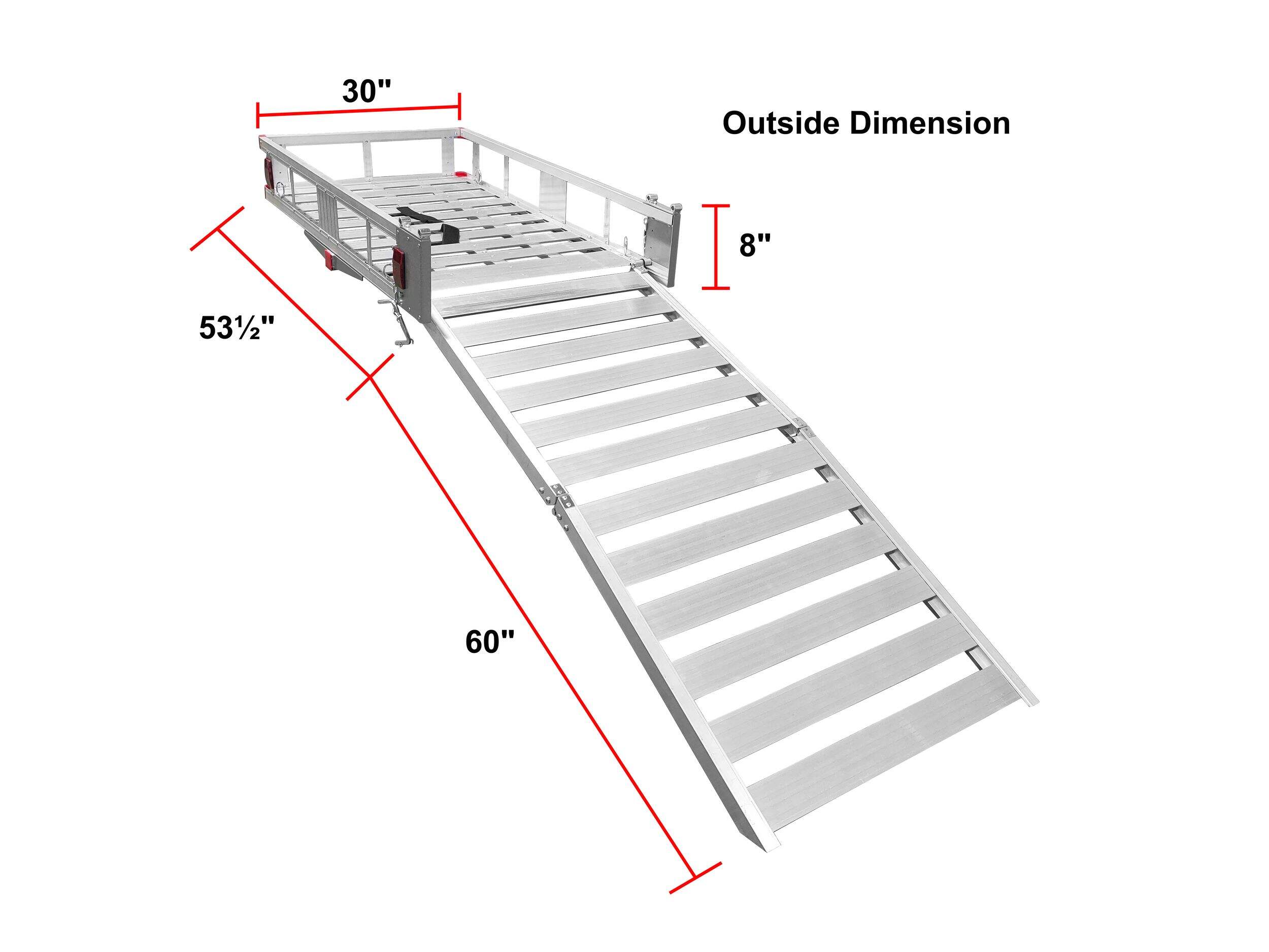 The MaxWorks Hitch Accessibility Carrier is designed for convenience and ease of operation when using your vehicle to transport personal mobility devices. The lightweight aluminum construction allows for quick mounting and includes an anti-tilt bracket to minimize carrier wobble. It features a 60-in (152 cm) long ramp that folds for compact storage and an extra-wide 28 x 48-in (71 x 122 cm) bed that can accommodate most mobility devices.