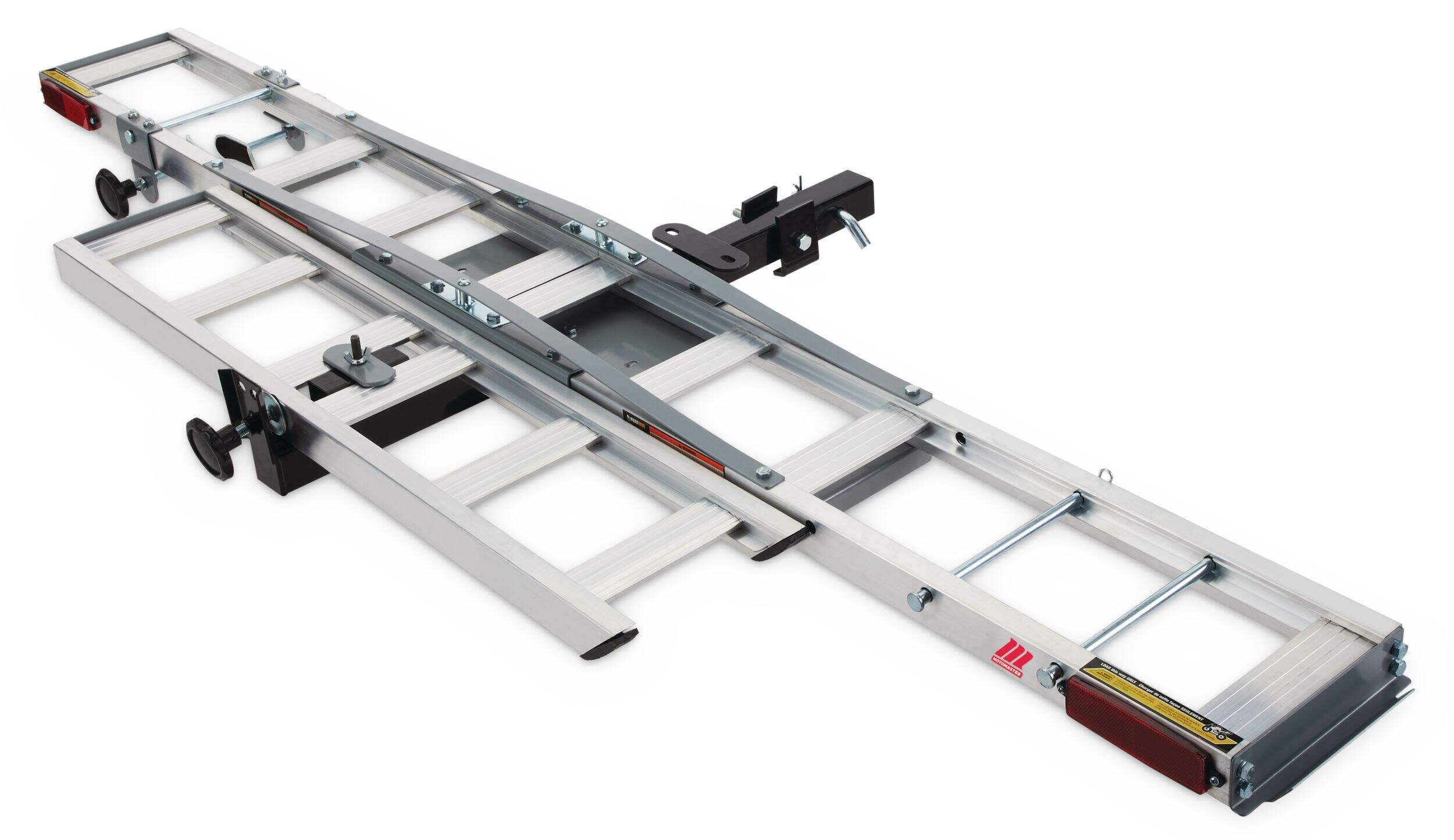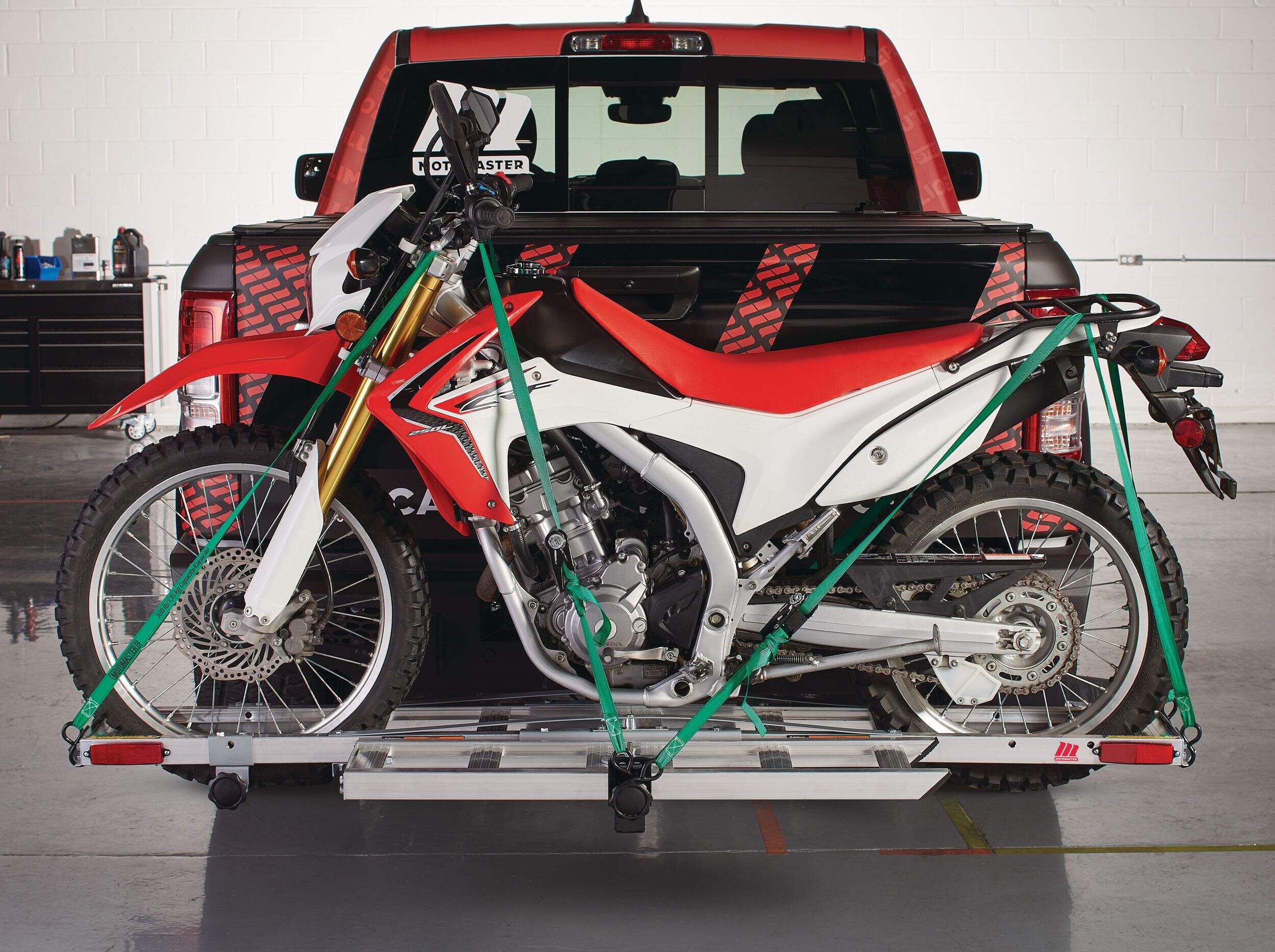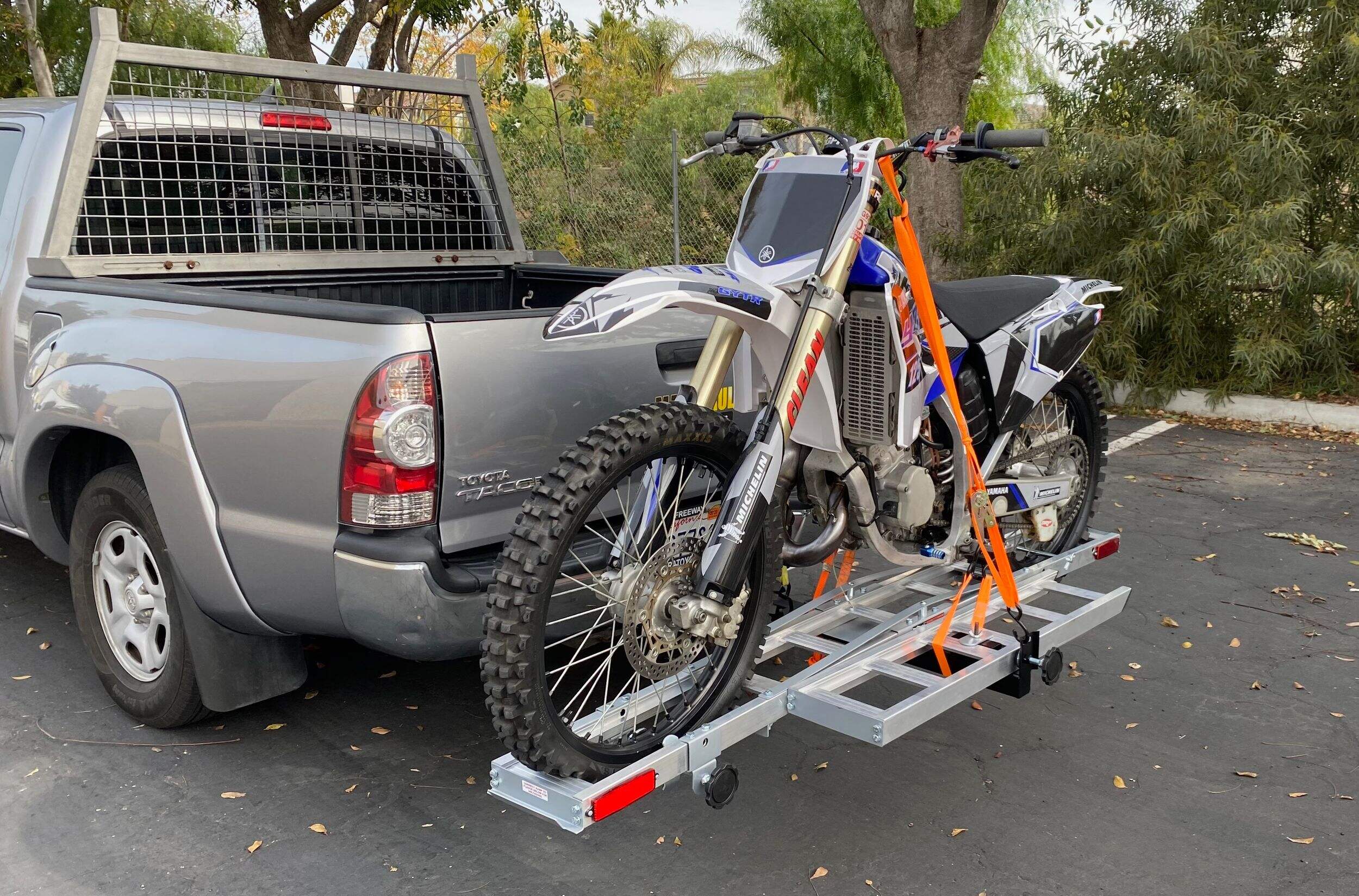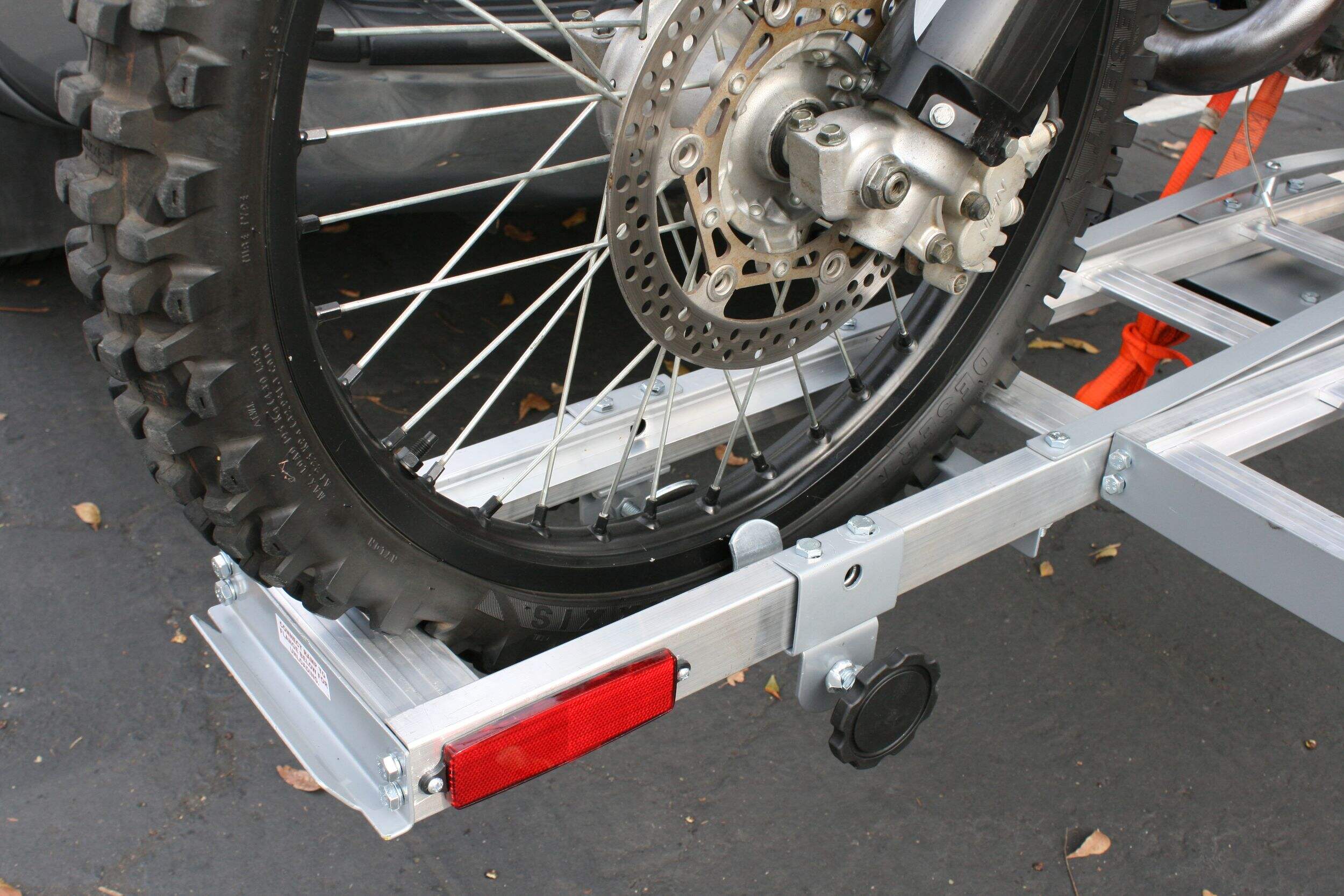 The MaxWorks Motorcycle Carrier is a practical hitch-mounted option for securely transporting your motocross or dirt bike. The lightweight and durable aluminum ramp allows easy loading and secures to the carrier during travel. The hitch-mount carrier features a drop-down tire design plus a clamp-on device on the front wheel for security. The platform adjusts to fit most dirt bikes and fits a 2-in (5 cm) square hitch receiver.