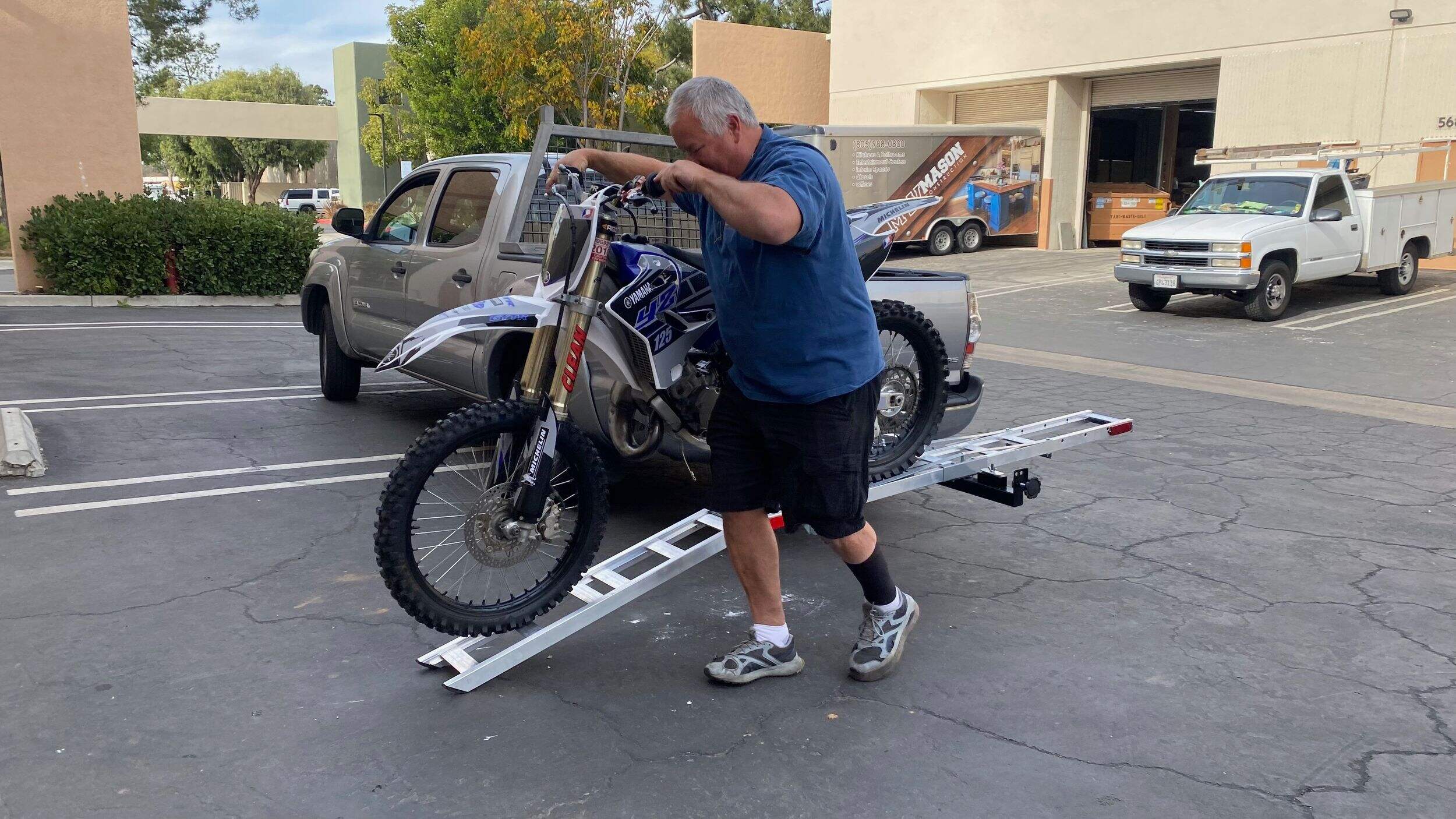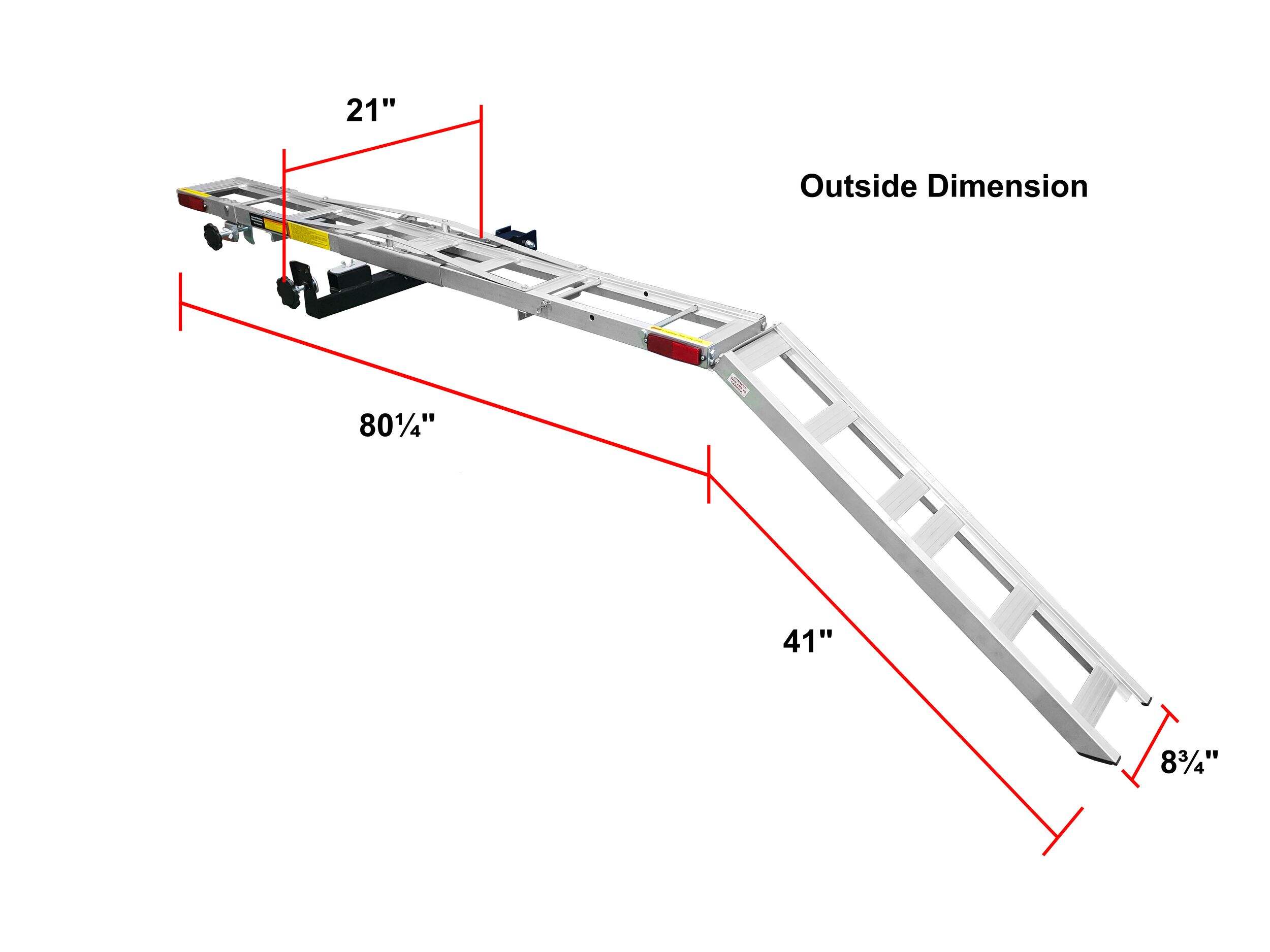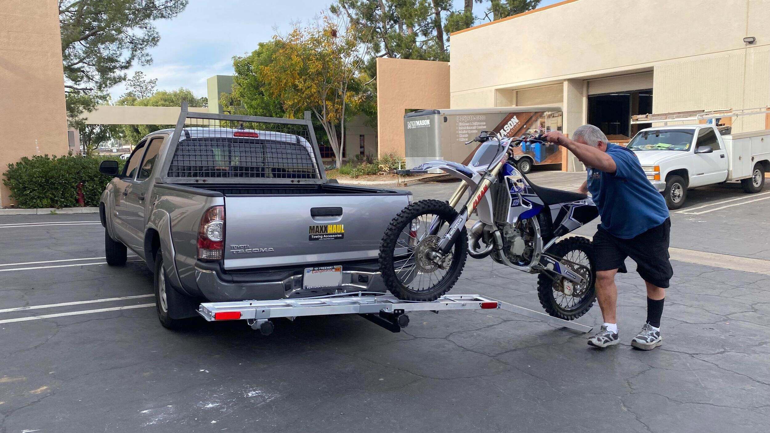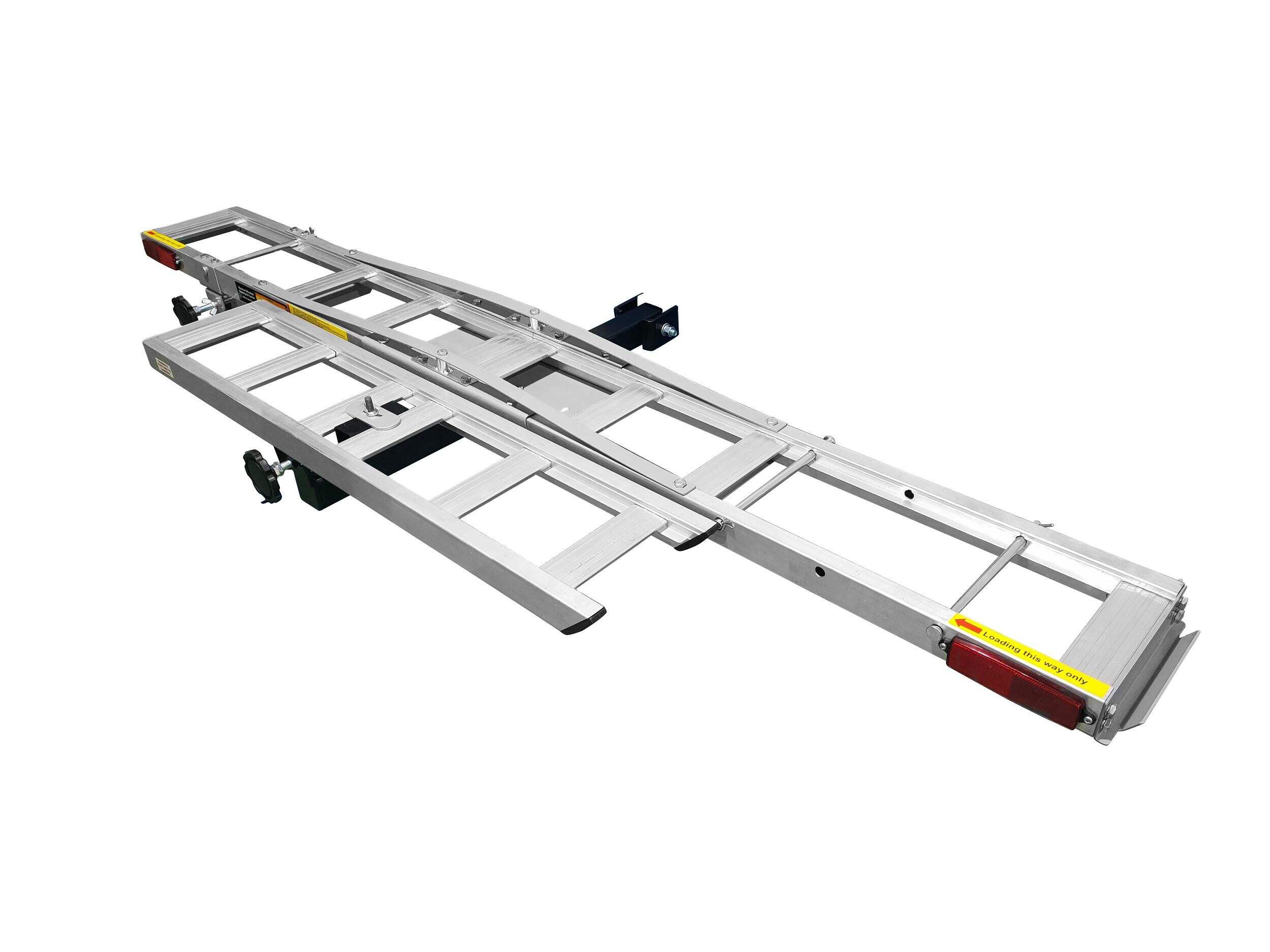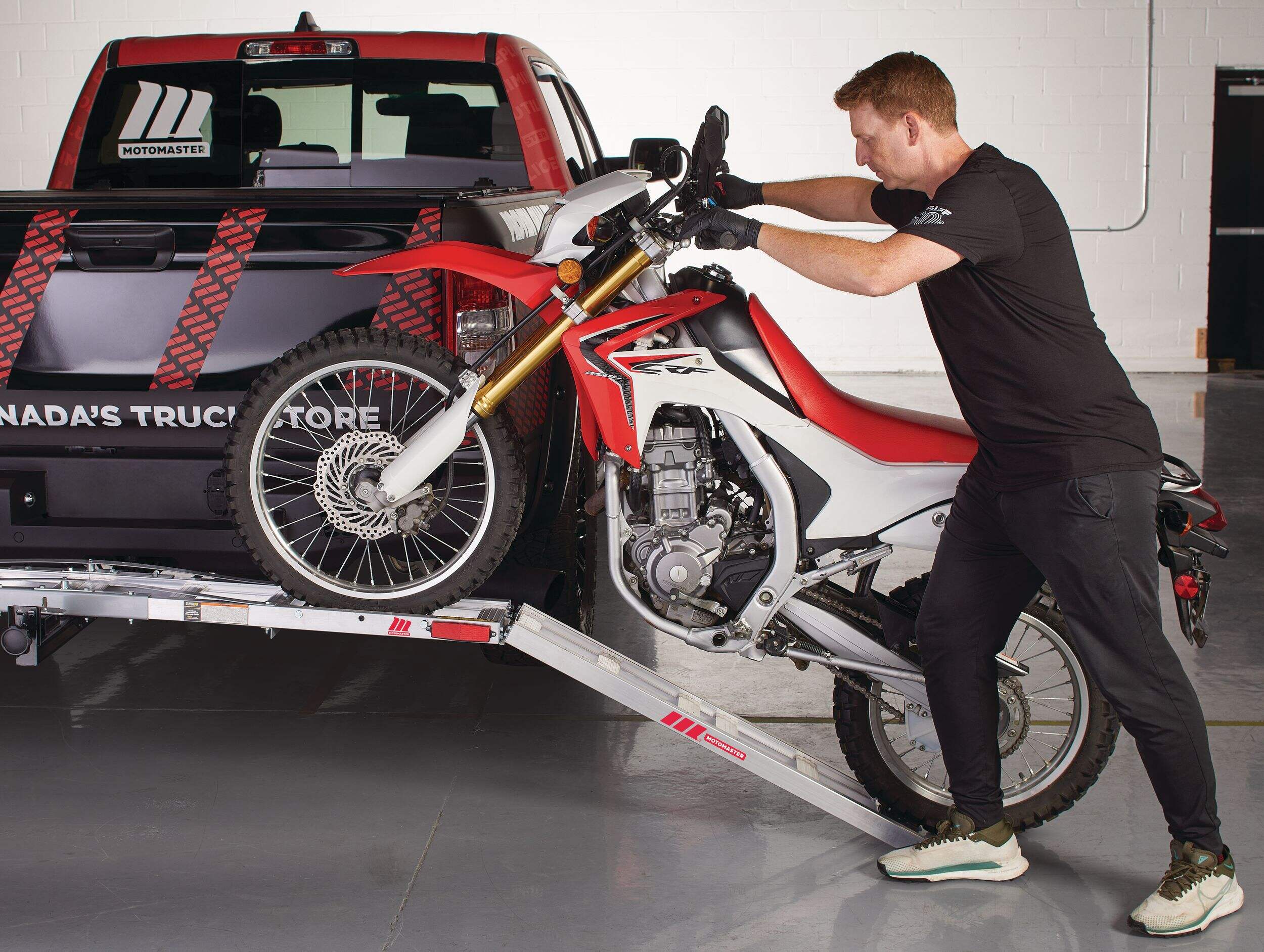 The MaxWorks Motorcycle Carrier is a practical hitch-mounted option for securely transporting your motocross or dirt bike. The lightweight and durable aluminum ramp allows easy loading and secures to the carrier during travel. The hitch-mount carrier features a drop-down tire design plus a clamp-on device on the front wheel for security. The platform adjusts to fit most dirt bikes and fits a 2-in (5 cm) square hitch receiver.