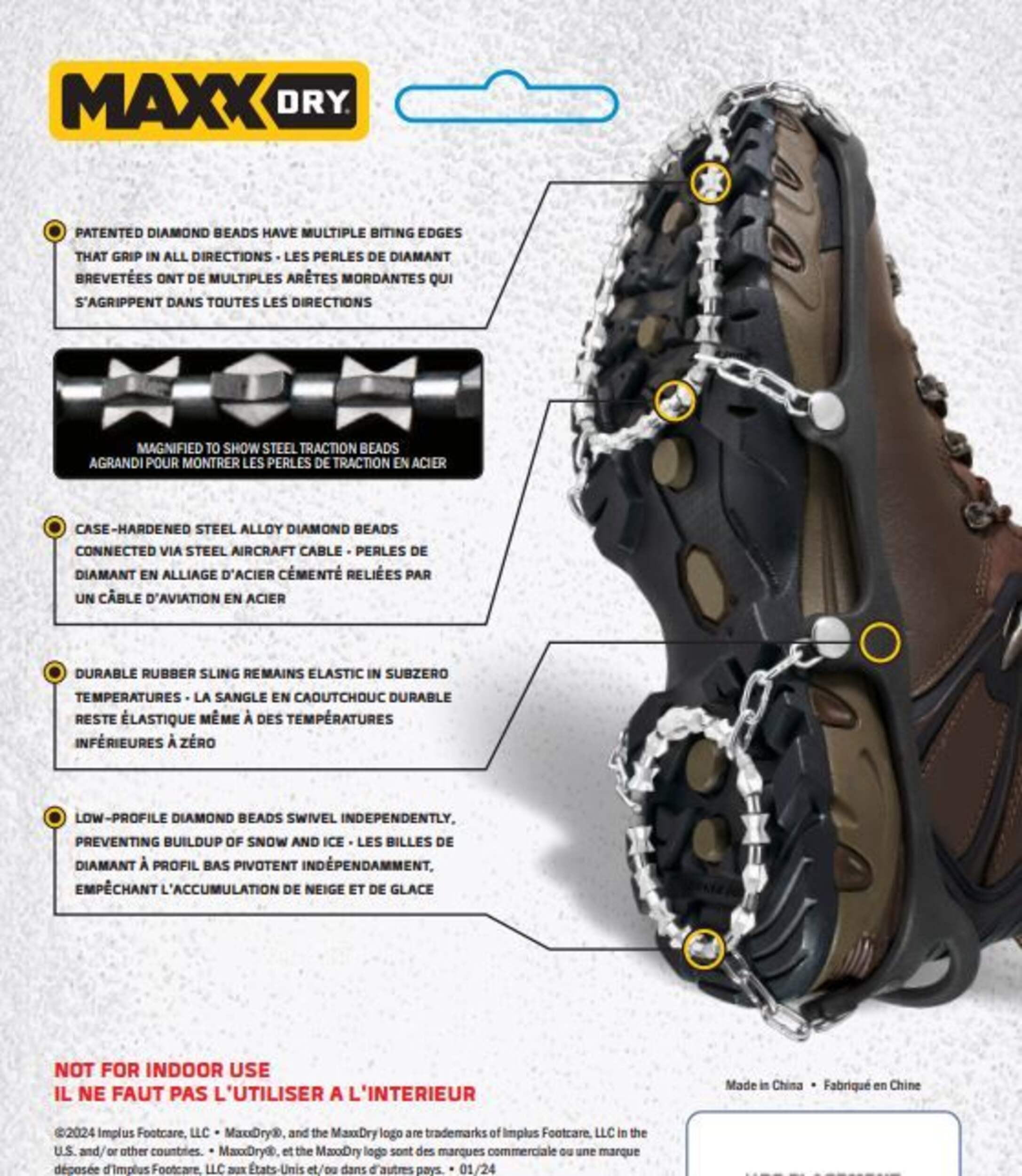Tackle winter's toughest terrain with help from MaxxDry Diamond GripOns™. These durable traction crampons easily fit over your shoes or boots, providing superior grip on snow and ice. Featuring patented Diamond Beads made from case-hardened steel alloy strung on aircraft-grade steel cable, they offer multiple biting edges that grip in every direction. The natural rubber sling stays elastic and secure, even in sub-zero temperatures, making it perfect for winter hikes or daily commutes.