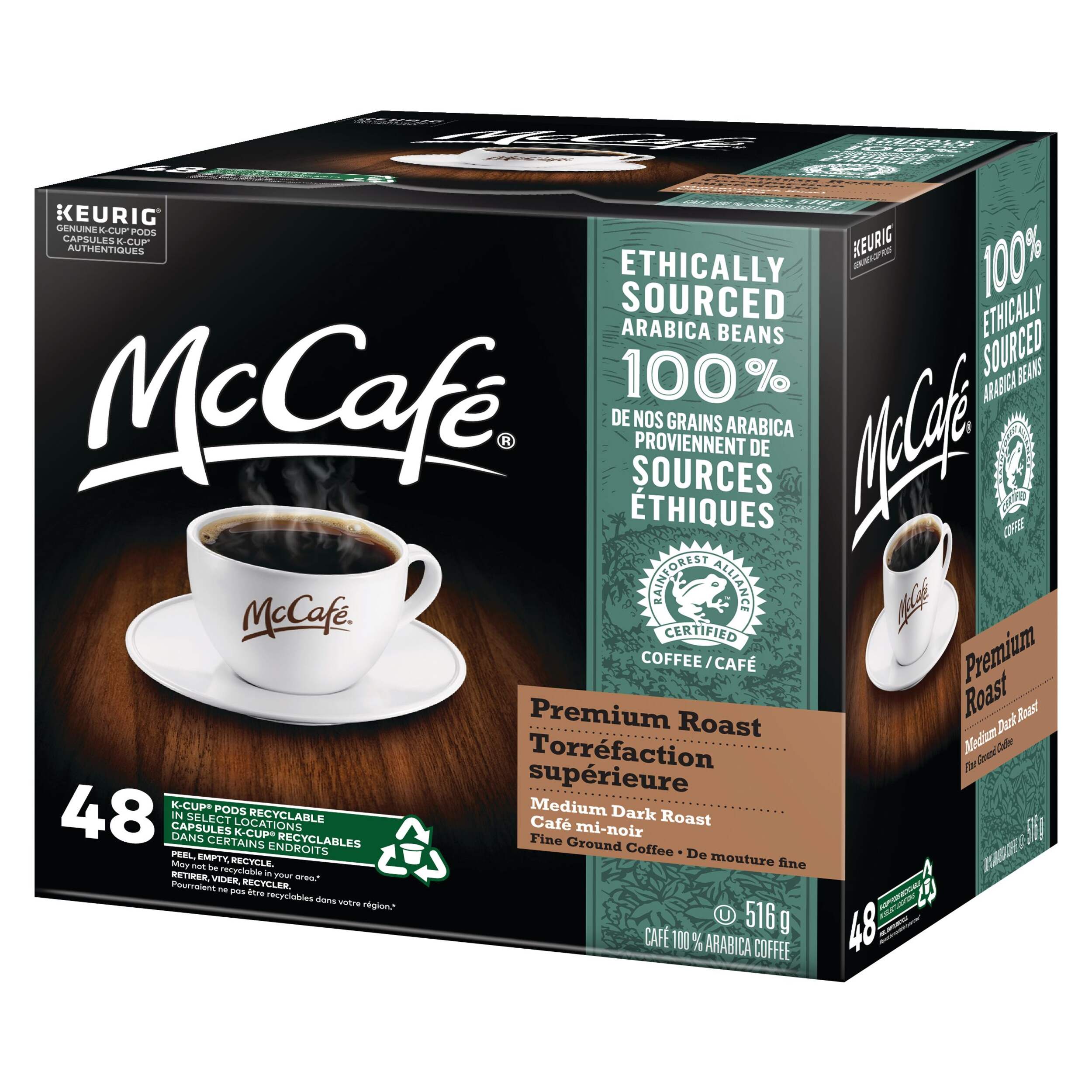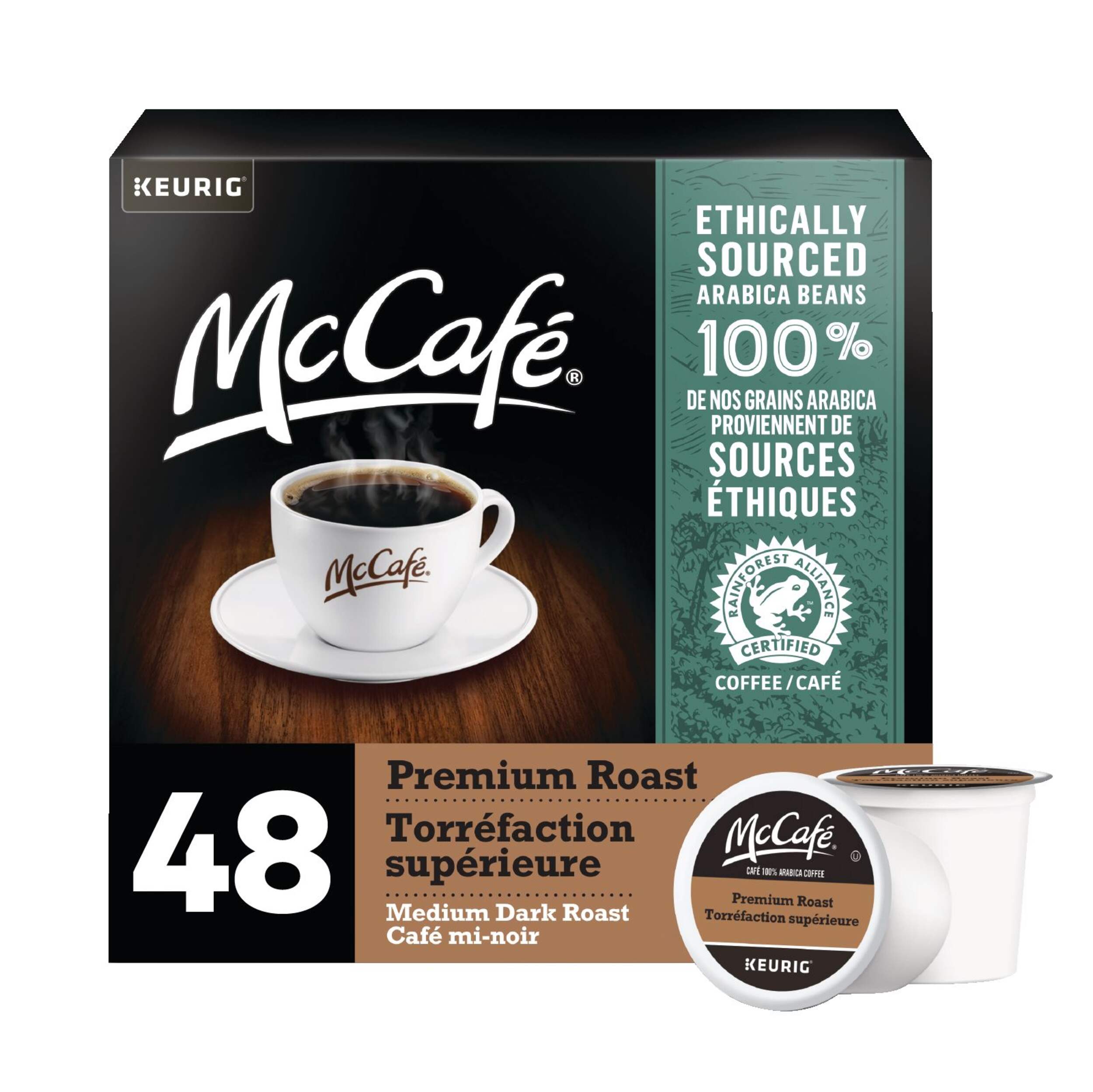 Start your day with the irresistible taste of McCafé Premium Roast coffee. Our process begins with quality 100% Arabica beans, traditionally fire-roasted to create our signature medium dark roast blend featuring a balanced flavour and rich aroma. We carefully sample each batch of McCafé Premium Roast coffee to ensure we deliver the rich, smooth, delicious taste you love. Our Arabica beans are sourced from Rainforest Alliance Certified farms, which support a healthier planet and an improved quality of life for farming communities.