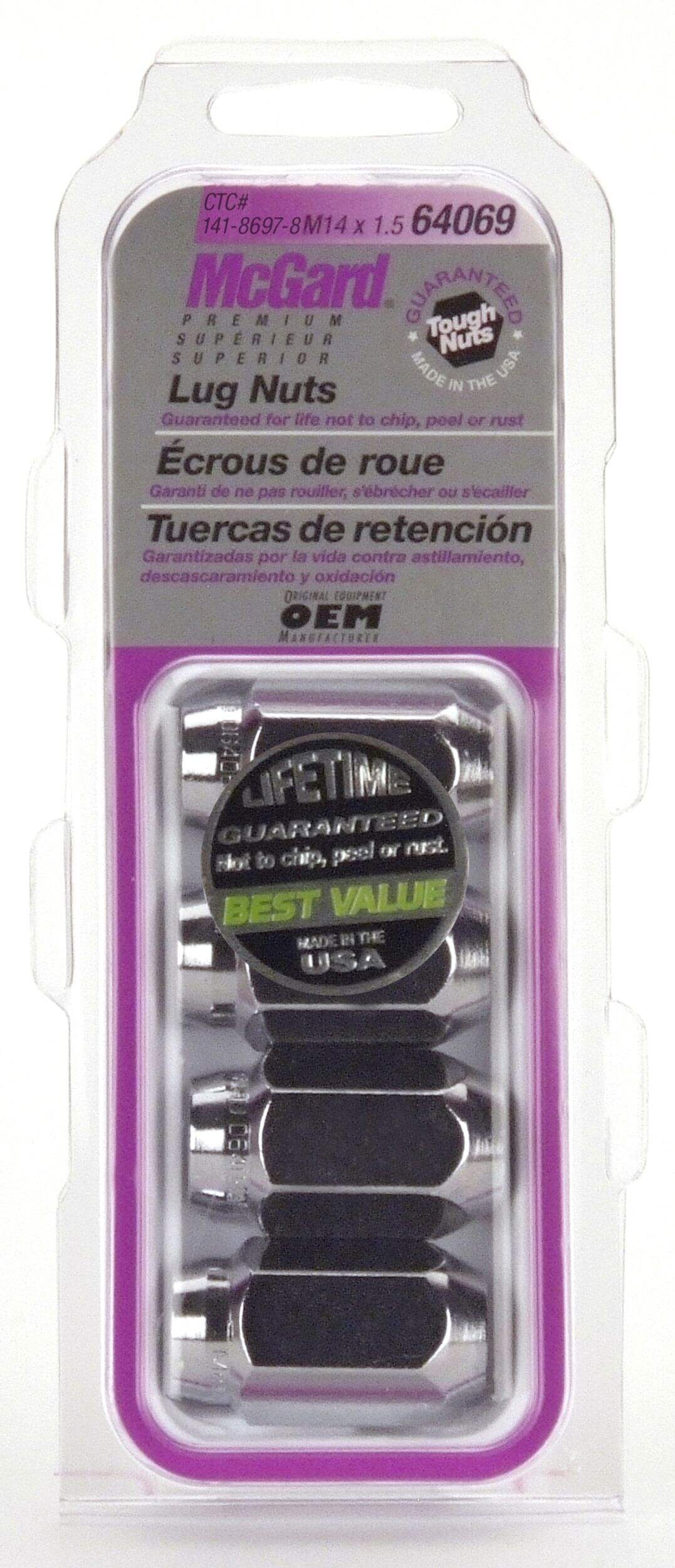 Chrome plated lug nuts lead a tough life.; Think about it, harsh elements, nasty corrosive wheel cleaners and lead-foot drivers.; Not to mention overzealous impact guns and loose fitting lug wrenches.; This kind of treatment destroys ordinary lug nuts which turns even the best looking wheels ugly.; Tough Nuts can take the punishment and keep your wheels looking beautiful.; Tough Nuts are guaranteed for life not to rust, chip or peel.; McGard manufactures lug nuts in the USA to meet or exceed O.E.M.; standards for safety and durability.; Every lug nut is fully machined from restricted chemistry steel made specifically for McGard and through-hardened for its unsurpassed level of safety.; McGard’s plating process includes several layers of nickel and one layer of micro porous chrome producing a superior finish while protecting against rust.; Tough Nuts are designed and built for the real world, because life is tough.; Bulge Style Cone Seat lug nuts have an extended seating surface that is designed to match the wider seating surface used on some aluminum wheels.; For use with steel or aluminum wheels with exposed decorative lug nuts that are tapered at the bottom.; This product may contain globally sourced materials/components.