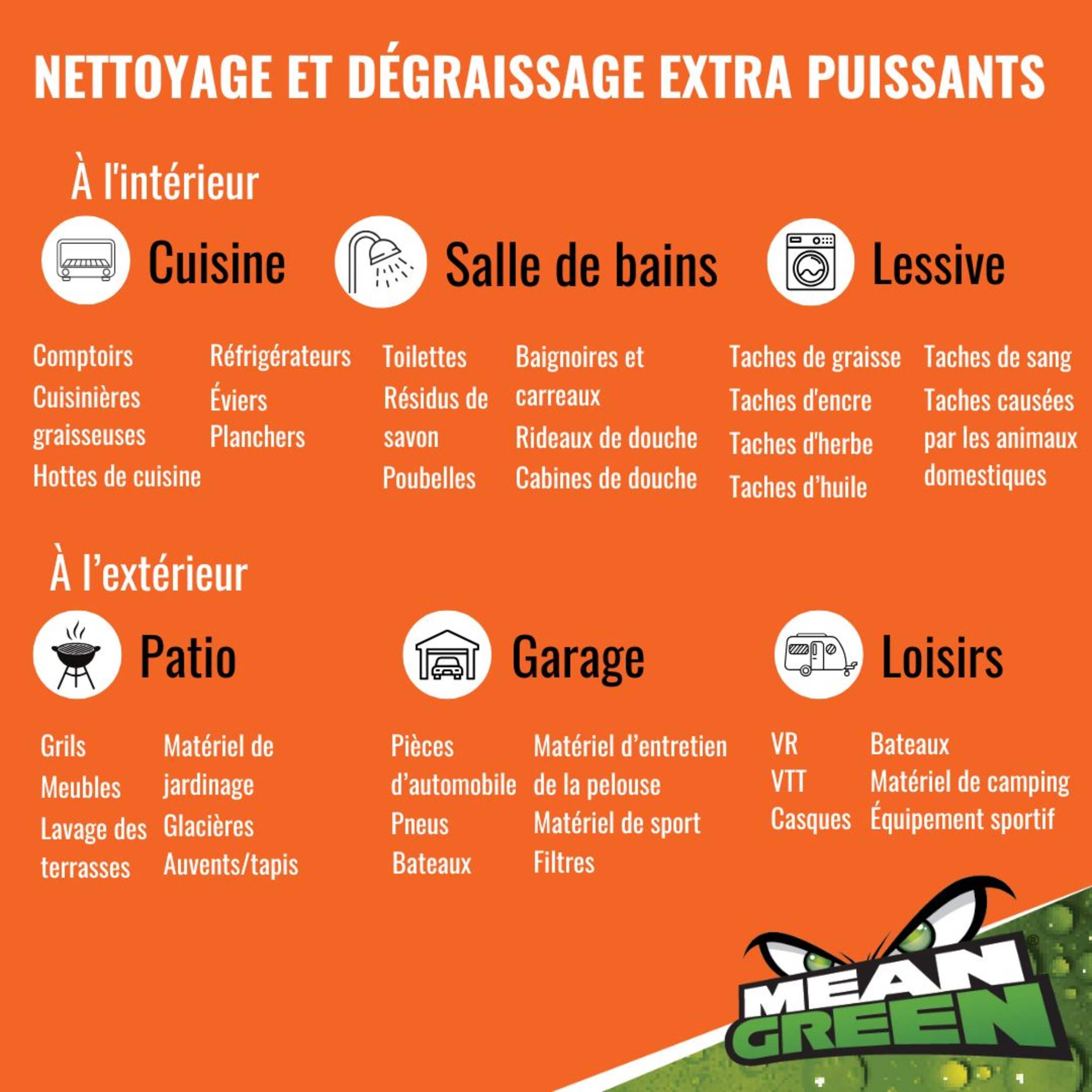 Powerful, multi-purpose cleaner and degreaser that can get grease out and eliminate grime from most surfaces. From fabric to concrete, Mean Green® has been a trusted brand for more than 20 years. It is used to clean just about everything, inside and outside the home, business, garage, restaurant, work or hobby shop.