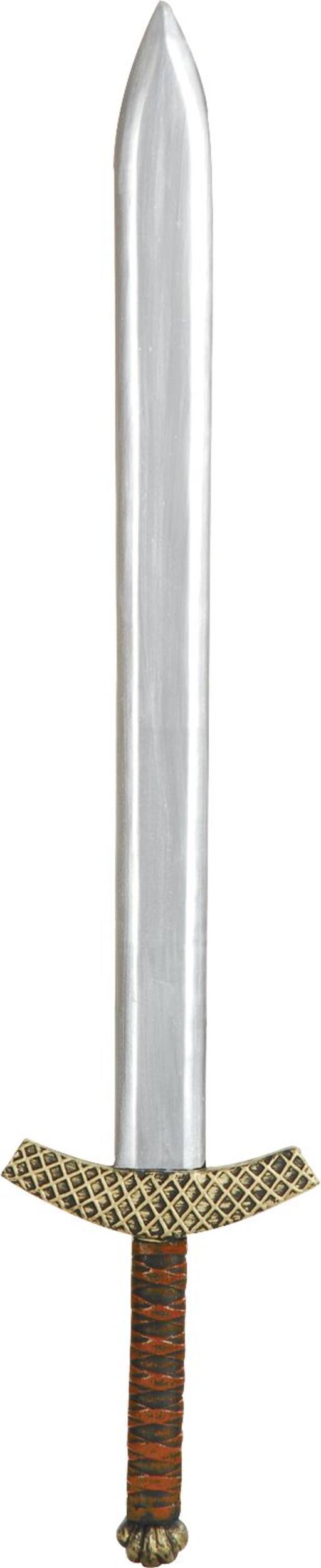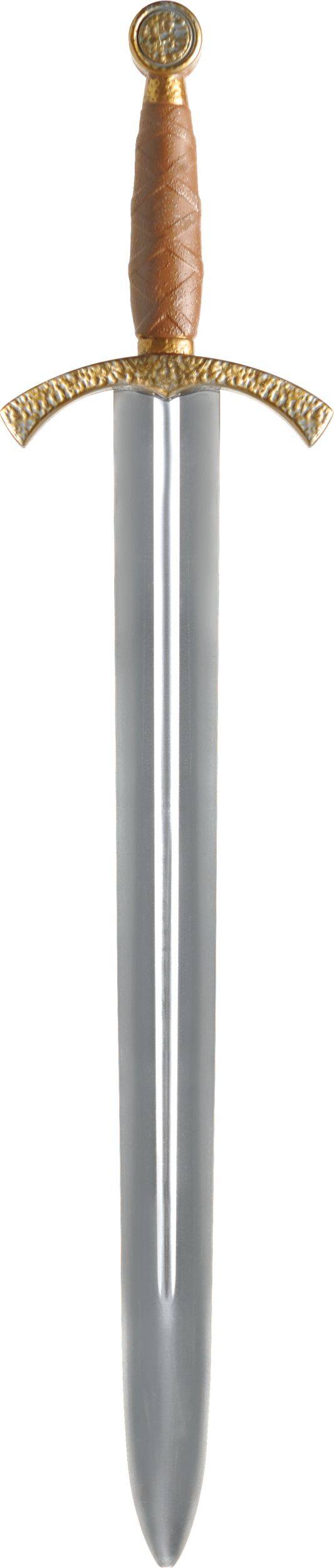 Rule the kingdom with the Knight Halloween Costume Accessories Weapon Broadsword, Teen, Adult, 34-in. This Halloween prop has the utilitarian look of a sword made for combat and not ceremony! The moulded plastic knight sword features a double-edged steel finish straight blade, and a curved golden hilt with a raised diamond pattern. Its handle has a faux banded leather detail to enhance the look and give the sword almost a realistic look. Complete any knight, king, or medieval warrior costume with this Halloween costume accessory. The faux sword measures 34 inches.