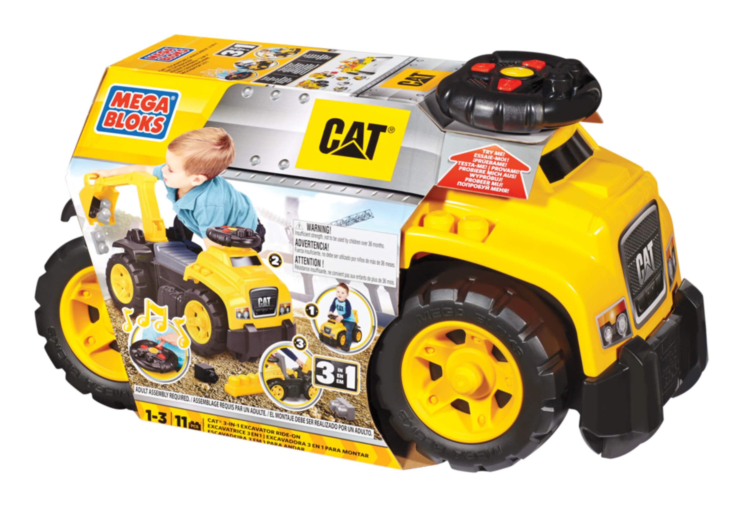 Mega Bloks 3-in-1 CAT® vehicle and building set works as a push car, ride-on, and excavator