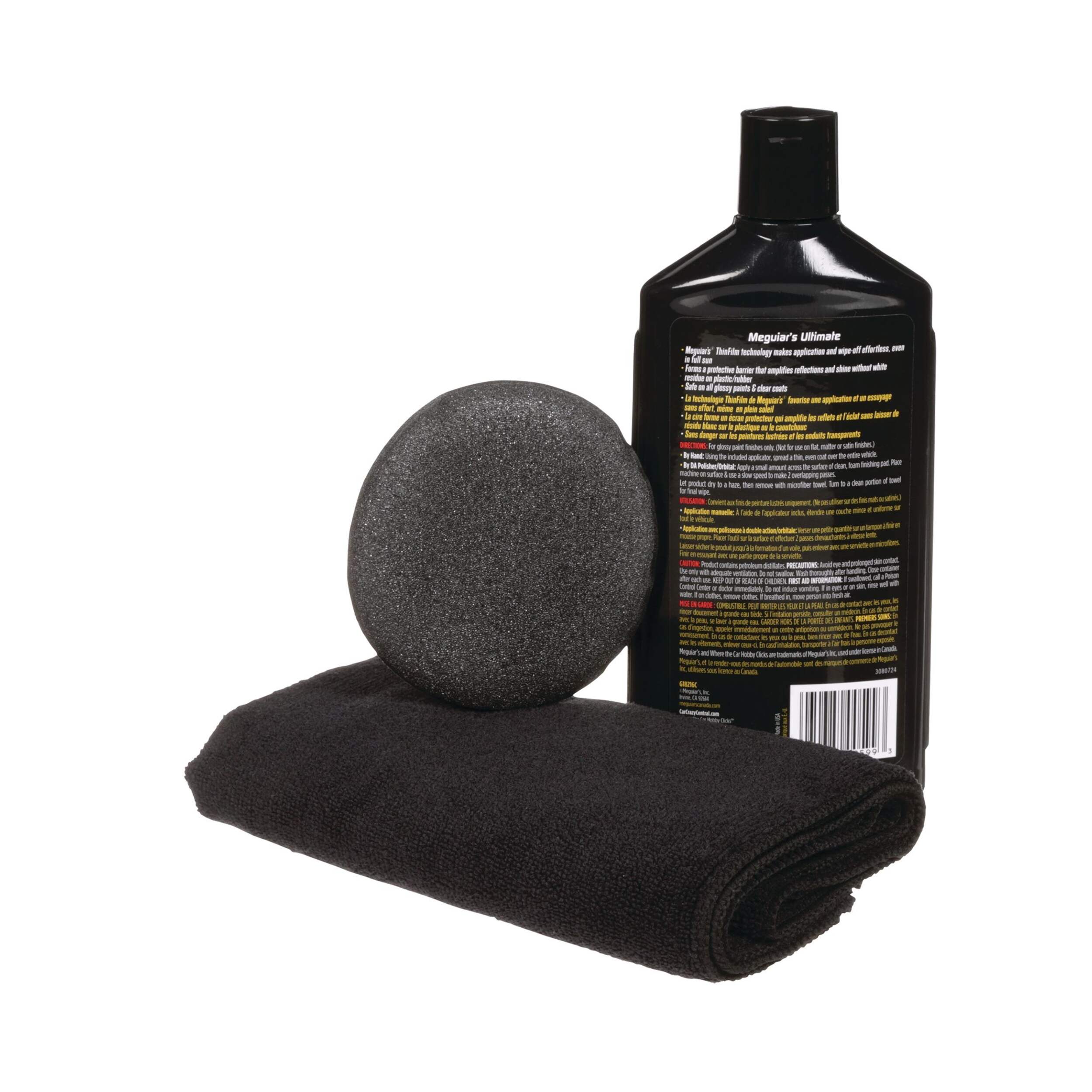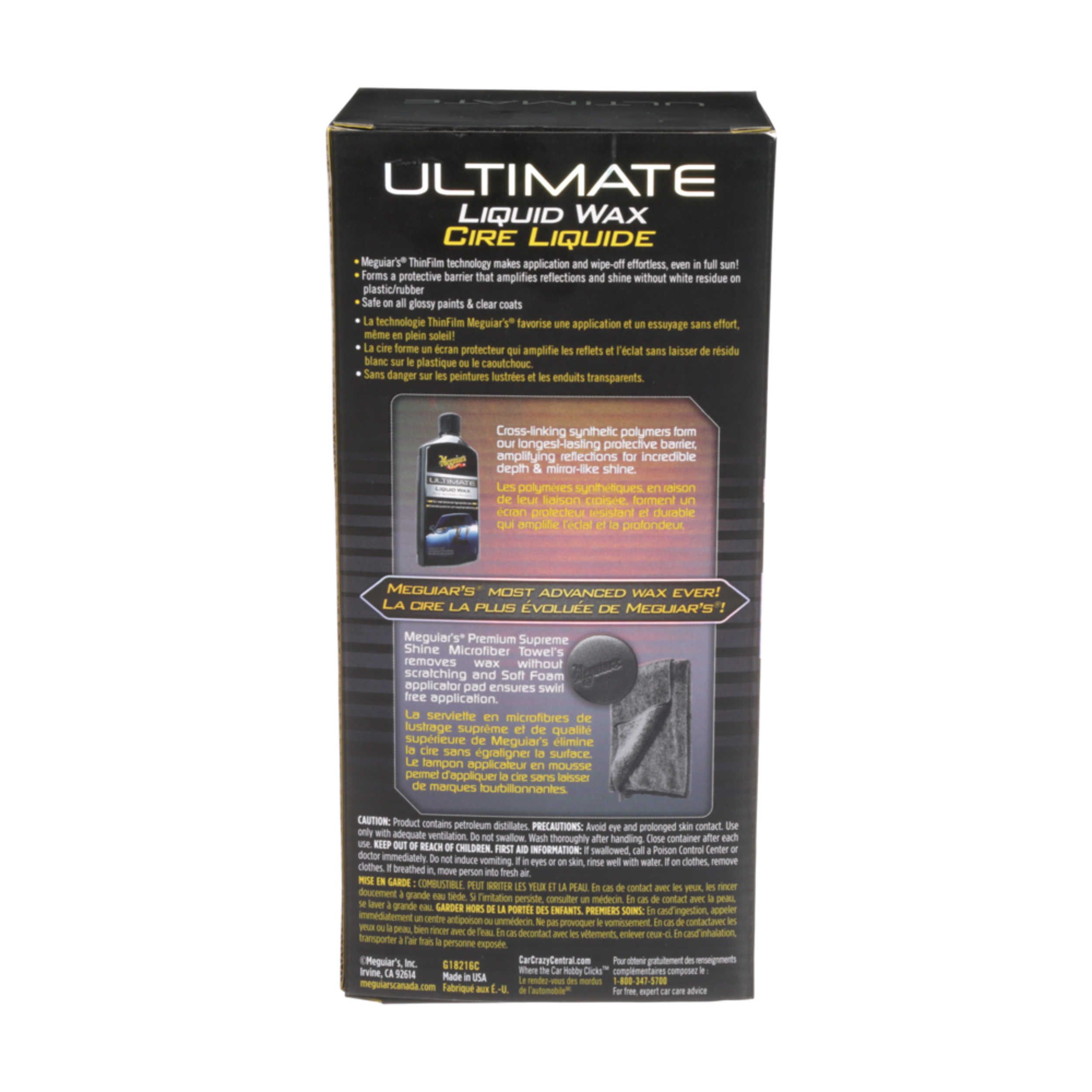 Meguiar’s® Ultimate™ Liquid Wax delivers maximum synthetic protection, durability, depth of colour, and reflectivity in one easy step. It uses Meguiar's® ThinFilm technology to deliver easy application and removal, even if waxing directly in the sun! Meguiar's® proprietary hydrophobic polymer technology increases surface tension, causing the formation of water beads to roll right off. This wax provides extended protection with amplified reflectivity for incredible depth and mirror-like shine without leaving white residue on plastic and rubber surfaces.
